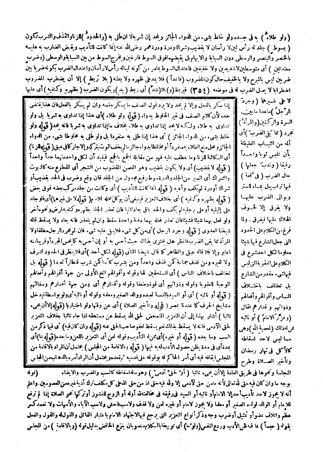 (قَوْلُهُ: لِكُلِّ أَحَدٍ) أَيْ فَلَا يُنْظَرُ فِي الْحُدُودِ لِشَرَفٍ وَلَا لِغَيْرِهِ وَمَنْ قَذَفَ جَمَاعَةً كَمَنْ قَذَفَ وَاحِدًا وَمَنْ يَشْرَبُ كَأْسًا كَمَنْ شَرِبَ قِنْطَارًا تَعَبُّدًا (قَوْلُهُ بَلْ تَخْتَلِفُ بِاخْتِلَافِ النَّاسِ) أَيْ الْمُسْتَحِقِّينَ لَهَا وَقَوْلُهُ وَأَقْوَالِهِمْ إلَخْ الْأَوْلَى مِنْ جِهَةِ أَقْوَالِهِمْ وَأَفْعَالِهِمْ الْمُوجِبَةِ لِلْعُقُوبَةِ وَقَوْلُهُ وَذَوَاتِهِمْ أَيْ قُوَّةً وَضَعْفًا وَقَوْلُهُ وَأَقْدَارِهِمْ أَيْ وَمِنْ جِهَةِ أَقْدَارِهِمْ وَسَفَالَتِهِمْ (قَوْلُهُ: أَوْ نَائِبِهِ) أَيْ أَوْ السَّيِّدِ بِالنِّسْبَةِ لِعَبْدِهِ وَوَالِدِ الصَّغِيرِ وَمُعَلِّمِهِ، وَقَوْلُهُ: أَوْ نَائِبِهِ أَيْ وَلَوْ بِوَاسِطَةٍ فَيَدْخُلُ مَشَايِخُ الْحِرَفِ كَمَا عِنْدَنَا بِمِصْرَ (قَوْلُهُ: وَتَأْخِيرِ الصَّلَاةِ) أَيْ عَنْ وَقْتِهَا وَلَوْ اخْتِيَارِيًّا (قَوْلُهُ: إلَّا أَنْ يَجِيءَ تَائِبًا) أَشَارَ بِهَذَا إلَى أَنَّ التَّعْزِيرَ الْمُتَمَحِّضَ لِحَقِّ اللَّهِ يَسْقُطُ عَنْ مُسْتَحِقِّهِ إذَا جَاءَ تَائِبًا بِخِلَافِ التَّعْزِيرِ لِحَقِّ الْآدَمِيِّ، فَإِنَّهُ لَا يَسْقُطُ بِذَلِكَ نَعَمْ يَسْقُطُ لِعَفْوِ صَاحِبِ الْحَقِّ عَنْهُ (قَوْلُهُ: وَإِنْ كَانَ فِيهِ) أَيْ فِيمَا ذَكَرَ مِنْ السَّبِّ وَمَا بَعْدَهُ (قَوْلُهُ: أَوْ غَيْرِهِ) أَيْ مِمَّنْ لَهُ التَّأْدِيبُ وَقَوْلُهُ: لَعْنُ أَيْ التَّعْزِيرُ بِاللَّعْنِ وَمَا بَعْدَهُ (قَوْلُهُ: بِمَا) أَيْ بِمُدَّةٍ أَيْ فِي مُدَّةٍ يَظُنُّ حُصُولَ الْأَدَبِ لَهُ بِهِ فِيهَا (قَوْلُهُ وَبِالْإِقَامَةِ مِنْ الْمَجْلِسِ) يَحْتَمِلُ أَنَّ الْمُرَادَ بِالْإِقَامَةِ مِنْ الْمَجْلِسِ إيقَافُهُ فِيهِ أَيْ أَمْرُ الْحَاكِمِ لَهُ بِوُقُوفِهِ عَلَى قَدَمَيْهِ ثُمَّ يُقْعِدُهُ وَيُحْتَمَلُ أَنَّ الْمُرَادَ أَمْرُهُ بِالذَّهَابِ مِنْ الْمَجْلِسِ