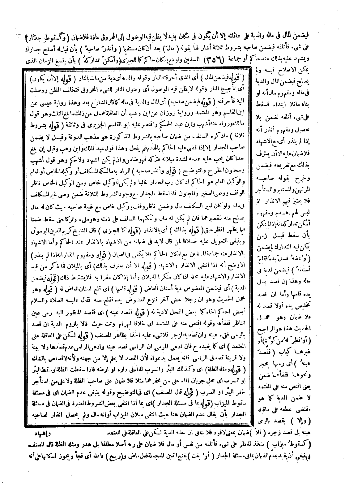 ـــــــــــــــــــــــــــــQقَوْلُهُ: فَيَضْمَنُ الْمَالَ) أَيْ الَّذِي أَحْرَقَتْهُ النَّارُ وَقَوْلُهُ وَالدِّيَةُ أَيْ دِيَةُ مَنْ مَاتَ بِالنَّارِ (قَوْلُهُ إلَّا أَنْ يَكُونَ) أَيْ تَأْجِيجُ النَّارِ وَقَوْلُهُ لَا يَظُنُّ فِيهِ الْوُصُولَ أَيْ وُصُولَ النَّارِ لِلشَّيْءِ الْمَحْرُوقِ فَتَخَلَّفَ الظَّنُّ وَوَصَلَتْ إلَيْهِ فَأَحْرَقَتْهُ (قَوْلُهُ: فَيَضْمَنُ صَاحِبَهُ) أَيْ الْمَالِ وَالدِّيَةُ فِي مَالِهِ كَمَا قَالَ الشَّارِحُ بَعْدُ وَهَذَا رِوَايَةُ عِيسَى عَنْ ابْنِ الْقَاسِمِ وَهُوَ الْمُعْتَمَدُ وَرِوَايَةُ زوزان عَنْ ابْنِ وَهْبٍ أَنَّ الْعَاقِلَةَ تَحْمَلُ مِنْ ذَلِكَ مَا بَلَغَ الثُّلُثَ وَهُوَ قَوْلُ مَالِكٍ وَرَوَاهُ عَنْهُ أَشْهَبُ وَابْنُ عَبْدِ الْحَكَمِ وَاقْتَصَرَ عَلَيْهِ أَبُو الْقَاسِمِ الْجَزِيرِيُّ فِي وَثَائِقِهِ (قَوْلُهُ: بِشُرُوطٍ ثَلَاثَةٍ) مَا ذَكَرَهُ الْمُصَنِّفُ مِنْ ضَمَانِ صَاحِبِهِ بِالشُّرُوطِ الْمَذْكُورَةِ هُوَ مَذْهَبُ الْمُدَوَّنَةِ وَقِيلَ: لَا يَضْمَنُ صَاحِبُ الْجِدَارِ إلَّا إذَا قَضَى عَلَيْهِ الْحَاكِمُ بِالْهَدْمِ فَلَمْ يَفْعَلْ وَهَذَا قَوْلُ عَبْدِ الْمَلِكِ وَابْنِ وَهْبٍ وَقِيلَ: إنْ بَلَغَ حَدًّا كَانَ يَجِبُ عَلَيْهِ عَدَمُهُ لِشِدَّةِ مَيَلَانِهِ فَتَرَكَهُ فَهُوَ ضَامِنٌ وَإِنْ لَمْ يَكُنْ إشْهَادٌ وَلَا حُكْمٌ وَهُوَ قَوْلُ أَشْهَبَ وَسَحْنُونٍ اُنْظُرْ ح وَالتَّوْضِيحَ (قَوْلُهُ: وَأَنْذَرَ صَاحِبَهُ) الْمُرَادُ بِهِ مَالِكَهُ الْمُكَلَّفَ أَوْ وَكِيلَهُ الْخَاصَّ أَوْ الْعَامَّ، وَالْوَكِيلُ الْعَامُّ هُوَ الْحَاكِمُ إذْ كَانَ رَبُّ الْجِدَارِ غَائِبًا وَلَمْ يَكُنْ لَهُ وَكِيلٌ خَاصٌّ وَمِنْ الْوَكِيلِ الْخَاصِّ نَاظِرُ الْوَقْفِ وَوَصِيُّ الصَّغِيرِ وَالْمَجْنُونِ، فَإِذَا سَقَطَ الْجِدَارُ مَعَ وُجُودِ الشُّرُوطِ الثَّلَاثَةِ ضَمِنَ وَصِيُّ غَيْرِ الْمُكَلَّفِ فِي مَالِهِ وَلَوْ كَانَ لِغَيْرِ الْمُكَلَّفِ مَالٌ وَضَمِنَ نَاظِرُ وَقْفٍ وَوَكِيلٌ خَاصٌّ مَعَ غَيْبَةِ صَاحِبِهِ حَيْثُ كَانَ لَهُ مَالٌ يَصْلُحُ مِنْهُ لِتَقْصِيرِهِمَا، فَإِنْ لَمْ يَكُنْ لَهُ مَالٌ وَأَمْكَنَهُمَا السَّلَفُ عَلَى ذِمَّتِهِ وَهُوَ مَلِيءٌ وَتَرَكَا حَتَّى سَقَطَ ضِمْنًا فِيمَا يَظْهَرُ اُنْظُرْ عبق (قَوْلُهُ: بِذَلِكَ) أَيْ بِالْإِنْذَارِ (قَوْلُهُ كَمَا لِلْجِيزِيِّ) قَالَ الشَّيْخُ كَرِيمُ الدِّينِ الْبَرْمُونِيُّ وَيَنْبَغِي التَّعْوِيلُ عَلَيْهِ خِلَافًا لِمَنْ قَالَ لَا بُدَّ فِي ضَمَانِهِ مِنْ الْإِشْهَادِ بِالْإِنْذَارِ عِنْدَ الْحَاكِمِ وَأَمَّا الْإِشْهَادُ بِالْإِنْذَارِ عِنْدَ جَمَاعَةِ الْمُسْلِمِينَ مَعَ إمْكَانِ الْحَاكِمِ فَلَا يَكْفِي فِي الضَّمَانِ (قَوْلُهُ: وَمَفْهُومُ أَنْذَرَ أَنَّهُ إذَا لَمْ يُنْذِرْ) الْأَوْضَحُ أَنَّهُ إذَا انْتَفَى الْإِنْذَارُ وَالْإِشْهَادُ.