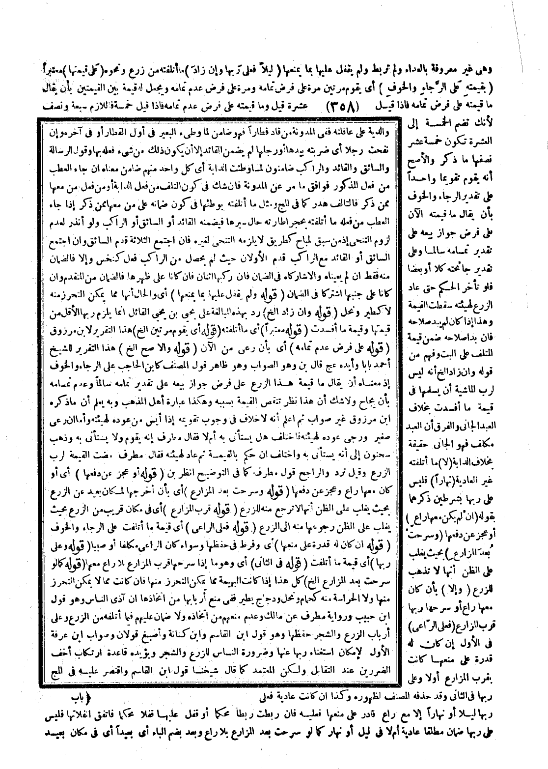 وَهِيَ غَيْرُ مَعْرُوفَةٍ بِالْعَدَاءِ وَلَمْ تُرْبَطْ وَلَمْ يُقْفَلْ عَلَيْهَا بِمَا يَمْنَعُهَا (لَيْلًا) (فَعَلَى رَبِّهَا، وَإِنْ زَادَ) مَا أَتْلَفَتْهُ مِنْ زَرْعٍ وَنَحْوِهِ (عَلَى قِيمَتِهَا) مُعْتَبَرًا (بِقِيمَتِهِ عَلَى الرَّجَاءِ وَالْخَوْفِ) أَيْ يَقُومُ مَرَّتَيْنِ مَرَّةً عَلَى فَرْضِ تَمَامِهِ وَمَرَّةً عَلَى فَرْضِ عَدَمِ تَمَامِهِ وَيُجْعَلُ لَهُ قِيمَةٌ بَيْنَ الْقِيمَتَيْنِ بِأَنْ يُقَالَ مَا قِيمَتُهُ عَلَى فَرْضِ تَمَامِهِ فَإِذَا قِيلَ عَشْرَةٌ قِيلَ وَمَا قِيمَتُهُ عَلَى فَرْضِ عَدَمِ تَمَامِهِ، فَإِذَا قِيلَ خَمْسَةٌ فَاللَّازِمُ سَبْعَةٌ وَنِصْفٌ؛ لِأَنَّك تَضُمُّ الْخَمْسَةَ إلَى الْعَشَرَةِ تَكُونُ خَمْسَةَ عَشَرَ نِصْفُهَا مَا ذَكَرَ وَالْأَصَحُّ أَنَّهُ يُقَوَّمُ تَقْوِيمًا وَاحِدًا عَلَى تَقْدِيرِ الرَّجَاءِ وَالْخَوْفِ بِأَنْ يُقَالَ مَا قِيمَتُهُ الْآنَ عَلَى فَرْضِ جَوَازِ بَيْعِهِ عَلَى تَقْدِيرِ تَمَامِهِ سَالِمًا وَعَلَى تَقْدِيرِ جَائِحَتِهِ كُلًّا أَوْ بَعْضًا فَلَوْ تَأَخَّرَ الْحُكْمُ حَتَّى عَادَ الزَّرْعُ لِهَيْئَتِهِ سَقَطَتْ الْقِيمَةُ وَهَذَا إذَا كَانَ لَمْ يَبْدُ صَلَاحُهُ، فَإِنْ بَدَا صَلَاحُهُ ضَمِنَ قِيمَةَ الْمُتْلَفِ عَلَى الْبَتِّ وَفُهِمَ مِنْ قَوْلِهِ، وَإِنْ زَادَ إلَخْ أَنَّهُ لَيْسَ لِرَبِّ الْمَاشِيَةِ أَنْ يُسَلِّمَهَا فِي قِيمَةِ مَا أَفْسَدَتْ بِخِلَافِ الْعَبْدِ الْجَانِي، وَالْفَرْقُ أَنَّ الْعَبْدَ مُكَلَّفٌ فَهُوَ الْجَانِي حَقِيقَةً بِخِلَافِ الدَّابَّةِ (لَا) مَا أَتْلَفَتْهُ غَيْرُ الْعَادِيَةِ (نَهَارًا) فَلَيْسَ عَلَى رَبِّهَا بِشَرْطَيْنِ ذَكَرَهُمَا بِقَوْلِهِ (إنْ لَمْ يَكُنْ مَعَهَا رَاعٍ) أَوْ عَجَزَ عَنْ دَفْعِهَا (وَسَرَحَتْ بُعْدَ الْمَزَارِعِ) بِحَيْثُ يَغْلِبُ عَلَى الظَّنِّ أَنَّهَا لَا تَذْهَبُ لِلزَّرْعِ (وَإِلَّا) بِأَنْ كَانَ مَعَهَا رَاعٍ أَوْ سَرَّحَهَا رَبُّهَا قُرْبَ الْمَزَارِعِ (فَعَلَى الرَّاعِي) فِي الْأَوَّلِ إنْ كَانَ لَهُ قُدْرَةٌ عَلَى مَنْعِهَا كَانَتْ بِقُرْبِ الْمَزَارِعِ أَوْ لَا وَعَلَى رَبِّهَا فِي الثَّانِي وَقَدْ حَذَفَهُ الْمُصَنِّفُ لِظُهُورِهِ وَكَذَا إنْ كَانَتْ عَادِيَةً فَعَلَى رَبِّهَا لَيْلًا أَوْ نَهَارًا إلَّا مَعَ رَاعٍ قَادِرٍ عَلَى مَنْعِهَا فَعَلَيْهِ، فَإِنْ رُبِطَتْ رَبْطًا مُحْكَمًا أَوْ قُفِلَ عَلَيْهَا قَفْلًا مُحْكَمًا فَاتَّفَقَ انْفِلَاتُهَا فَلَيْسَ عَلَى رَبِّهَا ضَمَانٌ مُطْلَقًا عَادِيَةً أَمْ لَا فِي لَيْلٍ أَوْ نَهَارٍ كَمَا لَوْ سَرَحَتْ بُعْدَ الْمَزَارِعِ بِلَا رَاعٍ وَبُعْدَ بِضَمِّ الْبَاءِ أَيْ بَعِيدًا أَيْ فِي مَكَان بَعِيدٍ
