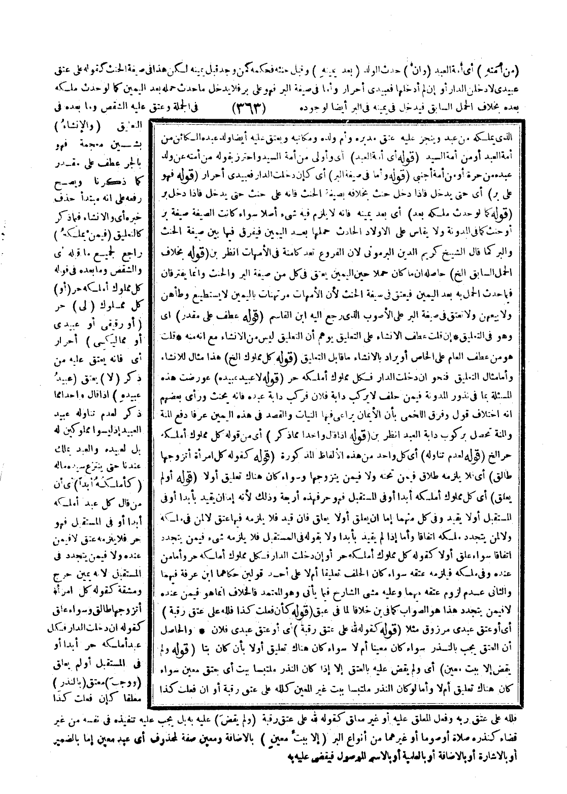 ـــــــــــــــــــــــــــــQالَّذِي يَمْلِكُهُ مِنْ عَبْدٍ وَيُنَجَّزُ عَلَيْهِ عِتْقُ مُدَبَّرِهِ وَأُمِّ وَلَدِهِ وَمُكَاتَبِهِ وَيَعْتِقُ عَلَيْهِ أَيْضًا وَلَدُ عَبْدِهِ الْكَائِنُ مِنْ أَمَةِ الْعَبْدِ أَوْ مِنْ أَمَةِ السَّيِّدِ (قَوْلُهُ: أَيْ أَمَةِ الْعَبْدِ) أَيْ وَأَوْلَى مِنْ أَمَةِ السَّيِّدِ وَاحْتَرَزَ بِقَوْلِهِ مِنْ أَمَتِهِ عَنْ وَلَدِ عَبْدِهِ مِنْ حُرَّةٍ أَوْ مِنْ أَمَةِ أَجْنَبِيٍّ (قَوْلُهُ: وَأَمَّا فِي صِيغَةِ الْبِرِّ) أَيْ كَإِنْ دَخَلْتُ الدَّارَ فَعَبِيدِي أَحْرَارٌ (قَوْلُهُ: فَهُوَ عَلَى بِرٍّ) أَيْ حَتَّى يَدْخُلَ، فَإِذَا دَخَلَ حَنِثَ بِخِلَافِهِ بِصِيغَةِ الْحِنْثِ، فَإِنَّهُ عَلَى حِنْثٍ حَتَّى يَدْخُلَ، فَإِذَا دَخَلَ بَرَّ (قَوْلُهُ: كَمَا لَوْ حَدَثَ مِلْكُهُ بَعْدُ) أَيْ بَعْدَ يَمِينِهِ، فَإِنَّهُ لَا يَلْزَمُ فِيهِ شَيْءٌ أَصْلًا سَوَاءٌ كَانَتْ الصِّيغَةُ صِيغَةَ بِرٍّ أَوْ حِنْثٍ كَمَا فِي الْمُدَوَّنَةِ وَلَا يُقَاسُ عَلَى الْأَوْلَادِ الْحَادِثُ حَمْلُهَا بَعْدَ الْيَمِينِ فَيُفَرَّقُ فِيهَا بَيْنَ صِيغَةِ الْحِنْثِ وَالْبِرِّ كَمَا قَالَ الشَّيْخُ كَرِيمُ الدِّينِ الْبَرْمُونِيُّ؛ لِأَنَّ الْفُرُوعَ تُعَدُّ كَامِنَةً فِي الْأُمَّهَاتِ اُنْظُرْ بْن.