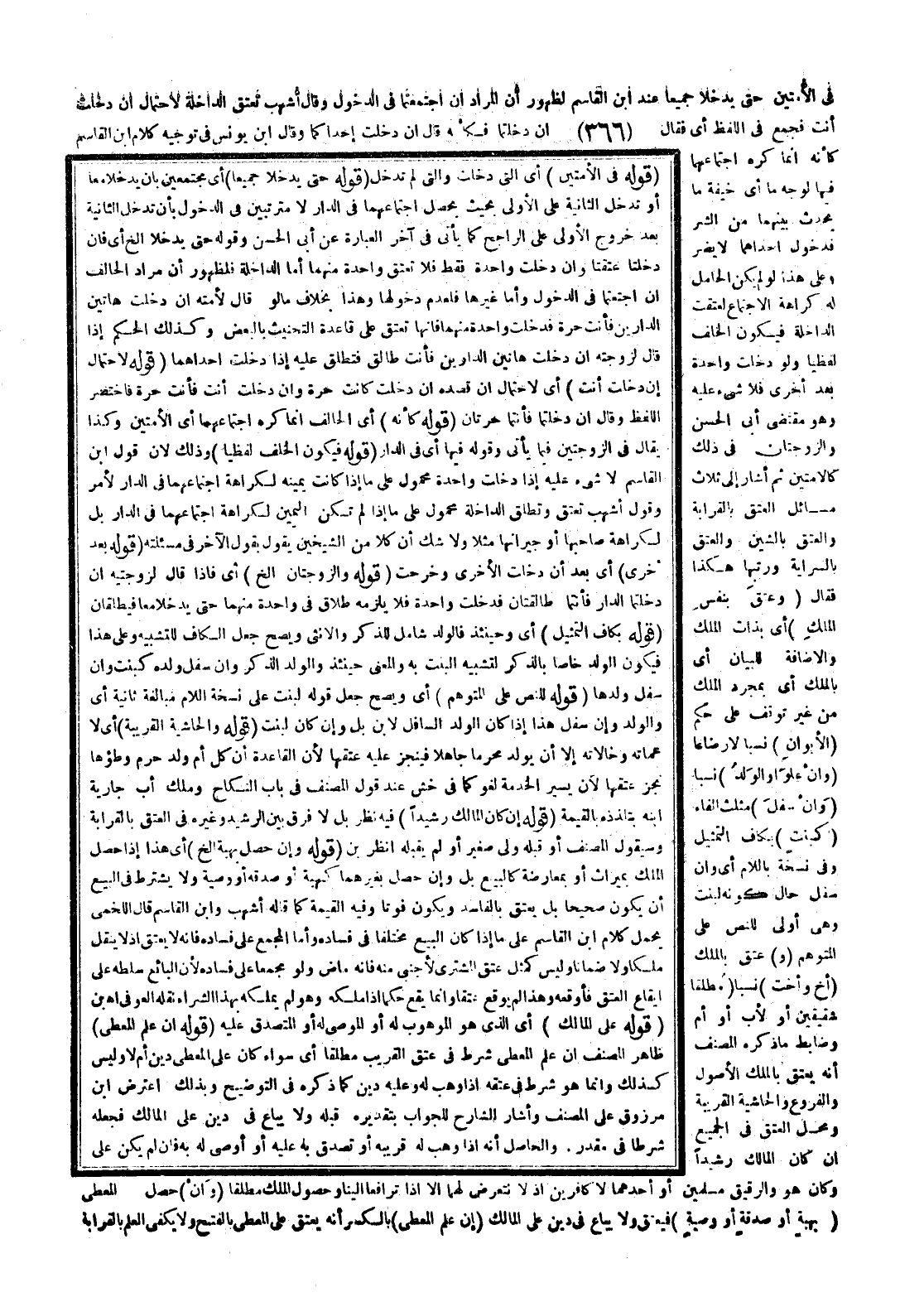 فِي الْأَمَتَيْنِ حَتَّى يَدْخُلَا جَمِيعًا عِنْدَ ابْنِ الْقَاسِمِ لِظُهُورِ أَنَّ الْمُرَادَ إنْ اجْتَمَعَتَا فِي الدُّخُولِ وَقَالَ أَشْهَبُ تَعْتِقُ الدَّاخِلَةُ لِاحْتِمَالِ إنْ دَخَلْت أَنْتَ فَجَمَعَ فِي اللَّفْظِ أَيْ فَقَالَ: إنْ دَخَلْتُمَا فَكَأَنَّهُ قَالَ إنْ دَخَلَتْ إحْدَاكُمَا وَقَالَ ابْنُ يُونُسَ فِي تَوْجِيهِ كَلَامِ ابْنِ الْقَاسِمِ كَأَنَّهُ إنَّمَا كَرِهَ اجْتِمَاعَهُمَا فِيهَا لِوَجْهٍ مَا أَيْ خِيفَةَ مَا يَحْدُثُ بَيْنَهُمَا مِنْ الشَّرِّ فَدُخُولُ إحْدَاهُمَا لَا يَضُرُّ وَعَلَى هَذَا لَوْ لَمْ يَكُنْ الْحَامِلُ لَهُ كَرَاهَةَ الِاجْتِمَاعِ لَعَتَقَتْ الدَّاخِلَةُ فَيَكُونُ مُعْسَرًا لَفْظِيًّا وَلَوْ دَخَلَتْ وَاحِدَةٌ بَعْدَ أُخْرَى فَلَا شَيْءَ عَلَيْهِ وَهُوَ مُقْتَضَى أَبِي الْحَسَنِ وَالزَّوْجَتَانِ فِي ذَلِكَ كَالْأَمَتَيْنِ