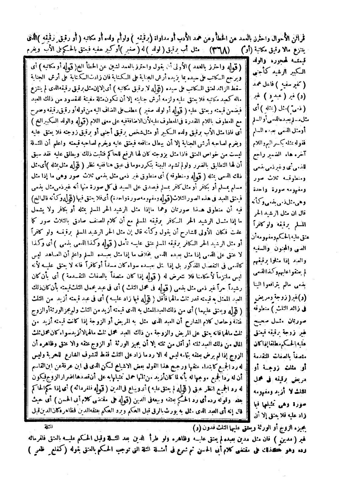 قَرَائِنُ الْأَحْوَالِ وَاحْتَرَزَ بِالْعَمْدِ عَنْ الْخَطَأِ وَعَنْ عَمْدِ الْأَدَبِ أَوْ مُدَاوَاةِ (بِرَقِيقِهِ) وَلَوْ أُمَّ وَلَدِهِ أَوْ مُكَاتَبَهُ (أَوْ رَقِيقِ رَقِيقِهِ) الَّذِي يَنْتَزِعُ مَالًا رَقِيقَ مُكَاتَبَةٍ (أَوْ) مِثْلَ أَبٍ بِرَقِيقٍ (لِوَلَدٍ) لَهُ (صَغِيرٍ) أَوْ كَبِيرٍ سَفِيهٍ فَيَعْتِقُ بِالْحُكْمِ عَلَى الْأَبِ وَيَغْرَمُ قِيمَتَهُ لِمَحْجُورِهِ وَالْوَلَدُ الْكَبِيرُ الرَّشِيدُ كَأَجْنَبِيٍّ (غَيْرُ سَفِيهٍ) فَاعِلُ عَمَدَ (وَ) غَيْرُ (عَبْدٍ وَ) غَيْرُ (ذِمِّيٍّ) مِثْلٌ (بِمِثْلِهِ) أَيْ مِثْلُ مُسْلِمٍ بِعَبْدِهِ الذِّمِّيِّ أَوْ الْمُسْلِمِ أَوْ مِثْلُ الذِّمِّيِّ بِعَبْدِهِ الْمُسْلِمِ فَقَوْلُهُ بِمِثْلِهِ بِكَسْرِ الْمِيمِ وَاللَّامِ آخِرُهُ هَاءُ الضَّمِيرِ رَاجِعٌ لِلذِّمِّيِّ أَيْ وَغَيْرُ ذِمِّيٍّ بِذِمِّيٍّ وَمَنْطُوقُهُ ثَلَاثُ صُوَرٍ وَمَفْهُومُهُ صُورَةٌ وَاحِدَةٌ وَهِيَ مِثْلُ ذِمِّيٍّ بِذِمِّيٍّ وَكَأَنَّهُ قَالَ: إنَّ مِثْلَ الرَّشِيدِ الْحُرِّ الْمُسْلِمِ بِرَقِيقِهِ وَلَوْ كَافِرًا عَتَقَ عَلَيْهِ بِالْحُكْمِ وَمَفْهُومُهُ أَنَّ الصَّبِيَّ وَالْمَجْنُونَ وَالسَّفِيهَ وَالْعَبْدَ إذَا مَثَّلُوا بِرَقِيقِهِمْ لَمْ يَعْتِقُوا عَلَيْهِمْ وَكَذَا الذِّمِّيُّ بِذِمِّيٍّ مَا لَمْ يَتَرَافَعُوا إلَيْنَا (وَ) غَيْرُ (زَوْجَةٍ وَمَرِيضٍ فِي زَائِدِ الثُّلُثِ) مَنْطُوقُهُ صُورَتَانِ مِثْلُ صَحِيحِ غَيْرِ زَوْجَةٍ بِرَقِيقِهِ فَيَعْتِقُ عَلَيْهِ بِالْحُكْمِ مُطْلَقًا إذَا كَانَ مُتَّصِفًا بِالصِّفَاتِ الْمُتَقَدِّمَةِ أَوْ مَثَّلَتْ زَوْجَةٌ أَوْ مَرِيضٌ بِرَقِيقِهِ فِي مَحْمَلِ الثُّلُثِ لَا أَزْيَدَ وَمَفْهُومُهُ صُورَةً وَهِيَ تَمْثِيلُهَا فِيمَا زَادَ عَلَيْهِ فَلَا يَعْتِقُ إلَّا أَنْ يُجِيزَهُ الزَّوْجُ أَوْ الْوَرَثَةُ وَيَعْتِقُ عَلَيْهِمَا الثُّلُثُ فَدُونَ (وَ) غَيْرُ (مَدِينٍ) ، فَإِنْ مَثَّلَ مَدِينٍ بِعَبْدِهِ لَمْ يَعْتِقْ عَلَيْهِ وَظَاهِرُهُ وَلَوْ طَرَأَ الدَّيْنُ بَعْدَ الْمُثْلَةِ وَقَبْلَ الْحُكْمِ عَلَيْهِ بِالْعِتْقِ فَلِغُرَمَائِهِ رَدُّهُ وَهُوَ كَذَلِكَ عَلَى مُقْتَضَى كَلَامِ أَبِي الْحَسَنِ