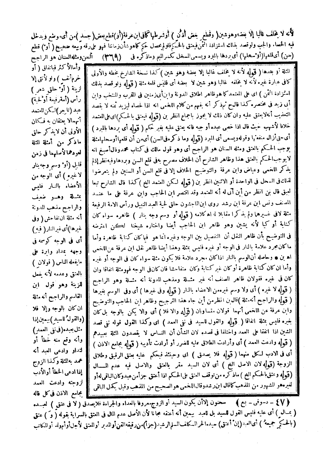 وَأَمَّا الْأَكْثَرُ فَبِاتِّفَاقٍ (أَوْ خَرْمِ أَنْفٍ) وَلَوْ لِأُنْثَى إلَّا لِزِينَةٍ (أَوْ حَلْقِ شَعْرِ) رَأْسِ (أَمَةٍ رَفِيعَةٍ أَوْ لِحْيَةِ) عَبْدٍ (تَاجِرٍ) لَكِنَّ الْمُعْتَمَدَ أَنَّهُمَا لَا يَعْتِقَانِ بِهِ فَكَانَ الْأَوْلَى أَنْ لَا يَذْكُرَ حَلْقَ مَا ذَكَرَ مِنْ أَمْثِلَةِ الْمُثْلَةِ لِعَوْدِهِمَا لِأَصْلِهِمَا فِي زَمَنٍ قَلِيلٍ (أَوْ وَسْمِ وَجْهٍ بِنَارٍ لَا غَيْرِهِ) أَيْ الْوَجْهِ مِنْ الْأَعْضَاءِ بِالنَّارِ فَلَيْسَ بِمُثْلَةٍ وَهُوَ ضَعِيفٌ وَالرَّاجِحُ مَذْهَبُ الْمُدَوَّنَةِ أَنَّهُ مُثْلَةٌ إنْ تَفَاحَشَ (وَفِي غَيْرِهَا) أَيْ غَيْرِ النَّارِ (فِيهِ) أَيْ فِي الْوَجْهِ كَوَسْمِهِ فِي وَجْهِهِ بِمِدَادٍ وَإِبْرَةٍ عَلَى مَا يَفْعَلُهُ النَّاسُ (قَوْلَانِ) بِالْعِتْقِ وَعَدَمِهِ؛ لِأَنَّهُ يُفْعَلُ لِلزِّينَةِ وَهُوَ قَوْلُ ابْنِ الْقَاسِمِ وَالرَّاجِحُ أَنَّهُ مُثْلَةٌ إنْ كَانَ بِالْوَجْهِ وَإِلَّا فَلَا (وَالْقَوْلُ لِلسَّيِّدِ) بِيَمِينٍ إذَا مَثَّلَ بِعَبْدِهِ (فِي نَفْيِ الْعَمْدِ) وَأَنَّهُ وَقَعَ مِنْهُ خَطَأً أَوْ لِتَدَاوٍ وَادَّعَى الْعَبْدُ أَنَّهُ عَمْدٌ بِهِ بِالْمُثْلَةِ وَكَذَا الزَّوْجُ إذَا ادَّعَى الْخَطَأَ أَوْ الْأَدَبَ لِزَوْجَتِهِ وَادَّعَتْ الْعَمْدَ بِجَامِعِ الْأُذُنِ فِي كُلٍّ قَالَهُ سَحْنُونٌ إلَّا أَنْ يَكُونَ السَّيِّدُ أَوْ الزَّوْجُ مَعْرُوفًا بِالْعَدَاءِ وَالْجَرَاءَةِ فَلَا يَصْدُقُ (لَا فِي عِتْقٍ) لِعَبْدِهِ (بِمَالٍ) أَيْ عَلَيْهِ فَلَيْسَ الْقَوْلُ لِلسَّيِّدِ بَلْ لِلْعَبْدِ بِيَمِينٍ أَنَّهُ أَعْتَقَهُ مَجَّانًا؛ لِأَنَّ الْأَصْلَ عَدَمُ الْمَالِ