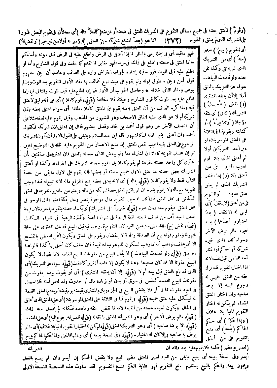 (وَقُوِّمَ) الْمُعْتَقُ بَعْضُهُ فِي جَمِيعِ مَسَائِلِ التَّقْوِيمِ عَلَى الشَّرِيكِ الْمُعْتِقِ فِي صِحَّتِهِ أَوْ مَرَضِهِ (كَامِلًا بِمَالِهِ) أَيْ مَعَهُ؛ لِأَنَّ فِي تَقْوِيمِ الْبَعْضِ ضَرَرًا عَلَى الشَّرِيكِ الَّذِي لَمْ يَعْتِقْ.