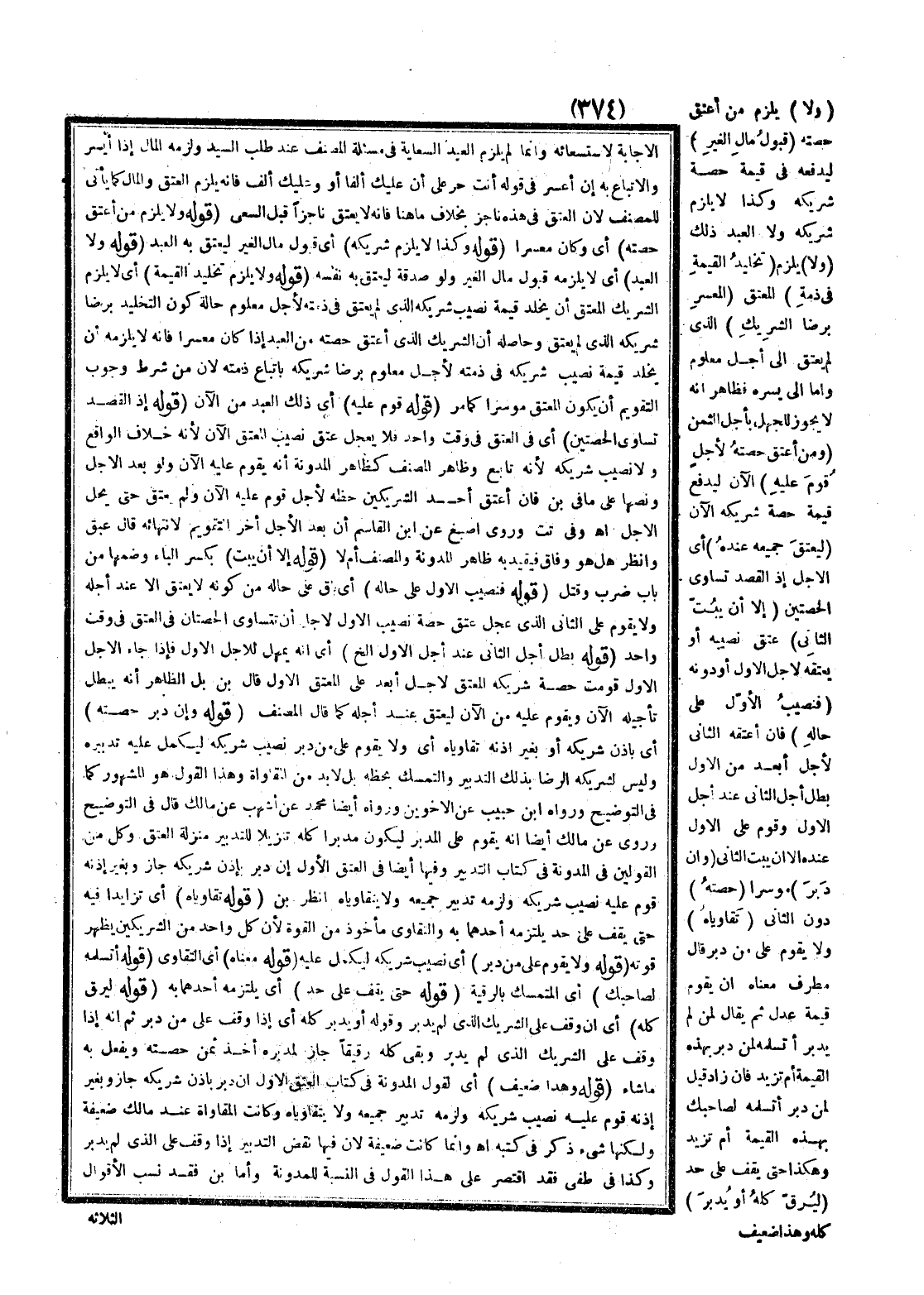 ـــــــــــــــــــــــــــــQالْإِجَابَةُ لِاسْتِسْعَائِهِ، وَإِنَّمَا لَمْ يَلْزَمْ الْعَبْدَ السِّعَايَةُ فِي مَسْأَلَةِ الْمُصَنِّفِ عِنْدَ طَلَبِ السَّيِّدِ وَلَزِمَهُ الْمَالُ إذَا أَيْسَرَ وَالِاتِّبَاعُ بِهِ إنْ أَعْسَرَ فِي قَوْلِهِ أَنْت حُرٌّ عَلَى أَنَّ عَلَيْك أَلْفًا أَوْ وَعَلَيْك أَلْفٌ، فَإِنَّهُ يَلْزَمُ الْعِتْقُ وَالْمَالُ كَمَا يَأْتِي لَلْمُصَنِّفِ؛ لِأَنَّ الْعِتْقَ فِي هَذِهِ نَاجِزٌ بِخِلَافِ مَا هُنَا، فَإِنَّهُ لَا يَعْتِقُ نَاجِزًا قَبْلَ السَّعْيِ (قَوْلُهُ: وَلَا يَلْزَمُ مَنْ أَعْتَقَ حِصَّتَهُ) أَيْ وَكَانَ مُعْسِرًا (قَوْلُهُ: وَكَذَا لَا يَلْزَمُ شَرِيكَهُ) أَيْ قَبُولُ مَالِ الْغَيْرِ لِيُعْتِقَ بِهِ الْعَبْدَ (قَوْلُهُ: وَلَا الْعَبْدَ) أَيْ لَا يَلْزَمُهُ قَبُولُ مَالِ الْغَيْرِ وَلَوْ صَدَقَةً لِيُعْتِقَ بِهِ نَفْسَهُ (قَوْلُهُ: وَلَا يَلْزَمُ تَخْلِيدُ الْقِيمَةِ) أَيْ لَا يَلْزَمُ الشَّرِيكَ الْمُعْتِقَ أَنْ يُخَلِّدَ قِيمَةَ نَصِيبِ شَرِيكِهِ الَّذِي لَمْ يُعْتِقْ فِي ذِمَّتِهِ لِأَجَلٍ مَعْلُومٍ حَالَةَ كَوْنِ التَّخْلِيدِ بِرِضَا شَرِيكِهِ الَّذِي لَمْ يُعْتِقْ وَحَاصِلُهُ أَنَّ الشَّرِيكَ الَّذِي أَعْتَقَ حِصَّتَهُ مِنْ الْعَبْدِ إذَا كَانَ مُعْسِرًا، فَإِنَّهُ لَا يَلْزَمُهُ أَنْ يُخَلِّدَ قِيمَةَ نَصِيبِ شَرِيكِهِ فِي ذِمَّتِهِ لِأَجَلٍ مَعْلُومٍ بِرِضَا شَرِيكِهِ بِاتِّبَاعِ ذِمَّتِهِ؛ لِأَنَّ مِنْ شَرْطِ وُجُوبِ التَّقْوِيمِ أَنْ يَكُونَ الْمُعْتِقُ مُوسِرًا كَمَا مَرَّ