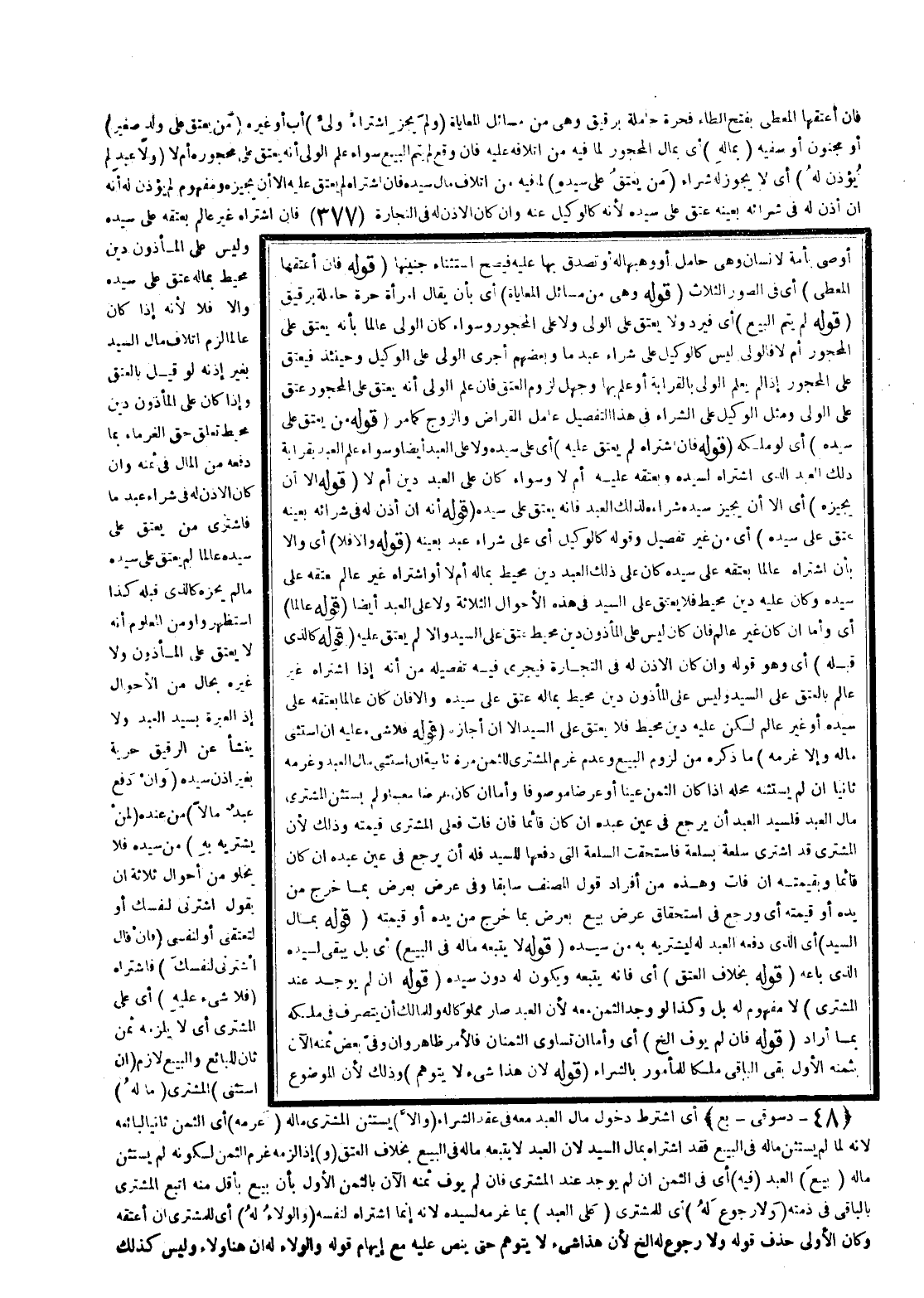 (قَوْلُهُ: فَلَا شَيْءَ عَلَيْهِ إنْ اسْتَثْنَى مَالَهُ وَإِلَّا غَرِمَهُ) مَا ذَكَرَهُ مِنْ لُزُومِ الْبَيْعِ وَعَدَمِ غُرْمِ الْمُشْتَرِي لِلثَّمَنِ مَرَّةً ثَانِيَةً إنْ اسْتَثْنَى مَالَ الْعَبْدِ وَغَرِمَهُ ثَانِيًا إنْ لَمْ يَسْتَثْنِهِ مَحَلَّهُ إذَا كَانَ الثَّمَنُ عَيْنًا أَوْ عَرَضًا مَوْصُوفًا، وَأَمَّا إنْ كَانَ عَرَضًا مُعَيَّنًا وَلَمْ يَسْتَثْنِ الْمُشْتَرِي مَالَ الْعَبْدِ فَلِسَيِّدِ الْعَبْدِ أَنْ يَرْجِعَ فِي عَيْنِ عَبْدِهِ إنْ كَانَ قَائِمًا، فَإِنْ فَاتَ فَعَلَى الْمُشْتَرِي قِيمَتُهُ؛ وَذَلِكَ لِأَنَّ الْمُشْتَرِيَ قَدْ اشْتَرَى سِلْعَةً بِسِلْعَةٍ فَاسْتُحِقَّتْ السِّلْعَةُ الَّتِي دَفَعَهَا لِلسَّيِّدِ فَلَهُ أَنْ يَرْجِعَ فِي عَيْنِ عَبْدِهِ إنْ كَانَ قَائِمًا وَبِقِيمَتِهِ إنْ فَاتَ وَهَذِهِ مِنْ أَفْرَادِ قَوْلِ الْمُصَنِّفِ سَابِقًا وَفِي عَرَضٍ بِعَرَضٍ بِمَا خَرَجَ مِنْ يَدِهِ أَوْ قِيمَتِهِ أَيْ وَرَجَعَ فِي اسْتِحْقَاقِ عَرَضٍ بِيعَ بِعَرَضٍ بِمَا خَرَجَ مِنْ يَدِهِ أَوْ قِيمَتِهِ (قَوْلُهُ بِمَالِ السَّيِّدِ) أَيْ الَّذِي دَفَعَهُ الْعَبْدُ لَهُ لِيَشْتَرِيَهُ بِهِ مِنْ سَيِّدِهِ (قَوْلُهُ: لَا يَتْبَعُهُ مَالُهُ فِي الْبَيْعِ) أَيْ بَلْ يَبْقَى لِسَيِّدِهِ الَّذِي بَاعَهُ (قَوْلُهُ: بِخِلَافِ الْعِتْقِ) أَيْ فَإِنَّهُ يَتْبَعُهُ وَيَكُونُ لَهُ دُونَ سَيِّدِهِ (قَوْلُهُ: إنْ لَمْ يُوجَدْ عِنْدَ الْمُشْتَرِي) لَا مَفْهُومَ لَهُ بَلْ وَكَذَا لَوْ وَجَدَ الثَّمَنَ مَعَهُ؛ لِأَنَّ الْعَبْدَ صَارَ مَمْلُوكًا لَهُ وَلِلْمَالِكِ أَنْ يَتَصَرَّفَ فِي مِلْكِهِ بِمَا أَرَادَ (قَوْلُهُ: فَإِنْ لَمْ يُوفِ إلَخْ) أَيْ وَأَمَّا إنْ تَسَاوَى الثَّمَنَانِ فَالْأَمْرُ ظَاهِرٌ، وَإِنْ وَفَّى بَعْضَ ثَمَنِهِ الْآنَ بِثَمَنِهِ الْأَوَّلِ بَقِيَ الْبَاقِي مِلْكًا لِلْمَأْمُورِ بِالشِّرَاءِ (قَوْلُهُ: لِأَنَّ هَذَا شَيْءٌ لَا يُتَوَهَّمُ) وَذَلِكَ لِأَنَّ الْمَوْضُوعَ