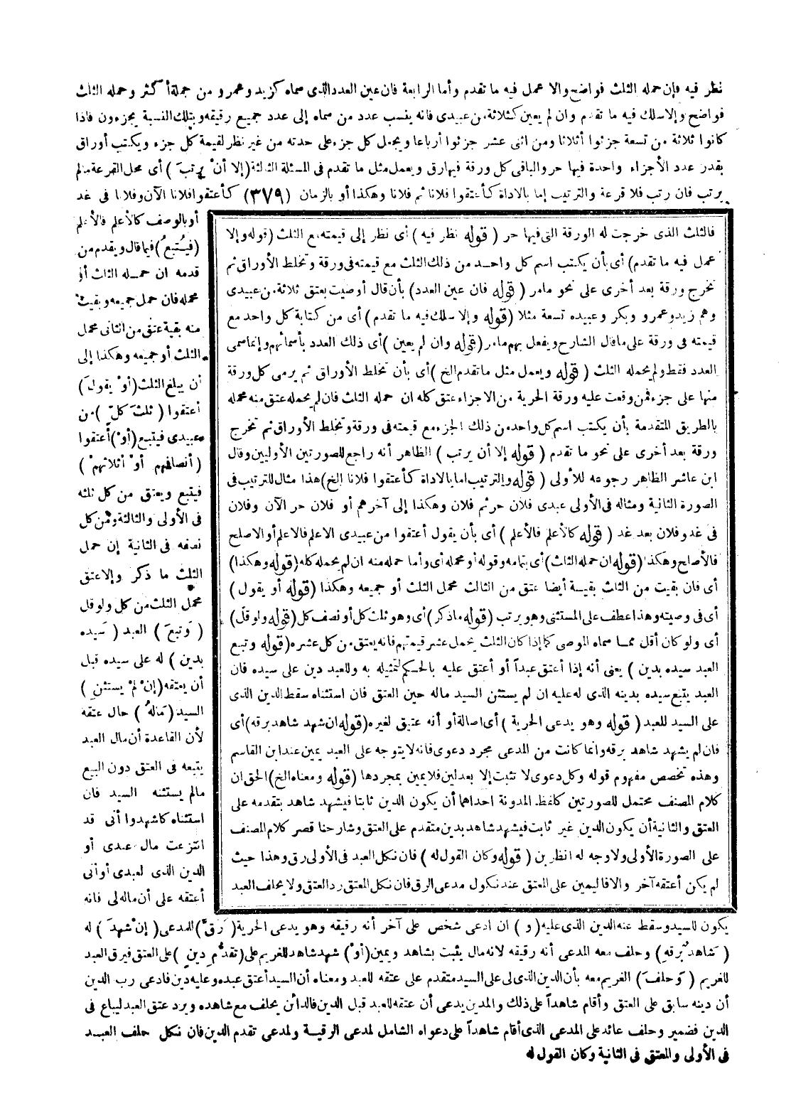 وَأَمَّا الرَّابِعَةُ، فَإِنْ عَيَّنَ الْعَدَدَ الَّذِي سَمَّاهُ كَزَيْدٍ وَعَمْرٍو مِنْ جُمْلَةٍ أَكْثَرَ وَحَمَلَهُ الثُّلُثُ فَوَاضِحٌ وَإِلَّا سَلَكَ فِيهِ مَا تَقَدَّمَ، وَإِنْ لَمْ يُعَيِّنْ كَثَلَاثَةٍ مِنْ عَبِيدِي، فَإِنَّهُ يُنْسَبُ عَدَدُ مَنْ سَمَّاهُ إلَى عَدَدِ جَمِيعِ رَقِيقِهِ وَبِتِلْكَ النِّسْبَةِ يُجَزَّءُونَ، فَإِذَا كَانُوا ثَلَاثَةً مِنْ تِسْعَةٍ جُزِّئُوا أَثْلَاثًا وَمِنْ اثْنَيْ عَشَرَ جُزِّئُوا أَرْبَاعًا وَيُجْعَلُ كُلُّ جُزْءٍ عَلَى حِدَتِهِ مِنْ غَيْرِ نَظَرٍ لَقِيمَة كُلِّ جُزْءٍ وَيُكْتَبُ أَوْرَاقٌ بِقَدْرِ عَدَدِ الْأَجْزَاءِ وَاحِدَةٌ فِيهَا حُرٌّ وَالْبَاقِي كُلٌّ وَرَقَةٍ فِيهَا رِقٌّ وَيُعْمَلُ مِثْلُ مَا تَقَدَّمَ فِي الْمَسْأَلَةِ الثَّالِثَةِ (إلَّا أَنْ يُرَتِّبَ) أَيْ مَحَلُّ الْقُرْعَةِ مَا لَمْ يُرَتَّبْ، فَإِنْ رَتَّبَ فَلَا قُرْعَةَ، وَالتَّرْتِيبُ إمَّا بِالْأَدَاةِ كَعَتَقُوا فُلَانًا ثُمَّ فُلَانًا وَهَكَذَا أَوْ بِالزَّمَانِ كَأَعْتِقُوا فُلَانًا الْآنَ وَفُلَانًا فِي غَدٍ أَوْ بِالْوَصْفِ كَالْأَعْلَمِ فَالْأَعْلَمِ (فَيُتَّبَعُ) فِيمَا قَالَ وَيُقَدَّمُ مَنْ قَدَّمَهُ إنْ حَمَلَهُ الثُّلُثُ أَوْ مَحْمَلُهُ، فَإِنْ حَمَلَ جَمِيعَهُ وَبَقِيَتْ مِنْهُ بَقِيَّةٌ عَتَقَ مِنْ الثَّانِي مَحْمَلَ الثُّلُثِ أَوْ جَمِيعَهُ وَهَكَذَا إلَى أَنْ يَبْلُغَ الثُّلُثَ (أَوْ يَقُولُ) أَعْتِقُوا (ثُلُثَ كُلٍّ) مِنْ عَبِيدِي فَيُتَّبَعُ (أَوْ) أَعْتِقُوا (أَنْصَافَهُمْ أَوْ أَثْلَاثَهُمْ) فَيُتَّبَعُ وَيَعْتِقُ مِنْ كُلٍّ ثُلُثَهُ فِي الْأُولَى وَالثَّالِثَةِ وَمِنْ كُلٍّ نِصْفَهُ فِي الثَّانِيَةِ إنْ حَمَلَ الثُّلُثُ مَا ذَكَرَ وَإِلَّا عَتَقَ مَحْمَلَ الثُّلُثِ مِنْ كُلٍّ وَلَوْ قَلَّ (وَتَبِعَ) الْعَبْدُ (سَيِّدَهُ بِدَيْنٍ) لَهُ عَلَى سَيِّدِهِ قَبْلَ أَنْ يَعْتِقَهُ (إنْ لَمْ يَسْتَثْنِ) السَّيِّدُ (مَالَهُ) حَالَ عِتْقِهِ؛ لِأَنَّ الْقَاعِدَةَ أَنَّ مَالَ الْعَبْدِ يَتْبَعُهُ فِي الْعِتْقِ دُونَ الْبَيْعِ مَا لَمْ يَسْتَثْنِهِ السَّيِّدُ، فَإِنْ اسْتَثْنَاهُ كَاشْهَدُوا أَنِّي قَدْ انْتَزَعْت مَالَ عَبْدِي أَوْ الدَّيْنَ الَّذِي لِعَبْدِي أَوْ أَنِّي أَعْتِقُهُ عَلَى أَنَّ مَالَهُ لِي، فَإِنَّهُ يَكُونُ لِلسَّيِّدِ وَسَقَطَ عَنْهُ الدَّيْنُ الَّذِي عَلَيْهِ
