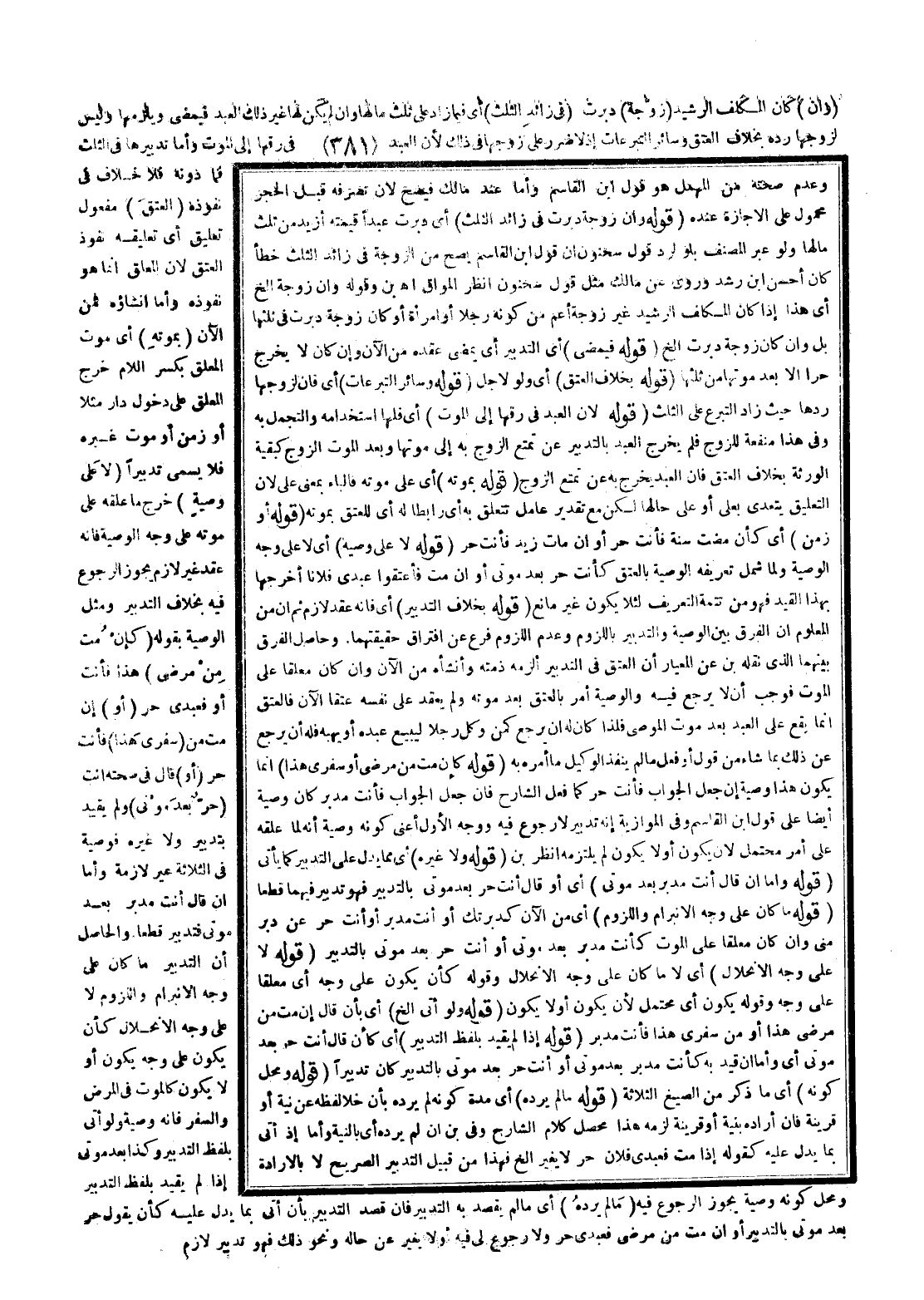 ـــــــــــــــــــــــــــــQوَعَدَمُ صِحَّتِهِ مِنْ الْمُهْمِلِ هُوَ قَوْلُ ابْنِ الْقَاسِمِ، وَأَمَّا عِنْدَ مَالِكٍ فَيَصِحُّ؛ لِأَنَّ تَصَرُّفَهُ قَبْلَ الْحَجْرِ مَحْمُولٌ عَلَى الْإِجَازَةِ عِنْدَهُ (قَوْلُهُ: وَإِنْ زَوْجَةً دَبَّرَتْ فِي زَائِدِ الثُّلُثِ) أَيْ دَبَّرَتْ عَبْدًا قِيمَتُهُ أَزْيَدُ مِنْ ثُلُثِ مَالِهَا وَلَوْ عَبَّرَ الْمُصَنِّفُ بِلَوْ لَرَدَّ قَوْلَ سَحْنُونٍ أَنَّ قَوْلَ ابْنِ الْقَاسِمِ يَصِحُّ مِنْ الزَّوْجَةِ فِي زَائِدِ الثُّلُثِ خَطَأٌ كَانَ أَحْسَنَ ابْنُ رُشْدٍ وَرُوِيَ عَنْ مَالِكٍ مِثْلُ قَوْلِ سَحْنُونٍ اُنْظُرْ الْمَوَّاقَ اهـ بْن وَقَوْلُهُ وَأَنَّ زَوْجَةَ إلَخْ أَيْ هَذَا إذَا كَانَ الْمُكَلَّفُ الرَّشِيدُ غَيْرَ زَوْجَةٍ أَعَمُّ مِنْ كَوْنِهِ رَجُلًا أَوْ امْرَأَةً أَوْ كَانَ زَوْجَةً دُبِّرَتْ فِي ثُلُثِهَا بَلْ وَإِنْ كَانَ زَوْجَةً دُبِّرَتْ إلَخْ (قَوْلُهُ: فَيَمْضِي) أَيْ التَّدْبِيرُ أَيْ يَمْضِي عَقْدُهُ مِنْ الْآنَ، وَإِنْ كَانَ لَا يَخْرُجُ حُرًّا إلَّا بَعْدَ مَوْتِهَا مِنْ ثُلُثِهَا.