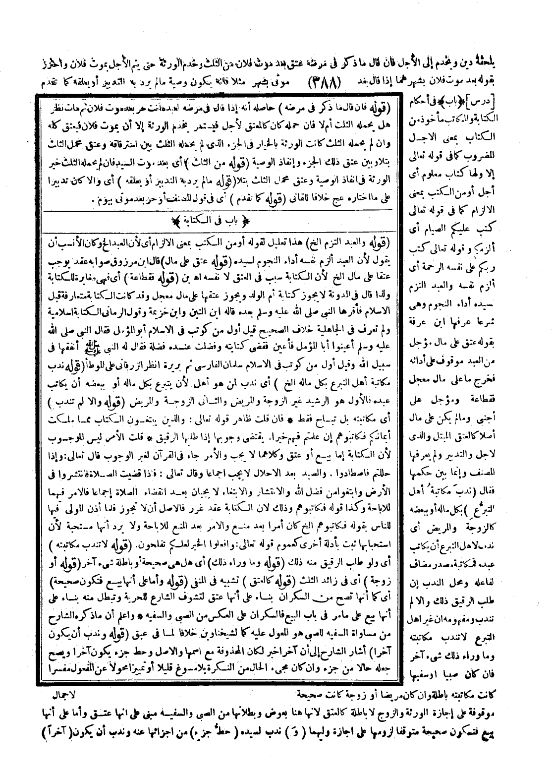 [دَرْسٌ] {بَابٌ} فِي أَحْكَامِ الْكِتَابَةِ، وَالْمُكَاتَبُ مَأْخُوذٌ مِنْ الْكِتَابِ بِمَعْنَى الْأَجَلِ الْمَضْرُوبِ كَمَا فِي قَوْله تَعَالَى {إِلا وَلَهَا كِتَابٌ مَعْلُومٌ} [الحجر: 4] أَيْ أَجَلٌ أَوْ مِنْ الْكَتْبِ بِمَعْنَى الْإِلْزَامِ كَمَا فِي قَوْله تَعَالَى {كُتِبَ عَلَيْكُمُ الصِّيَامُ} [البقرة: 183] أَيْ أَلْزَمَكُمْ وقَوْله تَعَالَى {كَتَبَ رَبُّكُمْ عَلَى نَفْسِهِ الرَّحْمَةَ} [الأنعام: 54] أَيْ أَلْزَمَ نَفْسَهُ وَالْعَبْدُ الْتَزَمَ لِسَيِّدِهِ أَدَاءَ النُّجُومِ وَهِيَ شَرْعًا عَرَّفَهَا ابْنُ عَرَفَةَ بِقَوْلِهِ عِتْقٌ عَلَى مَالٍ مُؤَجَّلٍ مِنْ الْعَبْدِ مَوْقُوفٌ عَلَى أَدَائِهِ فَخَرَجَ مَا عَلَى مَالٍ مُعَجَّلٍ فَقَطَاعَةٌ وَمُؤَجَّلٌ عَلَى أَجْنَبِيٍّ وَمَا لَمْ يَكُنْ عَلَى مَالٍ أَصْلًا كَالْعِتْقِ الْمُبَتَّلِ وَاَلَّذِي لِأَجَلٍ وَالتَّدْبِيرُ وَلَمْ يُعَرِّفْهَا الْمُصَنِّفُ، وَإِنَّمَا بَيَّنَ حُكْمَهَا فَقَالَ (نُدِبَ مُكَاتَبَةُ أَهْلِ التَّبَرُّعِ) بِكُلِّ مَالِهِ أَوْ بِبَعْضِهِ كَالزَّوْجَةِ وَالْمَرِيضِ أَيْ نُدِبَ لِأَهْلِ التَّبَرُّعِ أَنْ يُكَاتِبَ عَبْدَهُ فَمُكَاتَبَةٌ مَصْدَرٌ مُضَافٌ لِفَاعِلِهِ وَمَحَلُّ النَّدْبِ إنْ طَلَبَ الرَّقِيقُ ذَلِكَ وَإِلَّا لَمْ تُنْدَبْ وَمَفْهُومُهُ أَنَّ غَيْرَ أَهْلِ التَّبَرُّعِ لَا تُنْدَبُ مُكَاتَبَتُهُ وَمَا وَرَاءَ ذَلِكَ شَيْءٌ آخَرُ، فَإِنْ كَانَ صَبِيًّا أَوْ سَفِيهًا كَانَتْ مُكَاتَبَتُهُ بَاطِلَةً، وَإِنْ كَانَ مَرِيضًا أَوْ زَوْجَةً كَانَتْ صَحِيحَةً مَوْقُوفَةً عَلَى إجَازَةِ الْوَرَثَةِ وَالزَّوْجِ لَا بَاطِلَةً كَالْعِتْقِ؛ لِأَنَّهَا هُنَا بِعِوَضٍ، وَبُطْلَانُهَا مِنْ الصَّبِيِّ وَالسَّفِيهِ مَبْنِيٌّ عَلَى أَنَّهَا عِتْقٌ، وَأَمَّا عَلَى أَنَّهَا بَيْعٌ فَتَكُونُ صَحِيحَةً مُتَوَقِّفًا لُزُومُهَا عَلَى إجَازَةِ وَلِيِّهِمَا (وَ) نُدِبَ لِسَيِّدِهِ (حَطُّ جُزْءٍ) مِنْ أَجْزَائِهَا عَنْهُ وَنُدِبَ أَنْ يَكُونَ (آخِرًا)