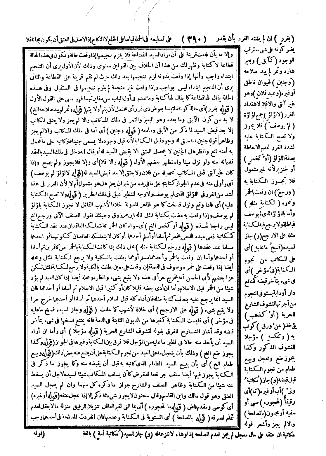 ـــــــــــــــــــــــــــــQوَإِلَّا مَا بِأَنْ قَامَتْ قَرِينَةٌ عَلَى أَنَّ مُرَادَ السَّيِّدِ الْقَطَاعَةُ فَلَا يَلْزَمُ تَنْجِيمُهَا إذَا وَقَعَتْ حَالَةً وَتَكُونُ فِي هَذِهِ الْحَالَةِ قَطَاعَةً لَا كِتَابَةً وَظَهَرَ لَك مِنْ هَذَا أَنَّ الْخِلَافَ بَيْنَ الْقَوْلَيْنِ مَعْنَوِيٌّ؛ وَذَلِكَ لِأَنَّ الْأَوَّلَ يَرَى أَنَّ التَّنْجِيمَ ابْتِدَاءً وَاجِبٌ وَأَنَّهَا إذَا وَقَعَتْ بِدُونِهِ لَزِمَ تَنْجِيمُهَا بَعْدَ ذَلِكَ حَيْثُ لَمْ تَقُمْ قَرِينَةٌ عَلَى الْقَطَاعَةِ وَالثَّانِي يَرَى أَنَّ التَّنْجِيمَ ابْتِدَاءٌ لَيْسَ بِوَاجِبٍ وَإِذَا وَقَعَتْ غَيْرَ مُنَجَّمَةٍ لَمْ يَلْزَمْ تَنْجِيمُهَا فِي الْمُسْتَقْبَلِ وَفِي هَذِهِ الْحَالَةِ يُقَالُ لَهَا قَطَاعَةٌ كَمَا يُقَالُ لَهَا كِتَابَةٌ وَمَا تَقَدَّمَ فِي أَوَّلِ الْبَابِ مِنْ مُغَايَرَتِهِمَا فَهُوَ مَبْنِيٌّ عَلَى الْقَوْلِ الْأَوَّلِ