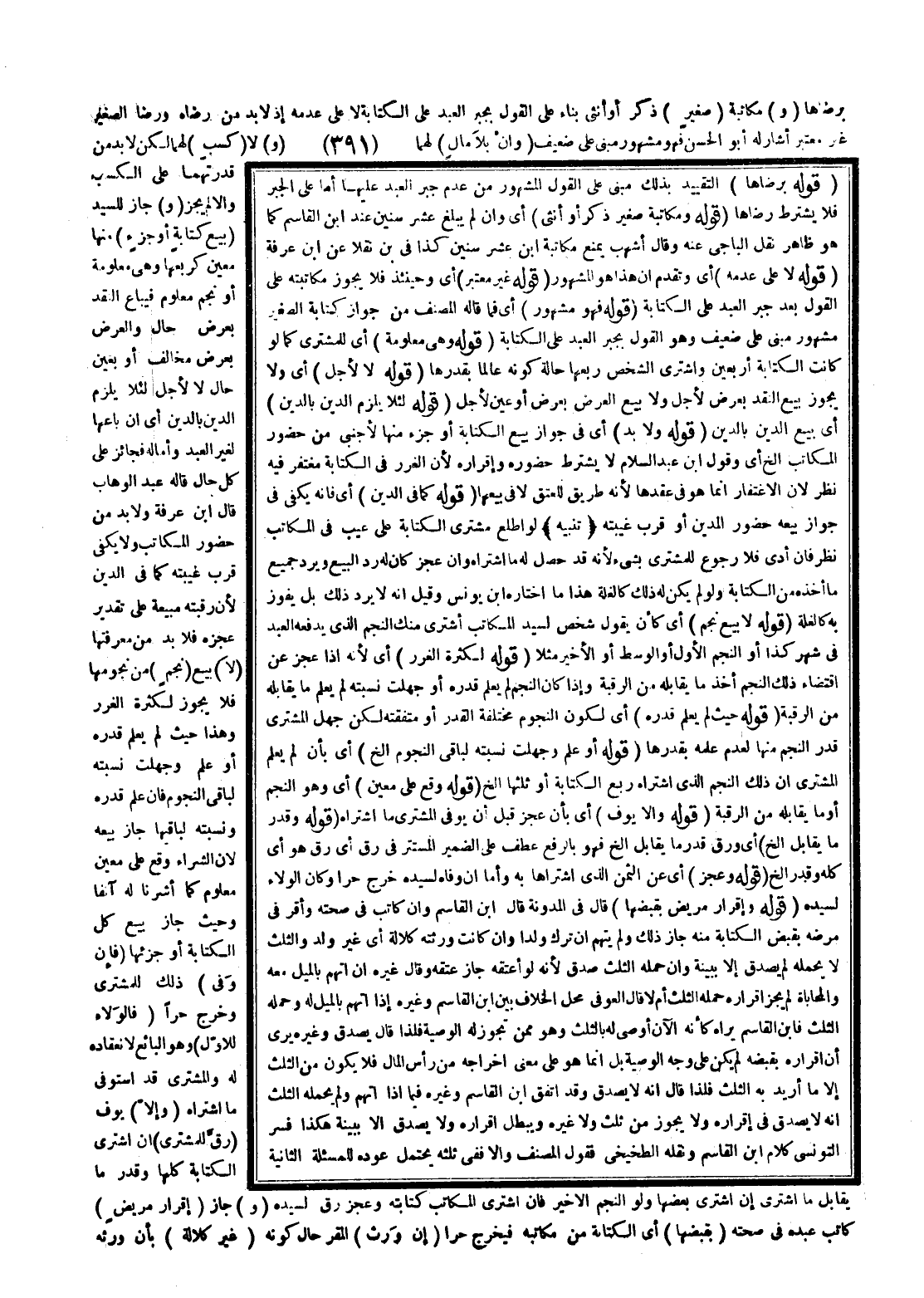 ـــــــــــــــــــــــــــــQقَوْلُهُ: بِرِضَاهَا) التَّقْيِيدُ بِذَلِكَ مَبْنِيٌّ عَلَى الْقَوْلِ الْمَشْهُورِ مِنْ عَدَمِ جَبْرِ الْعَبْدِ عَلَيْهَا أَمَّا عَلَى الْجَبْرِ فَلَا يُشْتَرَطُ رِضَاهَا (قَوْلُهُ: وَمُكَاتَبَةُ صَغِيرٍ ذَكَرٍ أَوْ أُنْثَى) أَيْ وَإِنْ لَمْ يَبْلُغْ عَشْرَ سِنِينَ عِنْدَ ابْنِ الْقَاسِمِ كَمَا هُوَ ظَاهِرُ نَقْلِ الْبَاجِيَّ عَنْهُ وَقَالَ أَشْهَبُ يُمْنَعُ مُكَاتَبَةُ ابْنِ عَشْرِ سِنِينَ كَذَا فِي بْن نَقْلًا عَنْ ابْنِ عَرَفَةَ (قَوْلُهُ: لَا عَلَى عَدَمِهِ) أَيْ وَتَقَدَّمَ أَنَّ هَذَا هُوَ الْمَشْهُورُ (قَوْلُهُ: غَيْرُ مُعْتَبَرٍ) أَيْ وَحِينَئِذٍ فَلَا يَجُوزُ مُكَاتَبَتُهُ عَلَى الْقَوْلِ بَعْدَ جَبْرِ الْعَبْدِ عَلَى الْكِتَابَةِ (قَوْلُهُ: فَهُوَ مَشْهُورٌ) أَيْ فَمَا قَالَهُ الْمُصَنِّفُ مِنْ جَوَازِ كِتَابَةِ الصَّغِيرِ مَشْهُورٌ مَبْنِيٌّ عَلَى ضَعِيفٍ وَهُوَ الْقَوْلُ بِجَبْرِ الْعَبْدِ عَلَى الْكِتَابَةِ