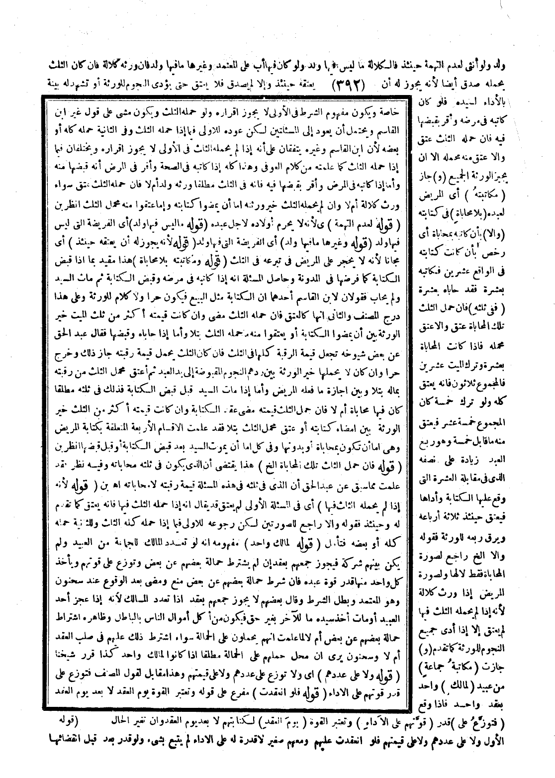 ـــــــــــــــــــــــــــــQخَاصَّةً وَيَكُونُ مَفْهُومُ الشَّرْطِ فِي الْأُولَى لَا يَجُوزُ إقْرَارُهُ وَلَوْ حَمَلَهُ الثُّلُثُ وَيَكُونُ مَشَى عَلَى قَوْلِ غَيْرِ ابْنِ الْقَاسِمِ وَيَحْتَمِلُ أَنْ يَعُودَ إلَى الْمَسْأَلَتَيْنِ لَكِنَّ عَوْدَهُ لِلْأُولَى فِيمَا إذَا حَمَلَهُ الثُّلُثُ وَفِي الثَّانِيَةِ حَمَلَهُ كُلَّهُ أَوْ بَعْضَهُ؛ لِأَنَّ ابْنَ الْقَاسِمِ وَغَيْرَهُ يَتَّفِقَانِ عَلَى أَنَّهُ إذَا لَمْ يَحْمِلْهُ الثُّلُثُ فِي الْأُولَى لَا يَجُوزُ إقْرَارُهُ وَيَخْتَلِفَانِ فِيمَا إذَا حَمَلَهُ الثُّلُثُ كَمَا عَلِمْته مِنْ كَلَامِ الْعَوْفِيِّ وَهَذَا كُلُّهُ إذَا كَاتَبَهُ فِي الصِّحَّةِ وَأَقَرَّ فِي الْمَرَضِ أَنَّهُ قَبَضَهَا مِنْهُ، وَأَمَّا إذَا كَاتَبَهُ فِي الْمَرَضِ وَأَقَرَّ بِقَبْضِهَا فِيهِ، فَإِنَّهُ فِي الثُّلُثِ مُطْلَقًا وَرِثَهُ وَلَدٌ أَمْ لَا، فَإِنْ حَمَلَهُ الثُّلُثُ عَتَقَ سَوَاءٌ وَرِثَ كَلَالَةً أَمْ لَا، وَإِنْ لَمْ يَحْمِلْهُ الثُّلُثُ خُيِّرَ وَرَثَتُهُ إمَّا أَنْ يُمْضُوا كِتَابَتَهُ وَإِمَّا أَنْ يَعْتِقُوا مِنْهُ مَحْمَلَ الثُّلُثِ اُنْظُرْ بْن (قَوْلُهُ: لِعَدَمِ التُّهْمَةِ) أَيْ لِأَنَّهُ لَا يُحْرِمُ أَوْلَادَهُ لِأَجْلِ عَبْدِهِ (قَوْلُهُ: مَا لَيْسَ فِيهَا وَلَدٌ) أَيْ الْفَرِيضَةُ الَّتِي لَيْسَ فِيهَا وَلَدٌ (قَوْلُهُ وَغَيْرِهَا مَا فِيهَا وَلَدٌ) أَيْ الْفَرِيضَةُ الَّتِي فِيهَا وَلَدٌ (قَوْلُهُ: لِأَنَّهُ يَجُوزُ لَهُ أَنْ يَعْتِقَهُ حِينَئِذٍ) أَيْ مَجَّانًا؛ لِأَنَّهُ لَا يُحْجَرُ عَلَى الْمَرِيضِ فِي تَبَرُّعِهِ فِي الثُّلُثِ