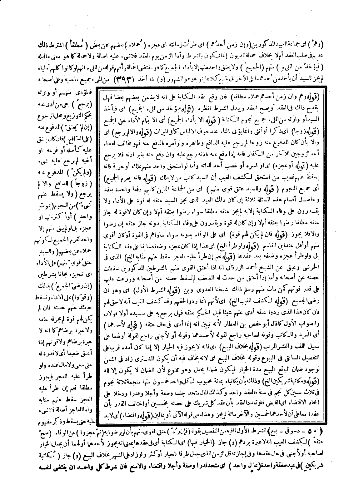 ـــــــــــــــــــــــــــــQقَوْلُهُ: وَهُمْ وَإِنْ زَمِنَ أَحَدُهُمْ حُمَلَاءُ مُطْلَقًا) ، فَإِنْ وَقَعَ عَقْدُ الْكِتَابَةِ عَلَى أَنَّهُ لَا يَضْمَنُ بَعْضُهُمْ بَعْضًا فَهَلْ يَقْدَحُ ذَلِكَ فِي الْعَقْدِ أَوْ يَصِحُّ الْعَقْدُ وَيُبَدَّلُ الشَّرْطُ اُنْظُرْهُ (قَوْلُهُ: فَيُؤْخَذُ مِنْ الْمَلِيءِ الْجَمِيعُ) أَيْ فَيَأْخُذُ السَّيِّدُ أَوْ وَارِثُهُ مِنْ الْمَلِيءِ جَمِيعَ نُجُومِ الْكِتَابَةِ (قَوْلُهُ إلَّا بِأَدَاءِ الْجَمِيعِ) أَيْ إلَّا بِتَمَامِ الْأَدَاءِ عَنْ الْجَمِيعِ (قَوْلُهُ: زَوْجًا) أَيْ ذَكَرًا أَوْ أُنْثَى، وَإِنَّمَا يُؤْتَى بِالتَّاءِ عِنْدَ خَوْفِ الْإِلْبَاسِ كَمَا فِي الْمِيرَاثِ (قَوْلُهُ: وَإِلَّا لَمْ يَرْجِعْ) أَيْ وَإِلَّا بِأَنْ كَانَ الْمَدْفُوعُ عَنْهُ زَوْجًا لَمْ يَرْجِعْ عَلَيْهِ الدَّافِعُ وَظَاهِرُهُ وَلَوْ أَمَرَهُ بِالدَّفْعِ عَنْهُ فَهُوَ مُخَالِفٌ لِفِدَاءِ أَحَدِ الزَّوْجَيْنِ لِلْآخَرِ مِنْ الْكُفَّارِ، فَإِنَّهُ إذَا دَفَعَ عَنْهُ بِإِذْنِهِ رَجَعَ عَلَيْهِ، وَإِنْ دَفَعَ عَنْهُ بِغَيْرِ إذْنِهِ فَلَا يَرْجِعُ عَلَيْهِ (قَوْلُهُ: أَوْ عَجْزُهُ) أَيْ أَوْ أَسْرِهِ أَوْ غَصْبِ أَحَدٍ لِذَاتِهِ، وَأَمَّا لَوْ اسْتَحَقَّ وَاحِدٌ مِنْهُمْ بِمِلْكٍ أَوْ حُرِّيَّةٍ، فَإِنَّهُ يَسْقُطُ عَنْهُمْ نَصِيبُ مَنْ اسْتَحَقَّ لِكَشْفِ الْغَيْبِ أَنَّ السَّيِّدَ كَاتَبَ مَنْ لَا يَمْلِكُ (قَوْلُهُ: فَإِنَّهُ يَغْرَمُ الْجَمِيعَ) أَيْ جَمِيعَ النُّجُومِ (قَوْلُهُ: وَلِلسَّيِّدِ عِتْقُ قَوِيٍّ مِنْهُمْ) أَيْ مِنْ الْجَمَاعَةِ الَّذِينَ كَاتَبَهُمْ دَفْعَةً وَاحِدَةً بِعَقْدٍ، وَحَاصِلُ أَقْسَامِ هَذِهِ الْمَسْأَلَةِ ثَلَاثَةٌ إنْ كَانَ ذَلِكَ الْعَبْدُ الَّذِي نَجَّزَ السَّيِّدُ عِتْقَهُ لَهُ قُوَّةٌ عَلَى الْأَدَاءِ وَلَا يَقْدِرُونَ عَلَى وَفَاءِ الْكِتَابَةِ إلَّا بِهِ لَمْ يَجُزْ عِتْقُهُ مُطْلَقًا سَوَاءٌ رَضُوا بِعِتْقِهِ أَمْ لَا، وَإِنْ كَانَ لَا قُوَّةَ لَهُ جَازَ عِتْقُهُ مُطْلَقًا رَضُوا بِعِتْقِهِ أَمْ لَا، وَإِنْ كَانَ لَهُ قُوَّةٌ وَيَقْدِرُونَ عَلَى وَفَاءِ الْكِتَابَةِ بِدُونِهِ جَازَ عِتْقُهُ إنْ رَضُوا وَإِلَّا فَلَا يَجُوزُ (قَوْلُهُ: فَإِنْ لَمْ يَكُنْ لَهُمْ قُوَّةٌ) أَيْ عَلَى الْوَفَاءِ بِدُونِهِ سَوَاءٌ سَاوَاهُمْ فِي الْقُوَّةِ أَوْ كَانَ أَقْوَى مِنْهُمْ أَوْ أَقَلَّ عِنْدَ ابْنِ الْقَاسِمِ (قَوْلُهُ: وَلَوْ طَرَأَ إلَخْ) أَيْ هَذَا إذَا كَانَ عَجْزُهُ وَضَعْفُهُ سَابِقًا عَلَى عَقْدِ الْكِتَابَةِ بَلْ وَلَوْ طَرَأَ عَجْزُهُ وَضَعْفُهُ بَعْدَ عَقْدِهَا (قَوْلُهُ: نَعَمْ إنْ طَرَأَ عَلَيْهِ الْعَجْزُ سَقَطَ عَنْهُمْ مَنَابُهُ إلَخْ) الَّذِي فِي الْخَرَشِيِّ وعبق عَنْ الشَّيْخِ أَحْمَدَ الزَّرْقَانِيِّ أَنَّهُ إذَا أَعْتَقَ الْقَوِيَّ مِنْهُمْ بِالشَّرْطَيْنِ الْمَذْكُورَيْنِ سَقَطَتْ حِصَّتُهُ عَنْ أَصْحَابِهِ، وَأَمَّا إذَا أَعْتَقَ مَنْ حَدَثَ لَهُ الضَّعْفُ لَمْ تَسْقُطْ حِصَّتُهُ عَنْ أَصْحَابِهِ وَوُزِّعَتْ عَلَيْهِمْ عَلَى قَدْرِ قُوَّتِهِمْ كَمَنْ مَاتَ مِنْهُمْ وَسَلَّمَ ذَلِكَ شَيْخُنَا الْعَدَوِيُّ وبن (قَوْلُهُ الشَّرْطُ الْأَوَّلُ) أَيْ وَهُوَ إنْ رَضِيَ الْجَمِيعُ (قَوْلُهُ: لِكَشْفِ الْغَيْبِ إلَخْ) أَيْ لِأَنَّهُمْ إنَّمَا رَدُّوا لِحَقِّهِمْ وَقَدْ كَشَفَ الْغَيْبَ أَنَّهُ لَا حَقَّ لَهُمْ، فَإِنْ كَانَ هَذَا الَّذِي رَدُّوا عِتْقَهُ أَدَّى عَنْهُمْ شَيْئًا قَبْلَ الْحُكْمِ بِعِتْقِهِ فَهَلْ يَرْجِعُ بِهِ عَلَى سَيِّدِهِ أَوْ لَا قَوْلَانِ وَالصَّوَابُ الْأَوَّلُ كَمَا قَالَ أَبُو حَفْصِ بْنُ الْعَطَّارِ؛ لِأَنَّهُ تَبَيَّنَ أَنَّهُ إنَّمَا أَدَّى فِي حَالِ عِتْقِهِ (قَوْلُهُ: لِأَح