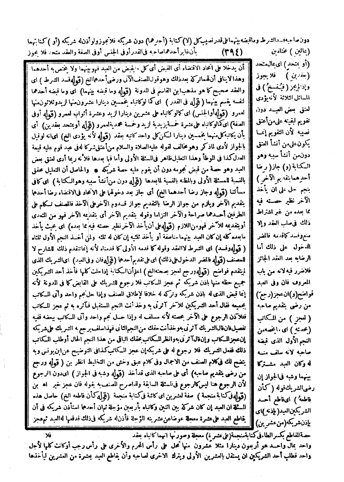 دُونَ صَاحِبِهِ فَسَدَ الشَّرْطُ وَمَا قَبَضَهُ بَيْنَهُمَا عَلَى قَدْرِ نَصِيبِ كُلٍّ (لَا) كِتَابَةُ (أَحَدِهِمَا) دُونَ شَرِيكِهِ فَلَا تَجُوزُ وَلَوْ أَذِنَ لَهُ شَرِيكُهُ (أَوْ) كِتَابَتُهُمَا (بِمَالَيْنِ) مُخْتَلِفَيْنِ بِأَنْ غَايَرَ أَحَدُهُمَا صَاحِبَهُ فِي الْقَدْرِ أَوْ فِي الْجِنْسِ أَوْ فِي الصِّفَةِ وَالْعَقْدُ مُتَّحِدٌ فَلَا يَجُوزُ (أَوْ بِمُتَّحِدٍ) أَيْ بِمَالٍ مُتَّحِدٍ (بِعَقْدَيْنِ) فَلَا يَجُوزُ وَإِذَا لَمْ يَجُزْ (فَيُفْسَخُ) فِي الْمَسَائِلِ الثَّلَاثَةِ؛ لِأَنَّهُ يُؤَدِّي لِعِتْقِ بَعْضِ الْعَبْدِ دُونَ تَقْوِيمٍ لِبَقِيَّتِهِ عَلَى مَنْ أَعْتَقَ نَصِيبَهُ؛ لِأَنَّ التَّقْوِيمَ إنَّمَا يَكُونُ عَلَى مَنْ أَنْشَأَ الْعِتْقَ دُونَ مَنْ أَنْشَأَ سَبَبَهُ وَهُوَ الْكِتَابَةُ (وَ) جَازَ (رِضَا أَحَدُهُمَا بِتَقْدِيمِ الْآخَرِ) بِنَجْمٍ حَلَّ عَلَى أَنْ يَأْخُذَ الْآخَرُ نَظِيرَ حِصَّتِهِ فِيهِ مِمَّا بَعْدَهُ مِنْ غَيْرِ اشْتِرَاطِ ذَلِكَ فِي صُلْبِ الْعَقْدِ وَإِلَّا مُنِعَ وَفَسَدَ كَمَا قَدَّمَهُ فَالْمُضِرُّ الدُّخُولُ عَلَى ذَلِكَ أَمَّا الرِّضَا بِهِ بَعْدَ الْعَقْدِ الْجَائِزِ فَلَا ضَرَرَ فِيهِ؛ لِأَنَّهُ مِنْ بَابِ الْمَعْرُوفِ، فَإِنْ وَفَّى الْعَبْدُ فَوَاضِحٌ (وَ) إنْ عَجَزَ (رَجَعَ) مَنْ رَضِيَ بِتَقْدِيمِ صَاحِبِهِ (لِعَجْزٍ) مِنْ الْمُكَاتَبِ (بِحِصَّتِهِ) أَيْ مَا يَخُصُّهُ مِنْ النَّجْمِ الْأَوَّلِ الَّذِي قَبَضَهُ صَاحِبُهُ؛ لِأَنَّهُ سَلَفٌ مِنْهُ لَهُ وَكَانَ الْعَبْدُ مُشْتَرَكًا بَيْنَهُمَا وَشَبَّهَ فِي الْجَوَازِ إنْ رَضِيَ الشَّرِيكُ قَوْلُهُ (كَأَنْ قَاطَعَهُ) أَيْ قَاطَعَ أَحَدُ الشَّرِيكَيْنِ الْعَبْدَ (بِإِذْنِهِ) أَيْ بِإِذْنِ شَرِيكِهِ (مِنْ عِشْرِينَ) حِصَّةُ الْمُقَاطِعِ بِكَسْرِ الطَّاءِ فِي كِتَابَةٍ مُنَجَّمَةٍ (عَلَى عَشْرَةٍ) مُعَجَّلَةٍ وَصُورَتُهَا أَنَّهُمَا كَاتَبَاهُ بِعَقْدٍ وَاحِدٍ بِمَالٍ وَاحِدٍ هُوَ أَرْبَعُونَ دِينَارًا مَثَلًا عِشْرُونَ مِنْهَا تَحِلُّ عَلَى رَأْسِ الْمُحَرَّمِ وَالْأُخْرَى عَلَى رَأْسِ رَجَبٍ أَوْ كَانَتْ كُلُّهَا لِأَجَلٍ وَاحِدٍ فَطَلَبَ أَحَدُ الشَّرِيكَيْنِ أَنْ يَسْتَقِلَّ بِالْعِشْرِينِ الْأُولَى وَيَتْرُكَ الْأُخْرَى لِصَاحِبِهِ وَأَنْ يُقَاطِعَ الْعَبْدَ بِعَشْرَةٍ مِنْ الْعِشْرِينَ لِيَأْخُذَهَا