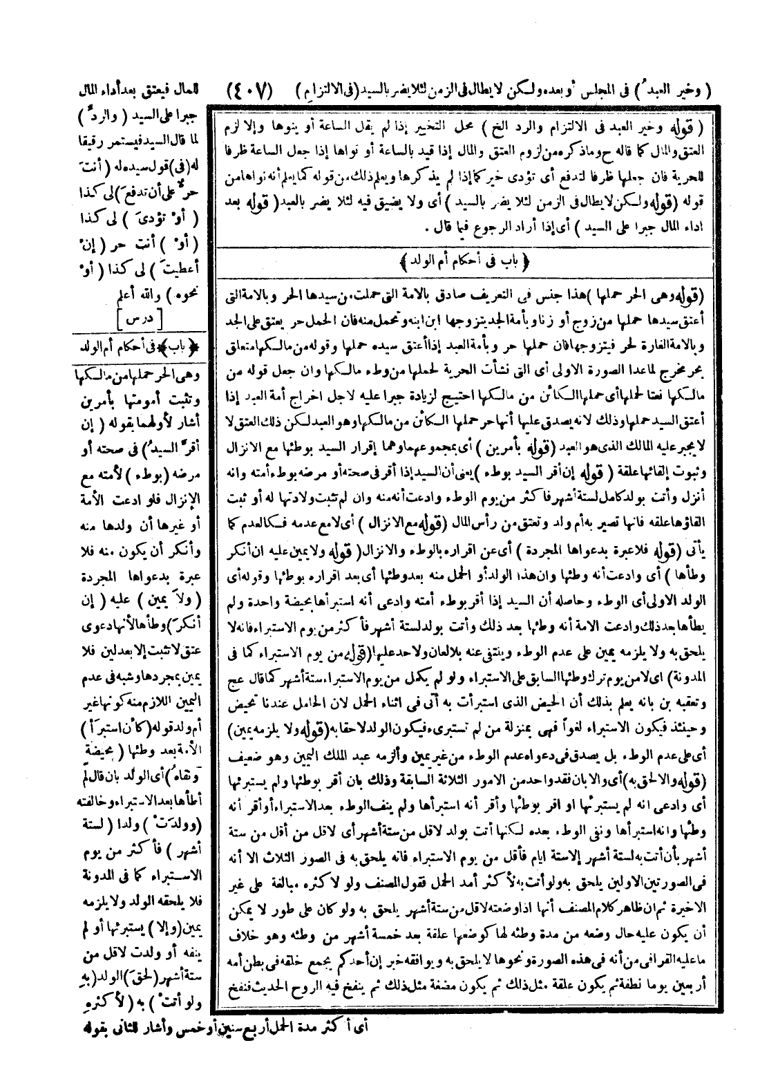 دَرْسٌ (بَابٌ) فِي أَحْكَامِ أُمِّ الْوَلَدِ وَهِيَ الْحُرُّ حَمْلُهَا مِنْ مَالِكِهَا وَتَثْبُتُ أُمُومَتُهَا بِأَمْرَيْنِ أَشَارَ لِأَوَّلِهِمَا بِقَوْلِهِ (إنْ) (أَقَرَّ السَّيِّدُ) فِي صِحَّتِهِ أَوْ مَرَضِهِ (بِوَطْءٍ) لِأَمَتِهِ مَعَ الْإِنْزَالِ فَلَوْ ادَّعَتْ الْأَمَةُ أَوْ غَيْرُهَا أَنَّ وَلَدَهَا مِنْهُ وَأَنْكَرَ أَنْ يَكُونَ مِنْهُ فَلَا عِبْرَةَ بِدَعْوَاهَا الْمُجَرَّدَةِ (وَلَا يَمِينَ) عَلَيْهِ (إنْ أَنْكَرَ) وَطْأَهَا؛ لِأَنَّهَا دَعْوَى عِتْقٍ لَا تَثْبُتُ إلَّا بِعَدْلَيْنِ فَلَا يَمِينَ بِمُجَرَّدِهَا وَشُبِّهَ فِي عَدَمِ الْيَمِينِ اللَّازِمِ مِنْهُ كَوْنُهَا غَيْرَ أُمِّ وَلَدٍ قَوْلُهُ (كَأَنْ اسْتَبْرَأَ) الْأَمَةَ بَعْدَ وَطْئِهَا (بِحَيْضَةٍ وَنَفَاهُ) أَيْ الْوَلَدَ بِأَنْ قَالَ لَمْ أَطَأْهَا بَعْدَ الِاسْتِبْرَاءِ وَخَالَفَتْهُ (وَوَلَدَتْ) وَلَدًا (لِسِتَّةِ أَشْهُرٍ) فَأَكْثَرَ مِنْ يَوْمِ الِاسْتِبْرَاءِ كَمَا فِي الْمُدَوَّنَةِ فَلَا يَلْحَقُهُ الْوَلَدُ وَلَا يَلْزَمُهُ يَمِينٌ (وَإِلَّا) يَسْتَبْرِئُهَا أَوْ لَمْ يَنْفِهِ أَوْ وَلَدَتْ لِأَقَلَّ مِنْ سِتَّةِ أَشْهُرٍ (لَحِقَ) الْوَلَدُ (بِهِ وَلَوْ أَتَتْ) بِهِ لِأَكْثَرِهِ أَيْ أَكْثَرِ مُدَّةِ الْحَمْلِ أَرْبَعِ سِنِينَ أَوْ خَمْسٍ وَأَشَارَ لِلثَّانِي بِقَوْلِهِ