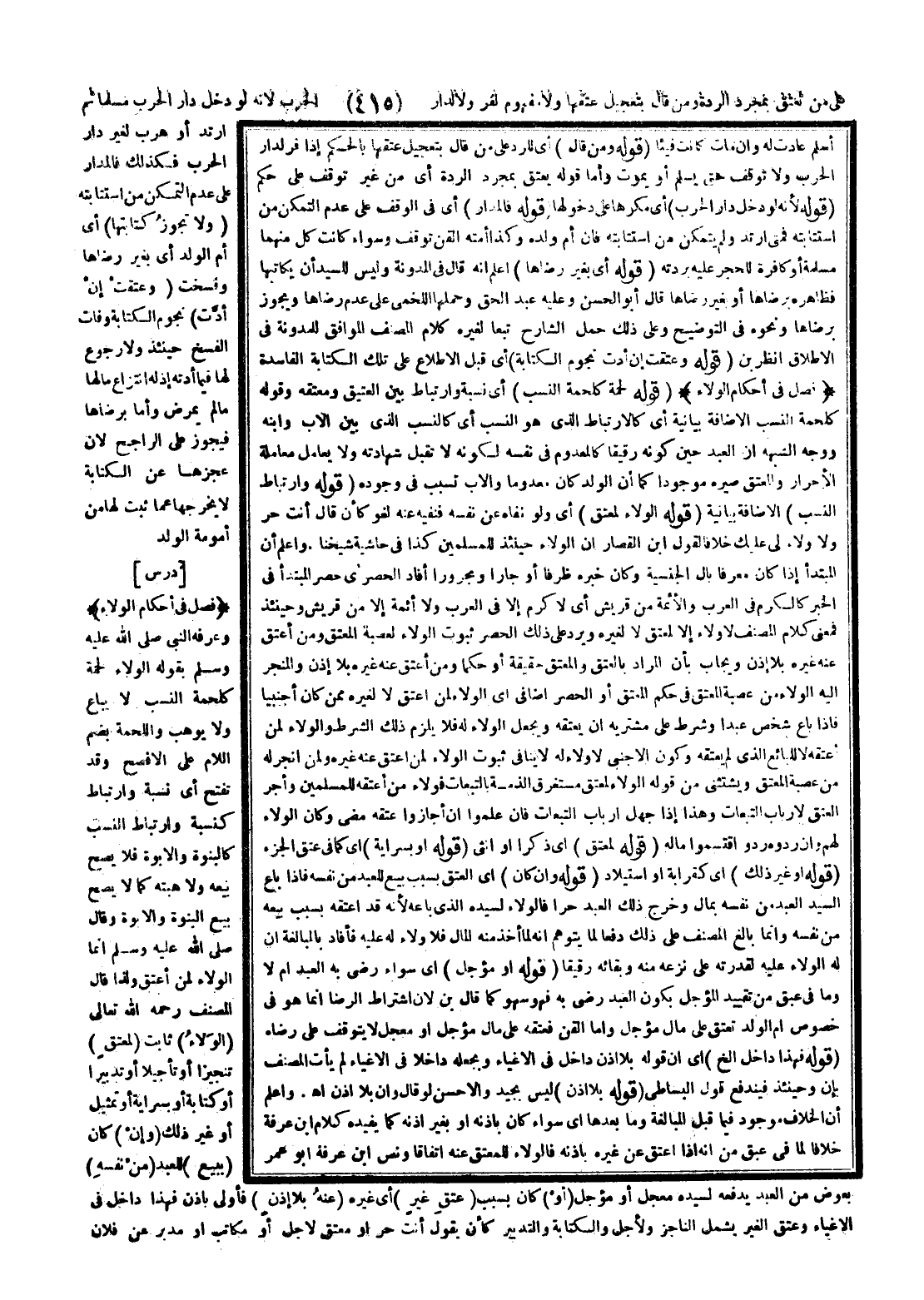 (دَرْسٌ) (فَصْلٌ فِي أَحْكَامِ الْوَلَاءِ) وَعَرَّفَهُ النَّبِيُّ - صَلَّى اللَّهُ عَلَيْهِ وَسَلَّمَ - بِقَوْلِهِ «الْوَلَاءُ لُحْمَةٌ كَلُحْمَةِ النَّسَبِ لَا يُبَاعُ وَلَا يُوهَبُ» وَاللُّحْمَةُ بِضَمِّ اللَّامِ عَلَى الْأَفْصَحِ وَقَدْ تُفْتَحُ أَيْ نِسْبَةٌ وَارْتِبَاطٌ كَنِسْبَةِ وَارْتِبَاطِ النَّسَبِ كَالْبُنُوَّةِ وَالْأُبُوَّةِ فَلَا يَصِحُّ بَيْعُهُ وَلَا هِبَتُهُ كَمَا لَا يَصِحُّ بَيْعُ الْبُنُوَّةِ وَالْأُبُوَّةِ وَقَالَ - صَلَّى اللَّهُ عَلَيْهِ وَسَلَّمَ - «إنَّمَا الْوَلَاءُ لِمَنْ أَعْتَقَ» وَلِذَا قَالَ الْمُصَنِّفُ - رَحِمَهُ اللَّهُ تَعَالَى - (الْوَلَاءُ) ثَابِتٌ (لِمُعْتِقٍ) تَنْجِيزًا أَوْ تَأْجِيلًا أَوْ تَدْبِيرًا أَوْ كِتَابَةً أَوْ بِسِرَايَةٍ أَوْ تَمْثِيلٍ أَوْ غَيْرِ ذَلِكَ (وَإِنْ) كَانَ (بِبَيْعٍ) لِلْعَبْدِ (مِنْ نَفْسِهِ) بِعِوَضٍ مِنْ الْعَبْدِ يَدْفَعُهُ لِسَيِّدِهِ مُعَجَّلٌ أَوْ مُؤَجَّلٌ (أَوْ) كَانَ بِسَبَبِ (عِتْقِ غَيْرٍ) أَيْ غَيْرِهِ (عَنْهُ بِلَا إذْنٍ) فَأَوْلَى بِإِذْنٍ فَهَذَا دَاخِلٌ فِي الْإِعْيَاءِ، وَعِتْقُ الْغَيْرِ يَشْمَلُ النَّاجِزَ وَلِأَجَلٍ وَالْكِتَابَةَ وَالتَّدْبِيرَ كَأَنْ يَقُولَ أَنْتَ حُرٌّ أَوْ مُعْتَقٌ لِأَجَلٍ أَوْ مُكَاتَبٍ أَوْ مُدَبَّرٍ عَنْ فُلَانٍ