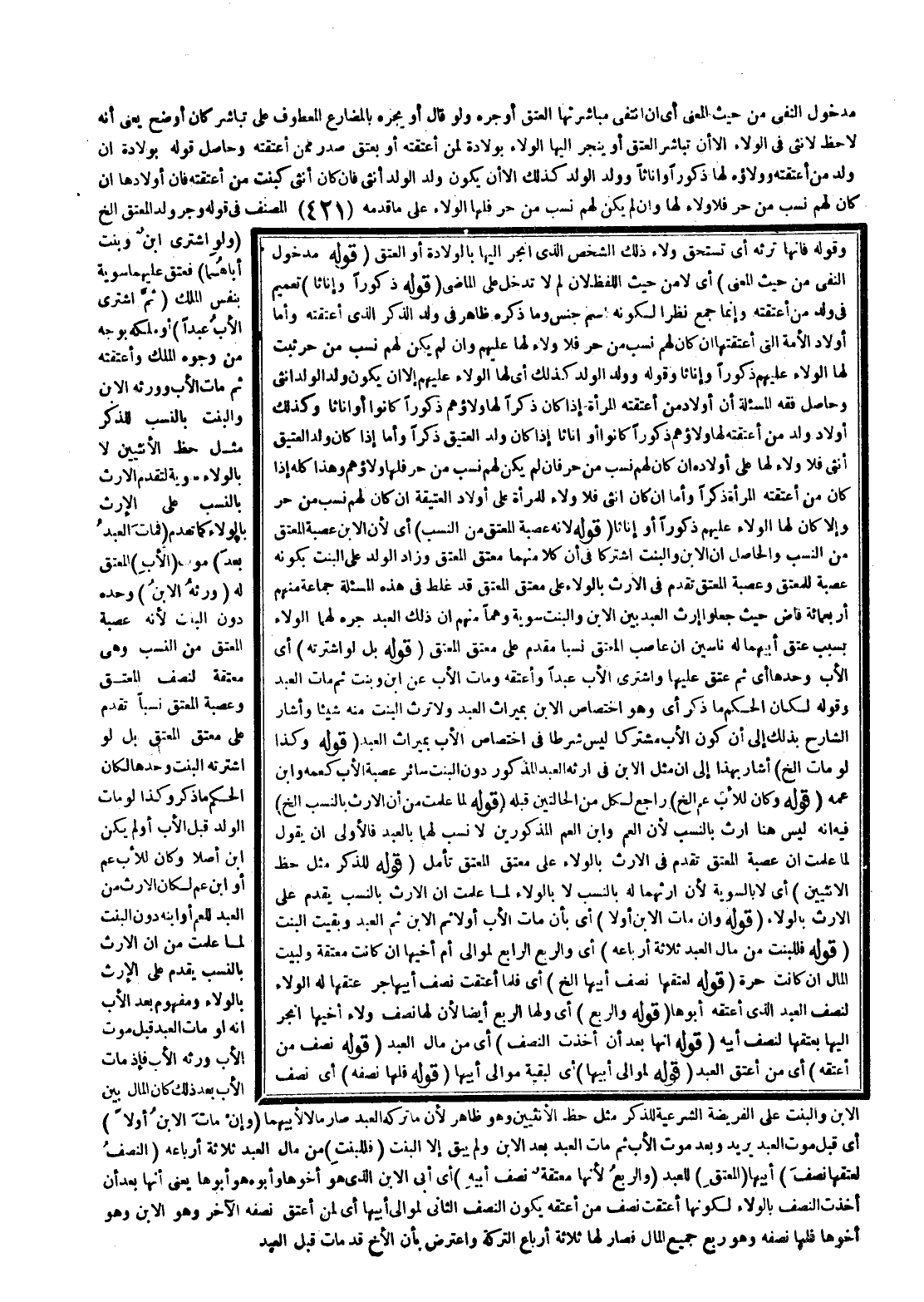 (قَوْلُهُ؛ لِأَنَّهُ عَصَبَةُ الْمُعْتِقِ مِنْ النَّسَبِ) أَيْ؛ لِأَنَّ الِابْنَ عَصَبَةُ الْمُعْتَقِ مِنْ النَّسَبِ وَالْحَاصِلُ أَنَّ الِابْنَ وَالْبِنْتَ اشْتَرَكَا فِي أَنَّ كُلًّا مِنْهُمَا مُعْتِقُ الْمُعْتِقِ وَزَادَ الْوَلَدُ عَلَى الْبِنْتِ بِكَوْنِهِ عَصَبَةً لِلْمُعْتِقِ وَعَصَبَةُ الْمُعْتِقِ تُقَدَّمُ فِي الْإِرْثِ بِالْوَلَاءِ عَلَى مُعْتِقِ الْمُعْتِقِ، قَدْ غَلِطَ فِي هَذِهِ الْمَسْأَلَةِ جَمَاعَةٌ مِنْهُمْ أَرْبَعُمِائَةِ قَاضٍ حَيْثُ جَعَلُوا إرْثَ الْعَبْدِ بَيْنَ الِابْنِ وَالْبِنْتِ سَوِيَّةً وَهْمًا مِنْهُمْ أَنَّ ذَلِكَ الْعَبْدَ جَرَّهُ الْوَلَاءُ لَهُمَا بِسَبَبِ عِتْقِ أَبِيهِمَا لَهُ نَاسِينَ أَنَّ عَاصِبَ الْمُعْتِقِ نَسَبًا مُقَدَّمٌ عَلَى مُعْتِقِ الْمُعْتِقِ.