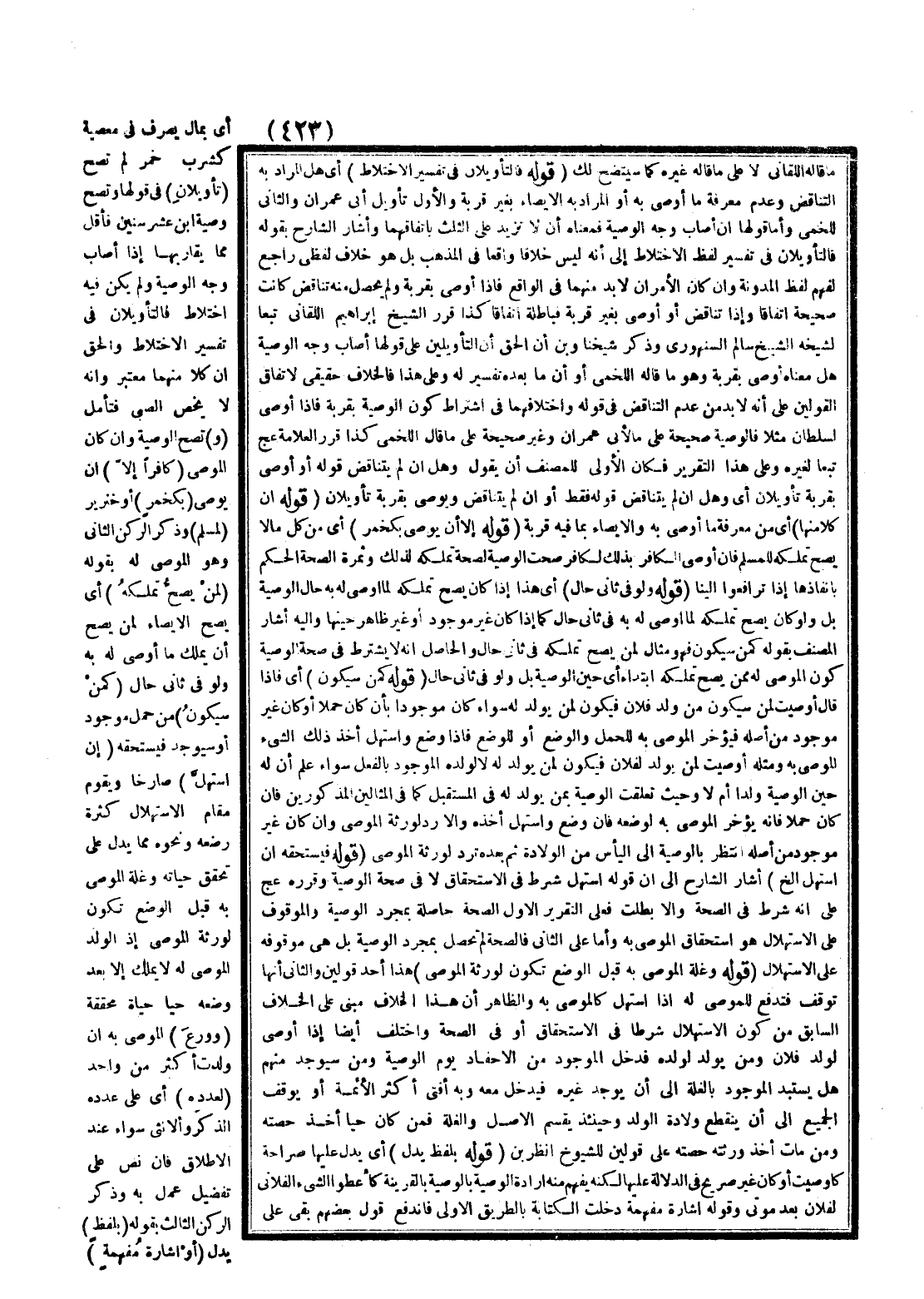 أَيْ بِمَالٍ يُصْرَفُ فِي مَعْصِيَةٍ كَشُرْبِ خَمْرٍ لَمْ تَصِحَّ (تَأْوِيلَانِ) فِي قَوْلِهَا وَتَصِحُّ وَصِيَّةُ ابْن عَشْرِ سِنِينَ فَأَقَلَّ مِمَّا يُقَارِبُهَا إذَا أَصَابَ وَجْهَ الْوَصِيَّةِ وَلَمْ يَكُنْ فِيهِ اخْتِلَاطٌ فَالتَّأْوِيلَانِ فِي تَفْسِيرِ الِاخْتِلَاطِ وَالْحَقُّ أَنَّ كُلًّا مِنْهُمَا مُعْتَبَرٌ وَأَنَّهُ لَا يَخُصُّ الصَّبِيَّ فَتَأَمَّلْ (وَ) تَصِحُّ الْوَصِيَّةُ وَإِنْ كَانَ الْمُوصِي (كَافِرًا إلَّا) أَنْ يُوصِيَ (بَكَخَمْرٍ) أَوْ خِنْزِيرٍ (لِمُسْلِمٍ) .