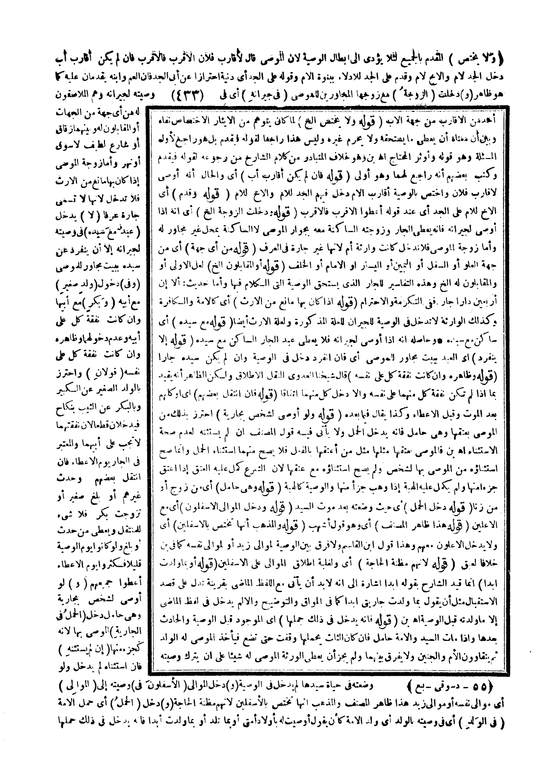 (وَ) دَخَلَتْ (الزَّوْجَةُ) مَعَ زَوْجِهَا الْمُجَاوِرِينَ لِلْمُوصِي (فِي جِيرَانِهِ) أَيْ فِي وَصِيَّتِهِ لِجِيرَانِهِ وَهُمْ الْمُلَاصِقُونَ لَهُ مِنْ أَيِّ جِهَةٍ مِنْ الْجِهَاتِ أَوْ الْمُقَابِلُونَ لَهُ وَبَيْنَهُمَا زُقَاقٌ أَوْ شَارِعٌ لَطِيفٌ لَا سُوقٌ أَوْ نَهْرٌ وَأَمَّا زَوْجَةُ الْمُوصِي إذَا كَانَ بِهَا مَانِعٌ مِنْ الْإِرْثِ فَلَا تَدْخُلُ؛ لِأَنَّهَا لَا تُسَمَّى جَارَةً عُرْفًا (لَا) يَدْخُلُ (عَبْدٌ مَعَ سَيِّدِهِ) فِي وَصِيَّتِهِ لِجِيرَانِهِ إلَّا أَنْ يَنْفَرِدَ عَنْ سَيِّدِهِ بِبَيْتٍ مُجَاوِرٍ لِلْمُوصِي (وَفِي) دُخُولِ (وَلَدٍ صَغِيرٍ) مَعَ أَبِيهِ (وَبِكْرٍ) مَعَ أَبِيهَا وَإِنْ كَانَتْ نَفَقَةُ كُلٍّ عَلَى أَبِيهِ وَعَدَمُ دُخُولِهِمَا وَظَاهِرُهُ وَإِنْ كَانَتْ نَفَقَةُ كُلٍّ عَلَى نَفْسِهِ (قَوْلَانِ) وَاحْتَرَزَ بِالْوَلَدِ الصَّغِيرِ عَنْ الْكَبِيرِ وَبِالْبِكْرِ عَنْ الثَّيِّبِ بِنِكَاحٍ فَيَدْخُلَانِ قَطْعًا؛ لِأَنَّ نَفَقَتَهُمَا لَا تَجِبُ عَلَى أَبِيهِمَا وَالْمُعْتَبَرُ فِي الْجَارِ يَوْمُ الْإِعْطَاءِ فَإِنْ انْتَقَلَ بَعْضُهُمْ وَحَدَثَ غَيْرُهُمْ أَوْ بَلَغَ صَغِيرٌ أَوْ تَزَوَّجَتْ بِكْرٌ فَلَا شَيْءَ لِلْمُنْتَقِلِ وَيُعْطِي مَنْ حَدَثَ أَوْ بَلَغَ وَلَوْ كَانُوا يَوْمَ الْوَصِيَّةِ قَلِيلًا فَكَثُرُوا يَوْمَ الْإِعْطَاءِ أُعْطُوا جَمِيعُهُمْ.