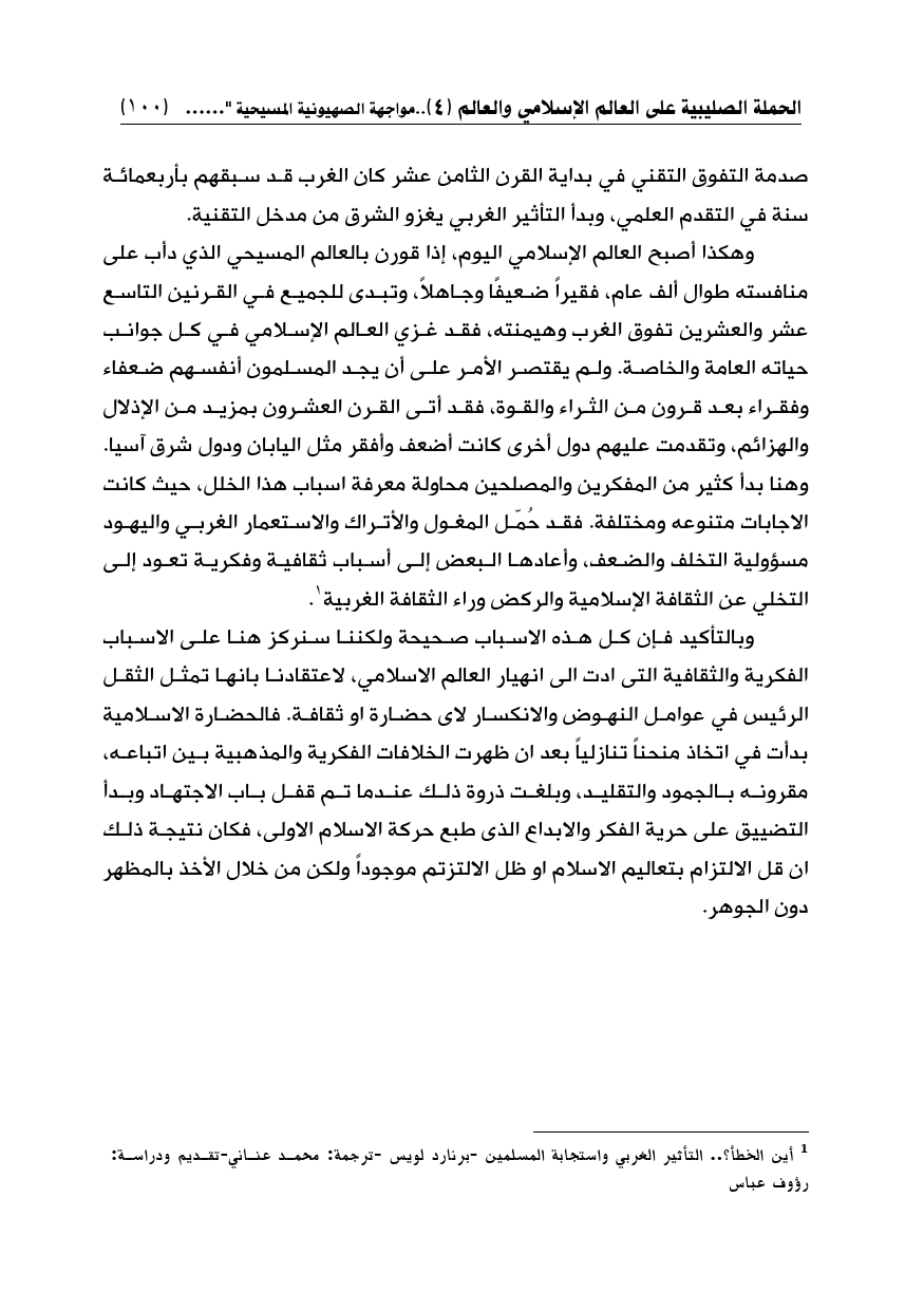 وهكذا أصبح العالم الإسلامي اليوم، إذا قورن بالعالم المسيحي الذي دأب على منافسته طوال ألف عام، فقيراً ضعيفًا وجاهلاً، وتبدى للجميع في القرنين التاسع عشر والعشرين تفوق الغرب وهيمنته، فقد غزي العالم الإسلامي في كل جوانب حياته العامة والخاصة. ولم يقتصر الأمر على أن يجد المسلمون أنفسهم ضعفاء وفقراء بعد قرون من الثراء والقوة، فقد أتى القرن العشرون بمزيد من الإذلال والهزائم، وتقدمت عليهم دول أخرى كانت أضعف وأفقر مثل اليابان ودول شرق آسيا. وهنا بدأ كثير من المفكرين والمصلحين محاولة معرفة اسباب هذا الخلل، حيث كانت الاجابات متنوعه ومختلفة. فقد حُمّل المغول والأتراك والاستعمار الغربي واليهود مسؤولية التخلف والضعف، وأعادها البعض إلى أسباب ثقافية وفكرية تعود إلى التخلي عن الثقافة الإسلامية والركض وراء الثقافة الغربية (¬1).