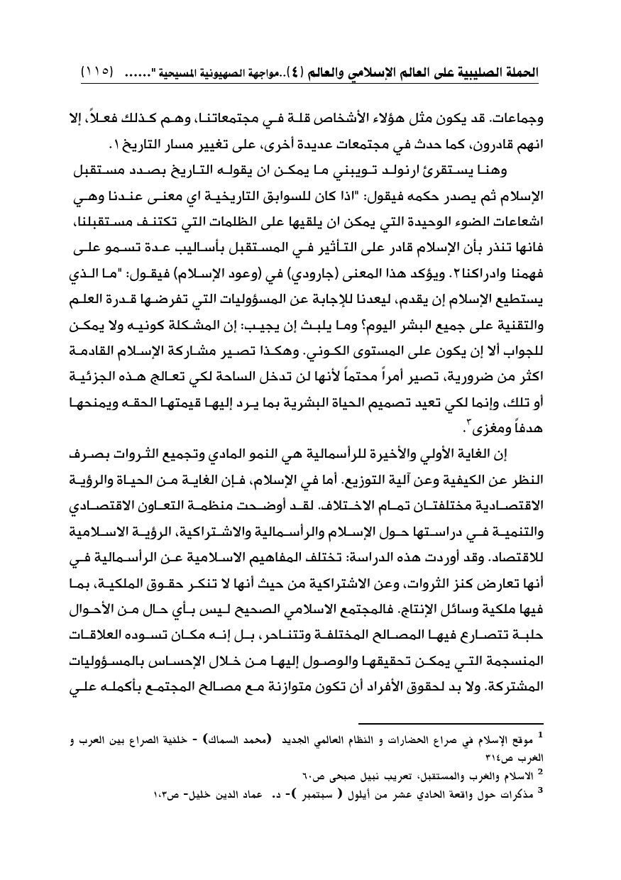 وهنا يستقرئ ارنولد تويبني ما يمكن ان يقوله التاريخ بصدد مستقبل الإسلام ثم يصدر حكمه فيقول: "إذا كان للسوابق التاريخية اي معنى عندنا وهي اشعاعات الضوء الوحيدة التي يمكن ان يلقيها على الظلمات التي تكتنف مستقبلنا، فانها تنذر بأن الإسلام قادر على التأثير في المستقبل بأساليب عدة تسمو على فهمنا وادراكنا (¬2). ويؤكد هذا المعنى (جارودي) في (وعود الإسلام) فيقول: "ما الذي يستطيع الإسلام إن يقدم، ليعدنا للإجابة عن المسؤوليات التي تفرضها قدرة العلم والتقنية على جميع البشر اليوم؟ وما يلبث إن يجيب: إن المشكلة كونيه ولا يمكن للجواب ألا إن يكون على المستوى الكوني. وهكذا تصير مشاركة الإسلام القادمة اكثر من ضرورية، تصير أمراً محتماً لأنها لن تدخل الساحة لكي تعالج هذه الجزئية أو تلك، وإنما لكي تعيد تصميم الحياة البشرية بما يرد إليها قيمتها الحقه ويمنحها هدفاً ومغزى (¬3).