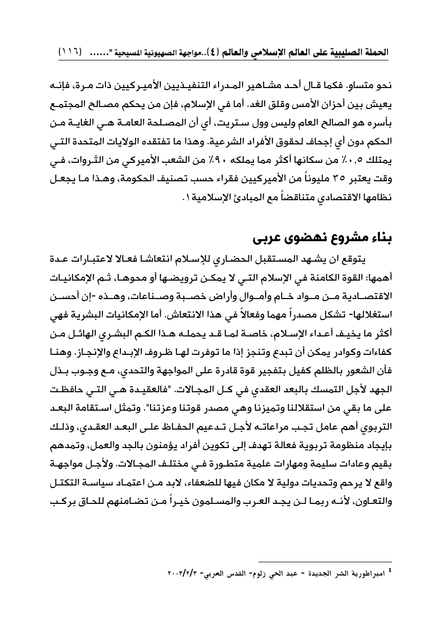 نحو متساوٍ. فكما قال أحد مشاهير المدراء التنفيذيين الأميركيين ذات مرة، فإنه يعيش بين أحزان الأمس وقلق الغد. أما في الإسلام، فإن من يحكم مصالح المجتمع بأسره هو الصالح العام وليس وول ستريت، أي أن المصلحة العامة هي الغاية من الحكم دون أي إجحاف لحقوق الأفراد الشرعية. وهذا ما تفتقده الولايات المتحدة التي يمتلك 0.5% من سكانها أكثر مما يملكه 90% من الشعب الأميركي من الثروات، في وقت يعتبر 35 مليوناً من الأميركيين فقراء حسب تصنيف الحكومة، وهذا ما يجعل نظامها الاقتصادي متناقضاً مع المبادئ الإسلامية (¬1).