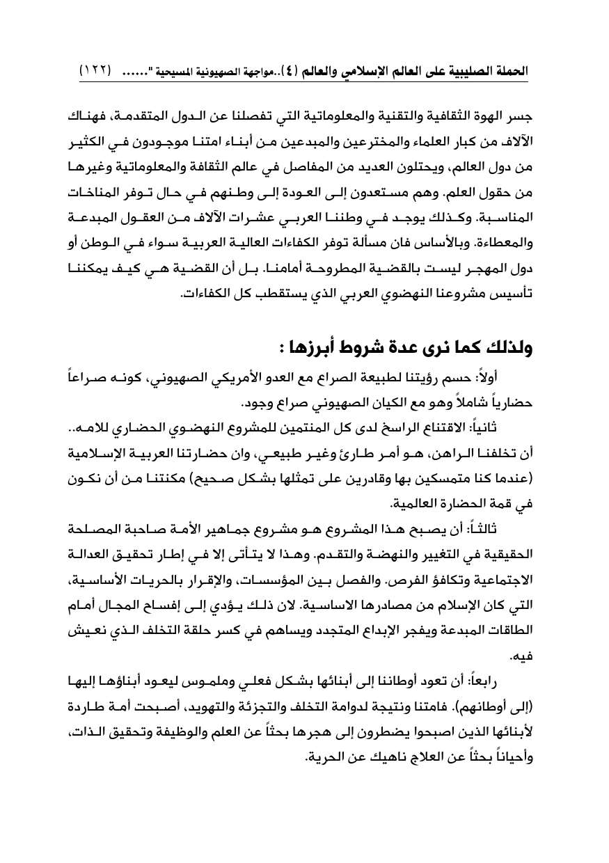 جسر الهوة الثقافية والتقنية والمعلوماتية التي تفصلنا عن الدول المتقدمة، فهناك الآلاف من كبار العلماء والمخترعين والمبدعين من أبناء امتنا موجودون في الكثير من دول العالم، ويحتلون العديد من المفاصل في عالم الثقافة والمعلوماتية وغيرها من حقول العلم. وهم مستعدون إلى العودة إلى وطنهم في حال توفر المناخات المناسبة. وكذلك يوجد في وطننا العربي عشرات الآلاف من العقول المبدعة والمعطاءة. وبالأساس فان مسألة توفر الكفاءات العالية العربية سواء في الوطن أو دول المهجر ليست بالقضية المطروحة أمامنا. بل أن القضية هي كيف يمكننا تأسيس مشروعنا النهضوي العربي الذي يستقطب كل الكفاءات.