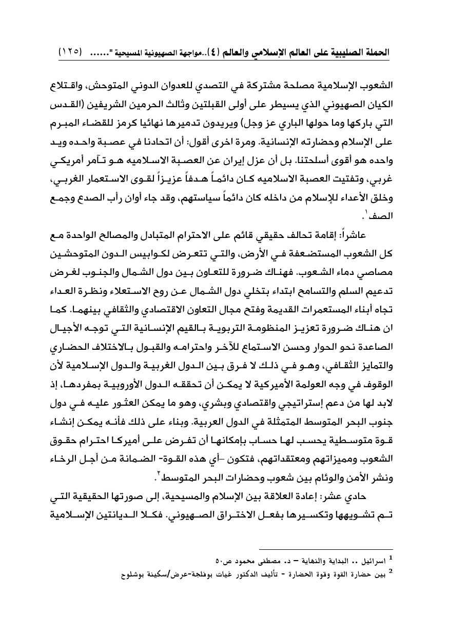 حادي عشر: إعادة العلاقة بين الإسلام والمسيحية، إلى صورتها الحقيقية التي تم تشويهها وتكسيرها بفعل الاختراق الصهيوني. فكلا الديانتين الإسلامية