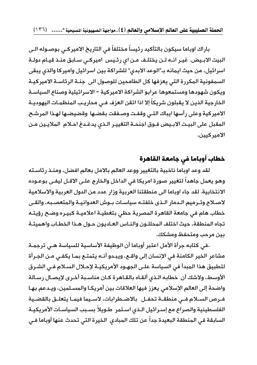 في كتابه جرأة الأمل اعتبر أوباما أن الوظيفة الأساسية للسياسة هي ترجمة مشاعر الخير الكامنة في الإنسان إلى واقع، ويبدو أنه يتمتع بما يكفي من الجرأة لتطبيق هذا المبدأ في السياسة على الجهود الأمريكية لإحلال السلام في الشرق الأوسط، ولاشك أن خطابه الذي ألقاه بالقاهرة كان مناسبة أخرى لإيصال رسالة واضحة إلى العالم الإسلامي يعزز فيها العلاقات بين أمريكا والمسلمين، ويدعم بها فرص السلام في منطقة تحفل بالاضطرابات، لاسيما فيما يتعلق بالقضية الفلسطينية والصراع مع إسرائيل الذي استمر طويلاً بسبب السياسات الأمريكية السابقة في المنطقة البعيدة جداً عن تلك المبادي الخيرة التي تحدث عنها أوباما في