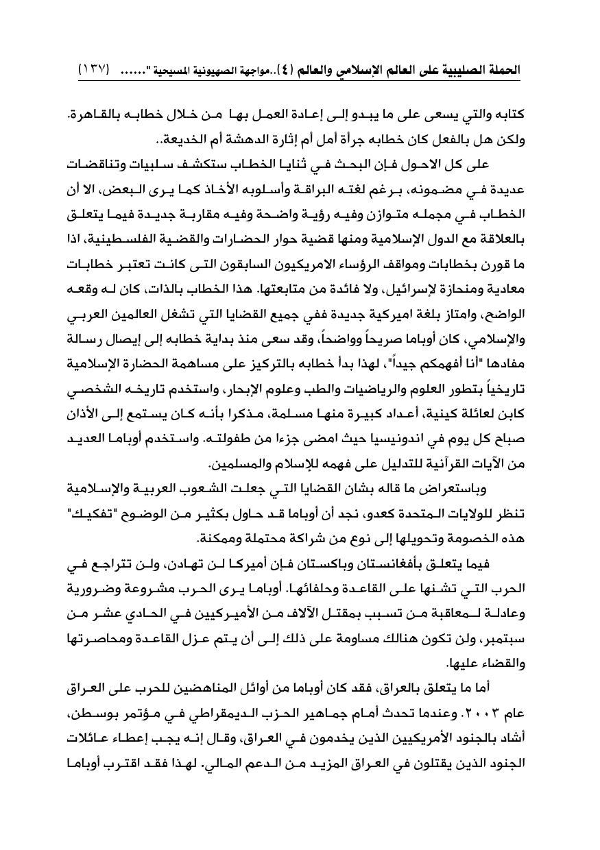 كتابه والتي يسعى على ما يبدو إلى إعادة العمل بها من خلال خطابه بالقاهرة. ولكن هل بالفعل كان خطابه جرأة أمل أم إثارة الدهشة أم الخديعة ..
