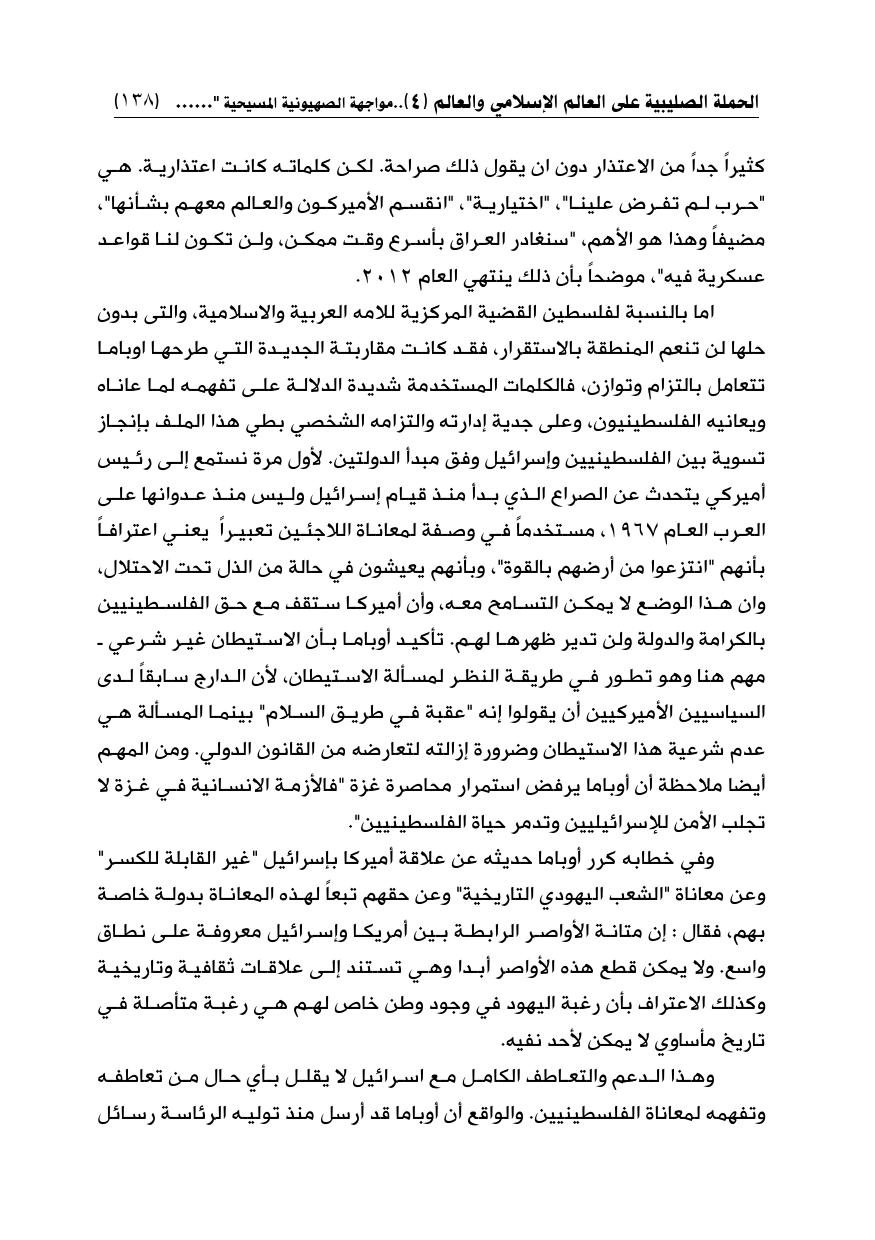 اما بالنسبة لفلسطين القضية المركزية للامه العربية والإسلامية، والتى بدون حلها لن تنعم المنطقة بالاستقرار، فقد كانت مقاربتة الجديدة التي طرحها اوباما تتعامل بالتزام وتوازن، فالكلمات المستخدمة شديدة الدلالة على تفهمه لما عاناه ويعانيه الفلسطينيون، وعلى جدية إدارته والتزامه الشخصي بطي هذا الملف بإنجاز تسوية بين الفلسطينيين وإسرائيل وفق مبدأ الدولتين. لأول مرة نستمع إلى رئيس أميركي يتحدث عن الصراع الذي بدأ منذ قيام إسرائيل وليس منذ عدوانها على العرب العام 1967، مستخدماً في وصفة لمعاناة اللاجئين تعبيراً يعني اعترافاً بأنهم "انتزعوا من أرضهم بالقوة"، وبأنهم يعيشون في حالة من الذل تحت الاحتلال، وان هذا الوضع لا يمكن التسامح معه، وأن أميركا ستقف مع حق الفلسطينيين بالكرامة والدولة ولن تدير ظهرها لهم. تأكيد أوباما بأن الاستيطان غير شرعي ـ مهم هنا وهو تطور في طريقة النظر لمسألة الاستيطان، لأن الدارج سابقاً لدى السياسيين الأميركيين أن يقولوا إنه "عقبة في طريق السلام" بينما المسألة هي عدم شرعية هذا الاستيطان وضرورة إزالته لتعارضه من القانون الدولي. ومن المهم أيضا ملاحظة أن أوباما يرفض استمرار محاصرة غزة "فالأزمة الانسانية في غزة لا تجلب الأمن للإسرائيليين وتدمر حياة الفلسطينيين".