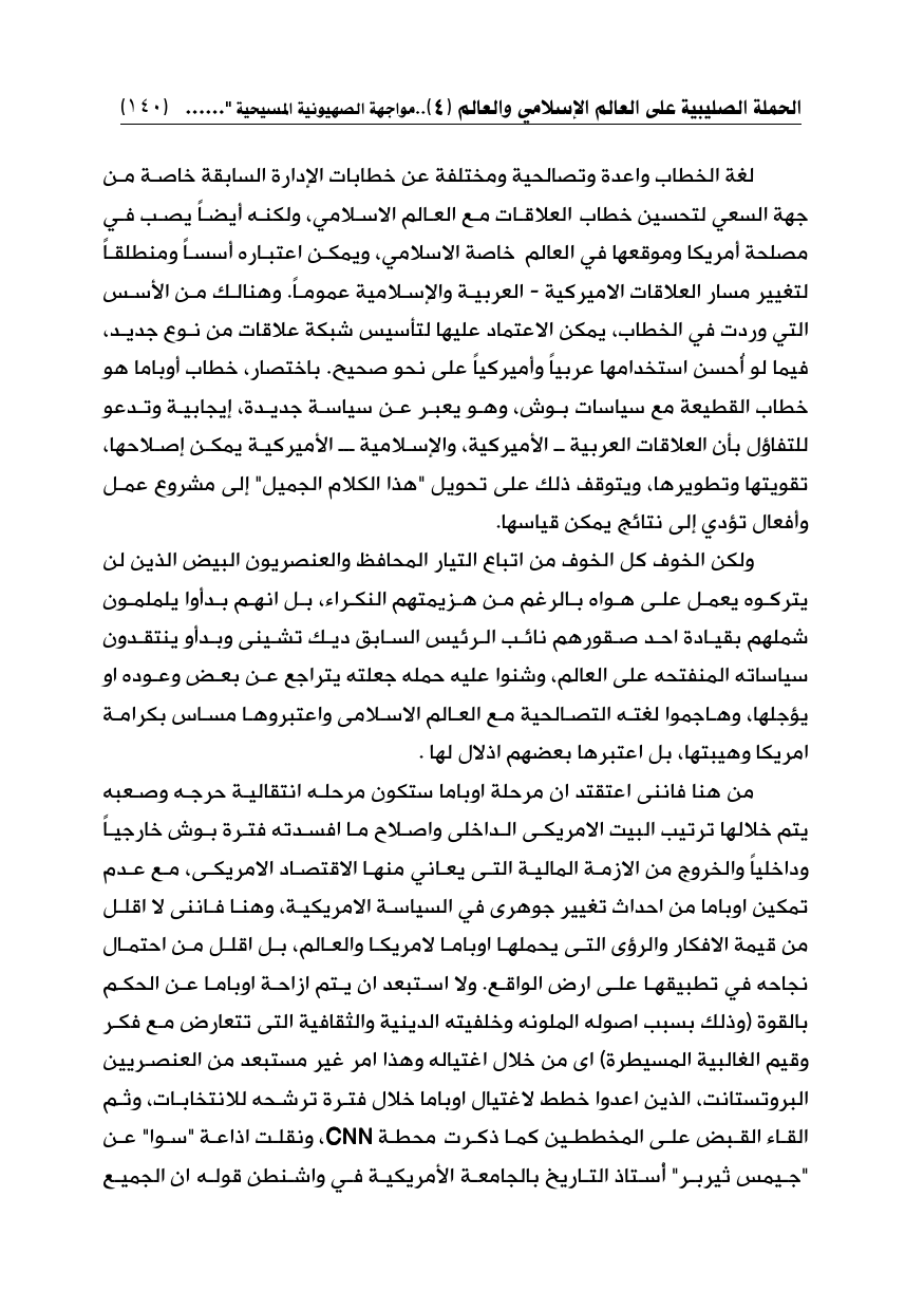 لغة الخطاب واعدة وتصالحية ومختلفة عن خطابات الإدارة السابقة خاصة من جهة السعي لتحسين خطاب العلاقات مع العالم الإسلامي، ولكنه أيضاً يصب في مصلحة أمريكا وموقعها في العالم خاصة الإسلامي، ويمكن اعتباره أسساً ومنطلقاً لتغيير مسار العلاقات الاميركية - العربية والإسلامية عموماً. وهنالك من الأسس التي وردت في الخطاب، يمكن الاعتماد عليها لتأسيس شبكة علاقات من نوع جديد، فيما لو أُحسن استخدامها عربياً وأميركياً على نحو صحيح. باختصار، خطاب أوباما هو خطاب القطيعة مع سياسات بوش، وهو يعبر عن سياسة جديدة، إيجابية وتدعو للتفاؤل بأن العلاقات العربية ــ الأميركية، والإسلامية ــ الأميركية يمكن إصلاحها، تقويتها وتطويرها، ويتوقف ذلك على تحويل "هذا الكلام الجميل" إلى مشروع عمل وأفعال تؤدي إلى نتائج يمكن قياسها.