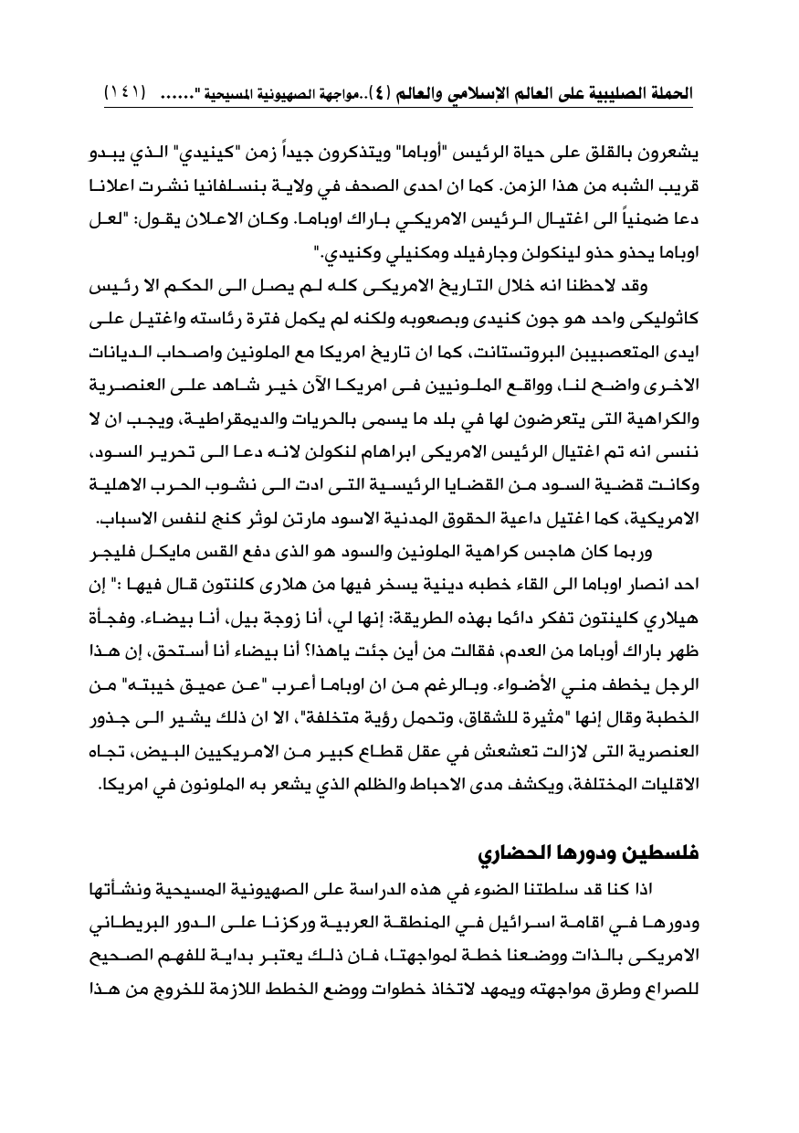 وقد لاحظنا انه خلال التاريخ الامريكى كله لم يصل إلى الحكم الا رئيس كاثوليكى واحد هو جون كنيدى وبصعوبه ولكنه لم يكمل فترة رئاسته واغتيل على ايدى المتعصبيبن البروتستانت، كما ان تاريخ أمريكا مع الملونين واصحاب الديانات الاخرى واضح لنا، وواقع الملونيين في أمريكا الآن خير شاهد على العنصرية والكراهية التى يتعرضون لها في بلد ما يسمى بالحريات والديمقراطية، ويجب ان لا ننسى انه تم اغتيال الرئيس الامريكى ابراهام لنكولن لانه دعا إلى تحرير السود، وكانت قضية السود من القضايا الرئيسية التى ادت إلى نشوب الحرب الاهلية الأمريكية، كما اغتيل داعية الحقوق المدنية الاسود مارتن لوثر كنج لنفس الاسباب.