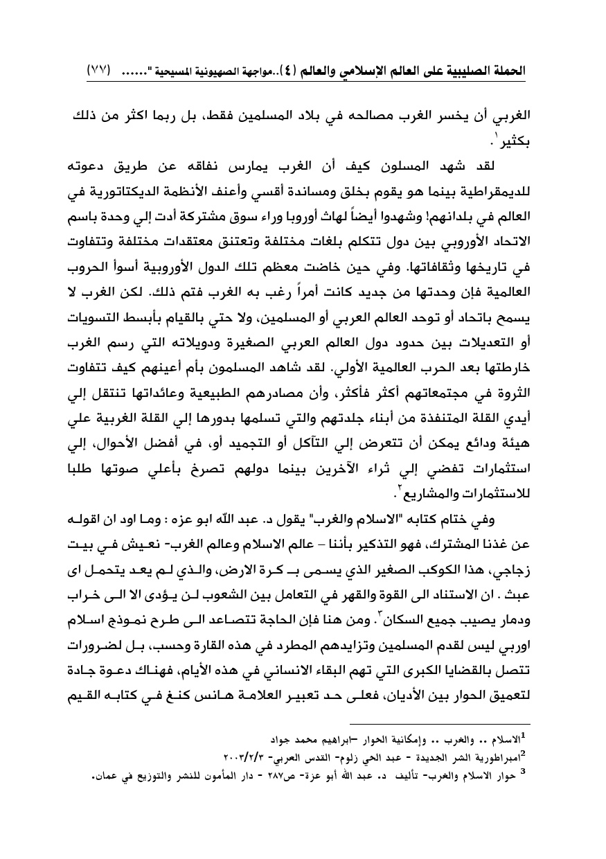 (¬3) حوار الإسلام والغرب- تأليف د. عبد الله أبو عزة- ص287 - دار المأمون للنشر والتوزيع في عمان.