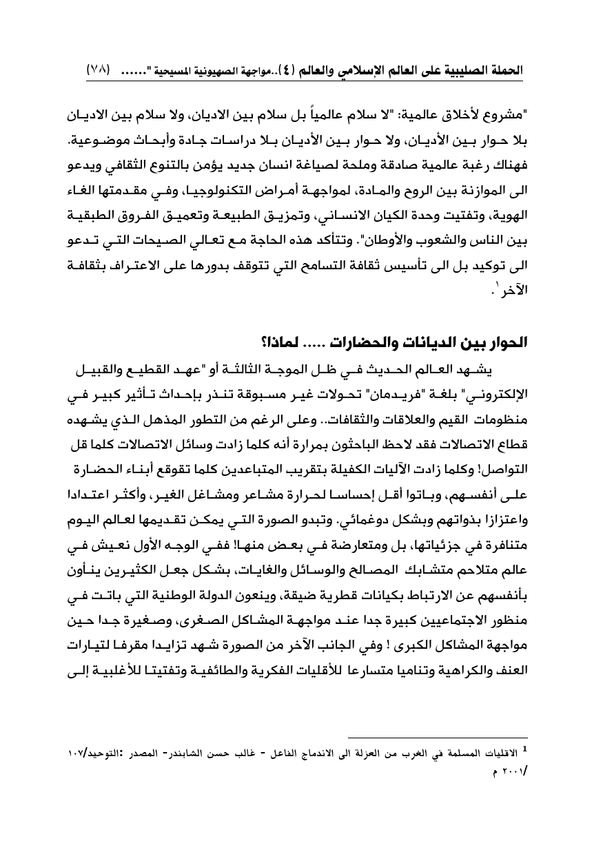 (¬1) الاقليات المسلمة في الغرب من العزلة إلى الاندماج الفاعل - غالب حسن الشابندر- المصدر: التوحيد/107/ 2001 م
