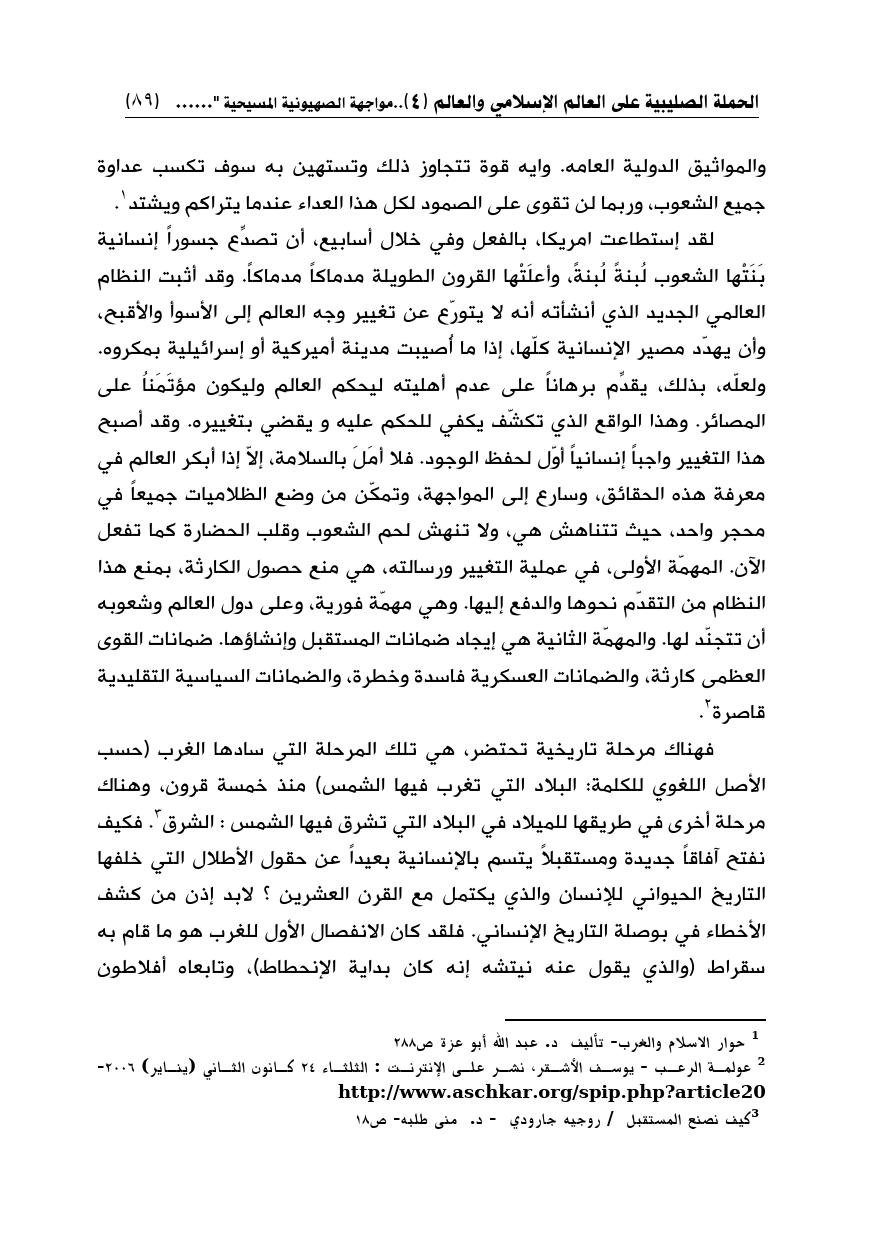 لقد إستطاعت أمريكا، بالفعل وفي خلال أسابيع، أن تصدِّع جسوراً إنسانية بَنَتْها الشعوب لُبنةً لُبنةً، وأعلَتْها القرون الطويلة مدماكاً مدماكاً. وقد أثبت النظام العالمي الجديد الذي أنشأته أنه لا يتورّع عن تغيير وجه العالم إلى الأسوأ والأقبح، وأن يهدّد مصير الإنسانية كلّها، إذا ما أُصيبت مدينة أميركية أو إسرائيلية بمكروه. ولعلّه، بذلك، يقدِّم برهاناً على عدم أهليته ليحكم العالم وليكون مؤتَمَناُ على المصائر. وهذا الواقع الذي تكشّف يكفي للحكم عليه و يقضي بتغييره. وقد أصبح هذا التغيير واجباً إنسانياً أوّل لحفظ الوجود. فلا أمَلَ بالسلامة، إلاّ إذا أبكر العالم في معرفة هذه الحقائق، وسارع إلى المواجهة، وتمكّن من وضع الظلاميات جميعاً في محجر واحد، حيث تتناهش هي، ولا تنهش لحم الشعوب وقلب الحضارة كما تفعل الآن. المهمّة الأولى، في عملية التغيير ورسالته، هي منع حصول الكارثة، بمنع هذا النظام من التقدّم نحوها والدفع إليها. وهي مهمّة فورية، وعلى دول العالم وشعوبه أن تتجنّد لها. والمهمّة الثانية هي إيجاد ضمانات المستقبل وإنشاؤها. ضمانات القوى العظمى كارثة، والضمانات العسكرية فاسدة وخطرة، والضمانات السياسية التقليدية قاصرة (¬2).