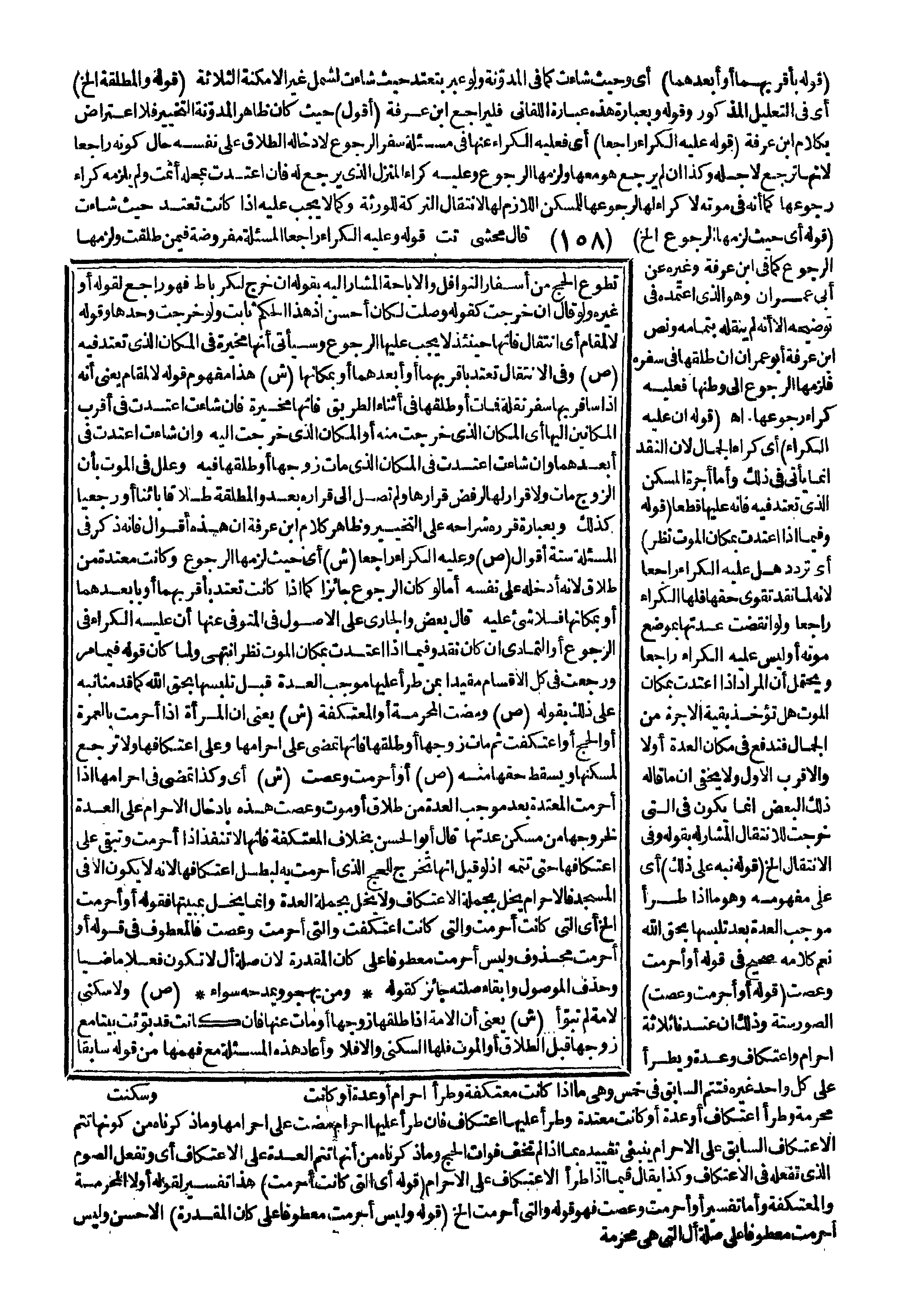 بِقَوْلِهِ (ص) وَمَضَتْ الْمُحْرِمَةُ أَوْ الْمُعْتَكِفَةُ (ش) يَعْنِي أَنَّ الْمَرْأَةَ إذَا أَحْرَمَتْ بِالْعُمْرَةِ أَوْ الْحَجِّ أَوْ اعْتَكَفَتْ ثُمَّ مَاتَ زَوْجُهَا أَوْ طَلَّقَهَا فَإِنَّهَا تَمْضِي عَلَى إحْرَامِهَا وَعَلَى اعْتِكَافِهَا وَلَا تَرْجِعُ لِمَسْكَنِهَا وَيَسْقُطُ حَقُّهَا مِنْهُ (ص) أَوْ أَحْرَمَتْ وَعَصَتْ (ش) أَيْ وَكَذَا تَمْضِي فِي إحْرَامِهَا إذَا أَحْرَمَتْ الْمُعْتَدَّةُ بَعْدَ مُوجِبِ الْعِدَّةِ مِنْ طَلَاقٍ أَوْ مَوْتٍ وَعَصَتْ هَذِهِ بِإِدْخَالِ الْإِحْرَامِ عَلَى الْعِدَّةِ لِخُرُوجِهَا مِنْ مَسْكَنِ عِدَّتِهَا قَالَ أَبُو الْحَسَنِ بِخِلَافِ الْمُعْتَكِفَةِ فَإِنَّهَا لَا تَنْفُذُ إذَا أَحْرَمَتْ وَتَبْقَى عَلَى اعْتِكَافِهَا حَتَّى تُتِمَّهُ إذْ لَوْ قِيلَ أَنَّهَا تَخْرُجُ لِلْحَجِّ الَّذِي أَحْرَمَتْ بِهِ لَبَطَلَ اعْتِكَافُهَا؛ لِأَنَّهُ لَا يَكُونُ إلَّا فِي الْمَسْجِدِ فَالْإِحْرَامُ يُخِلُّ بِجُمْلَةِ الِاعْتِكَافِ وَلَا يُخِلُّ بِجُمْلَةِ الْعِدَّةِ وَإِنَّمَا يُخِلُّ بِمَبِيتِهَا فَقَوْلُهُ أَوْ أَحْرَمَتْ إلَخْ أَيْ الَّتِي كَانَتْ أَحْرَمَتْ وَاَلَّتِي كَانَتْ اعْتَكَفَتْ وَاَلَّتِي أَحْرَمَتْ وَعَصَتْ فَالْمَعْطُوفُ فِي قَوْلِهِ أَوْ أَحْرَمَتْ مَحْذُوفٌ وَلَيْسَ أَحْرَمَتْ مَعْطُوفًا عَلَى كَانَ الْمُقَدَّرَةِ؛ لِأَنَّ صِلَةَ أَلْ لَا تَكُونُ فِعْلًا مَاضِيًا وَحَذْفُ الْمَوْصُولِ وَإِبْقَاءُ صِلَتِهِ جَائِزٌ كَقَوْلِهِ