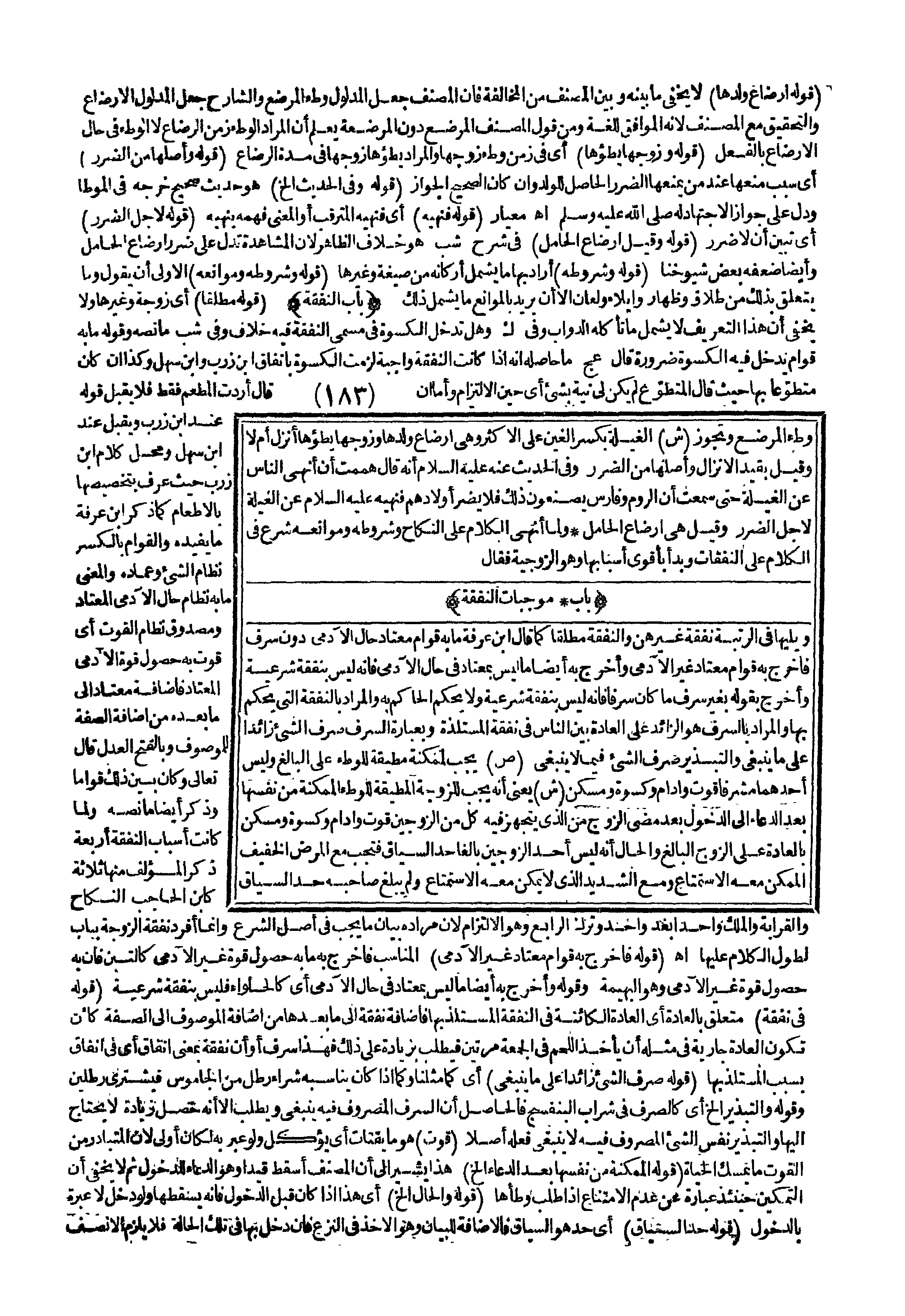 وَلَمَّا أَنْهَى الْكَلَامَ عَنْ النِّكَاحِ وَشُرُوطِهِ وَمَوَانِعِهِ شَرَعَ فِي الْكَلَامِ عَلَى النَّفَقَاتِ وَبَدَأَ بِأَقْوَى أَسْبَابِهَا وَهُوَ الزَّوْجِيَّةُ فَقَالَ (بَابُ مُوجِبَاتِ النَّفَقَةِ) وَيَلِيهَا فِي الرُّتْبَةِ نَفَقَةُ غَيْرِهِنَّ وَالنَّفَقَةُ مُطْلَقًا كَمَا قَالَ ابْنُ عَرَفَةَ مَا بِهِ قِوَامٌ مُعْتَادٌ حَالَ الْآدَمِيِّ دُونَ سَرَفٍ فَأَخْرَجَ بِهِ قِوَامَ مُعْتَادٍ غَيْرَ الْآدَمِيِّ وَأَخْرَجَ بِهِ أَيْضًا مَا لَيْسَ بِمُعْتَادٍ فِي حَالِ الْآدَمِيِّ فَإِنَّهُ لَيْسَ بِنَفَقَةٍ شَرْعِيَّةٍ وَأَخْرَجَ بِقَوْلِهِ بِغَيْرِ سَرَفٍ مَا كَانَ سَرَفًا فَإِنَّهُ لَيْسَ بِنَفَقَةٍ شَرْعِيَّةٍ وَلَا يَحْكُمُ الْحَاكِمُ بِهِ وَالْمُرَادُ بِالنَّفَقَةِ الَّتِي يَحْكُمُ بِهَا وَالْمُرَادُ بِالسَّرَفِ وَهُوَ الزَّائِدُ عَلَى الْعَادَةِ بَيْنَ النَّاسِ فِي نَفَقَةِ الْمُسْتَلَذَّةِ وَبِعِبَارَةِ السَّرَفِ صَرْفُ الشَّيْءِ زَائِدًا عَلَى مَا يَنْبَغِي وَالتَّبْذِيرُ صَرْفُ الشَّيْءِ فِيمَا لَا يَنْبَغِي (ص) يَجِبُ لِمُمَكِّنَةٍ مُطِيقَةٍ لِلْوَطْءِ عَلَى الْبَالِغِ وَلَيْسَ أَحَدُهُمَا مُشْرِفًا قُوتٌ وَإِدَامٌ وَكِسْوَةٌ وَمَسْكَنٌ (ش) يَعْنِي أَنَّهُ يَجِبُ لِلزَّوْجَةِ الْمُطِيقَةِ لِلْوَطْءِ الْمُمَكِّنَةِ مِنْ نَفْسِهَا بَعْدَ الدُّعَاءِ إلَى الدُّخُولِ بَعْدَ مُضِيِّ الزَّوْجِ مِنْ الَّذِي يَتَجَهَّزُ فِيهِ كُلٌّ مِنْ الزَّوْجَيْنِ قُوتٌ وَإِدَامٌ وَكِسْوَةٌ وَمَسْكَنٌ بِالْعَادَةِ عَلَى الزَّوْجِ الْبَالِغِ وَالْحَالُ أَنَّهُ لَيْسَ أَحَدُ الزَّوْجَيْنِ بَالِغًا حَدَّ السِّيَاقِ فَتَجِبُ مَعَ الْمَرَضِ الْخَفِيفِ الْمُمْكِنِ مَعَهُ الِاسْتِمْتَاعُ وَمَعَ الشَّدِيدِ الَّذِي لَا يُمْكِنُ مَعَهُ الِاسْتِمْتَاعُ وَلَمْ يَبْلُغْ صَاحِبُهُ حَدَّ السِّيَاقِ