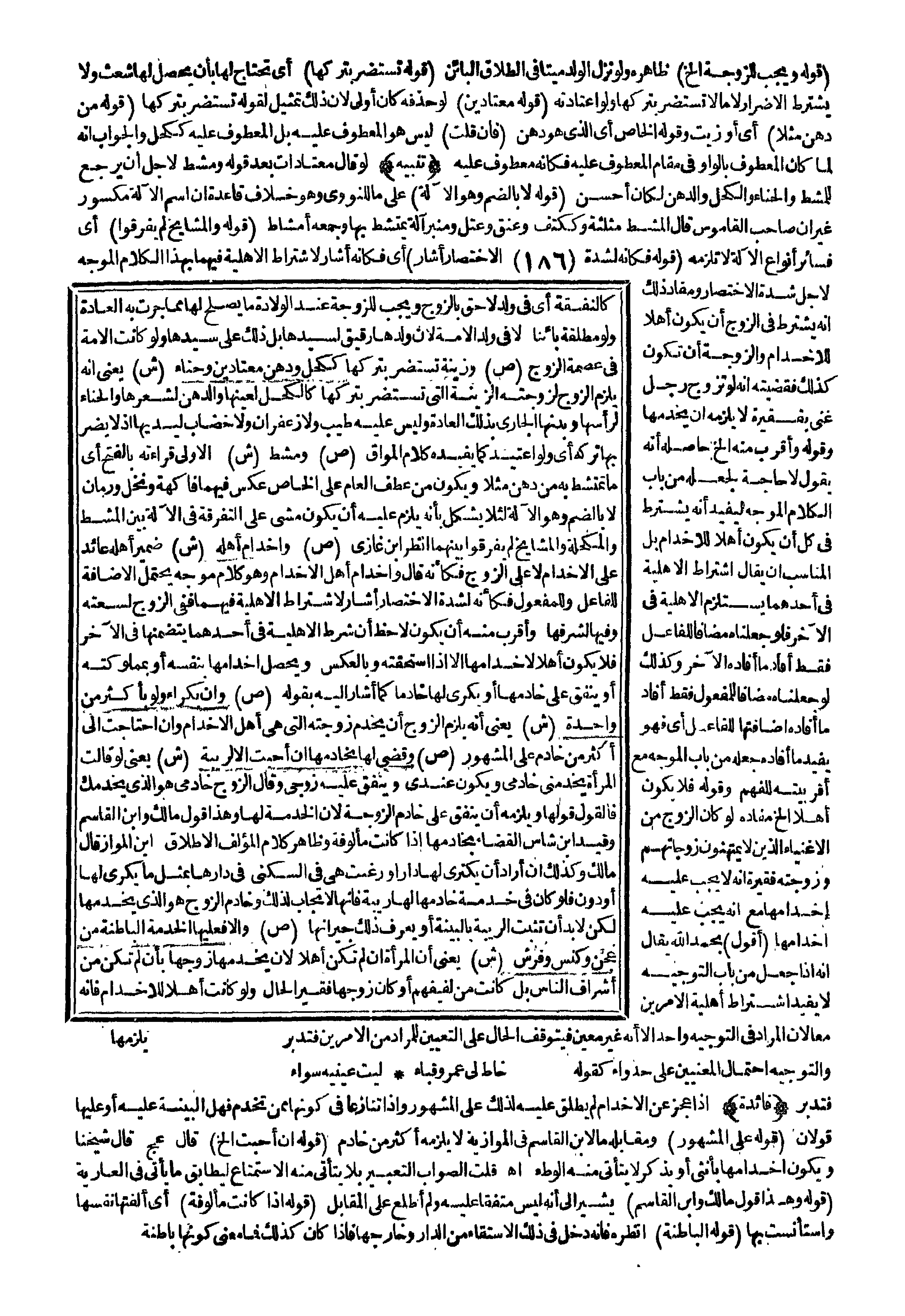 (قَوْلُهُ فَكَأَنَّهُ لِشِدَّةِ الِاخْتِصَارِ أَشَارَ) أَيْ فَكَأَنَّهُ أَشَارَ لِاشْتِرَاطِ الْأَهْلِيَّةِ فِيهِمَا بِهَذَا الْكَلَامِ الْمُوَجَّهِ لِأَجْلِ شِدَّةِ الِاخْتِصَارِ وَمُفَادُ ذَلِكَ أَنَّهُ يُشْتَرَطُ فِي الزَّوْجِ أَنْ يَكُونَ أَهْلًا لِلْإِخْدَامِ وَالزَّوْجَةِ أَنْ تَكُونَ كَذَلِكَ فَقَضِيَّتُهُ أَنَّهُ لَوْ تَزَوَّجَ رَجُلٌ غَنِيٌّ بِفَقِيرَةٍ لَا يَلْزَمُهُ أَنْ يُخْدِمَهَا وَقَوْلُهُ وَأَقْرَبُ مِنْهُ إلَخْ حَاصِلُهُ أَنَّهُ يَقُولُ لَا حَاجَةَ لِجَعْلِهِ مِنْ بَابِ الْكَلَامِ الْمُوَجَّهِ لِيُفِيدَ أَنَّهُ يُشْتَرَطُ فِي كُلٍّ أَنْ يَكُونَ أَهْلًا لِلْإِخْدَامِ بَلْ الْمُنَاسِبُ أَنْ يُقَالَ اشْتِرَاطُ الْأَهْلِيَّةِ فِي أَحَدِهِمَا يَسْتَلْزِمُ الْأَهْلِيَّةَ فِي الْآخَرِ فَلَوْ جَعَلْنَاهُ مُضَافًا لِلْفَاعِلِ فَقَطْ أَفَادَ مَا أَفَادَهُ الْآخَرُ وَكَذَلِكَ لَوْ جَعَلْنَاهُ مُضَافًا لِلْمَفْعُولِ فَقَطْ أَفَادَ مَا أَفَادَهُ إضَافَتُهَا لِلْفَاعِلِ أَيْ فَهُوَ يُفِيدُ مَا أَفَادَهُ جَعْلُهُ مِنْ بَابِ الْمُوَجَّهِ مَعَ أَقْرَبِيَّتِهِ لِلْفَهْمِ وَقَوْلُهُ فَلَا يَكُونُ أَهْلًا إلَخْ مُفَادُهُ لَوْ كَانَ الزَّوْجُ مِنْ الْأَغْنِيَاءِ الَّذِينَ لَا يَمْتَهِنُونَ زَوْجَاتِهِمْ وَزَوْجَتُهُ فَقِيرَةٌ أَنَّهُ لَا يَجِبُ عَلَيْهِ إخْدَامُهَا مَعَ أَنَّهُ يَجِبُ عَلَيْهِ إخْدَامُهَا (أَقُولُ) بِحَمْدِ اللَّهِ يُقَالُ إنَّهُ إذَا جُعِلَ مِنْ بَابِ التَّوْجِيهِ لَا يُفِيدُ اشْتِرَاطَ أَهْلِيَّةِ الْأَمْرَيْنِ مَعًا لِأَنَّ الْمُرَادَ فِي التَّوْجِيهِ وَاحِدٌ إلَّا أَنَّهُ غَيْرُ مُعَيَّنٍ فَيَتَوَقَّفُ الْحَالُ عَلَى التَّعْيِينِ لِلْمُرَادِ مِنْ الْأَمْرَيْنِ فَتَدَبَّرْ وَالتَّوْجِيهُ احْتِمَالُ الْمَعْنَيَيْنِ عَلَى حَدِّ سَوَاءٍ كَقَوْلِهِ