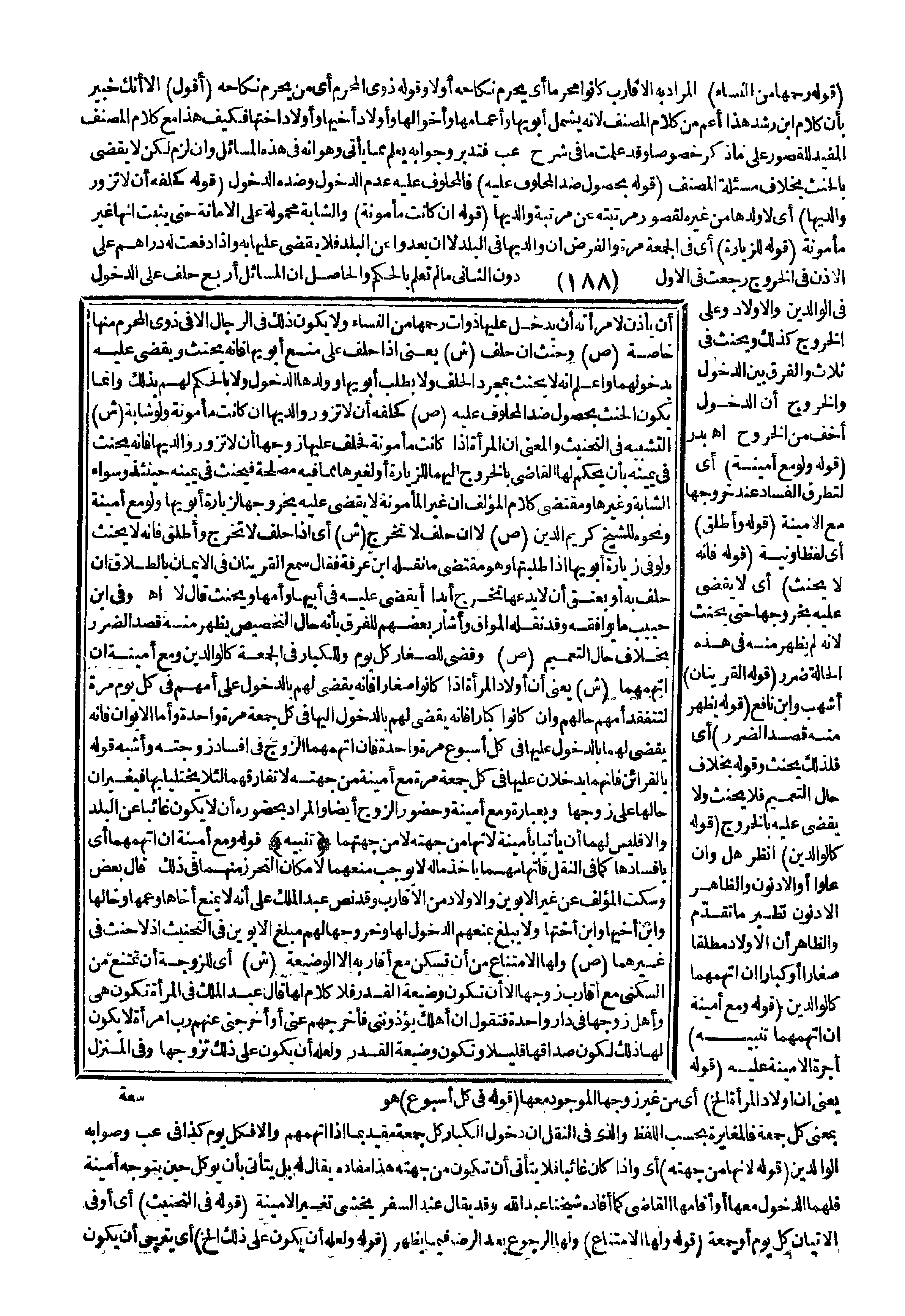 أَنْ يَأْذَنَ لِامْرَأَتِهِ أَنْ يَدْخُلَ عَلَيْهَا ذَوَاتُ رَحِمِهَا مِنْ النِّسَاءِ وَلَا يَكُونُ ذَلِكَ فِي الرِّجَالِ إلَّا فِي ذَوِي الْمَحْرَمِ مِنْهَا خَاصَّةً (ص) وَحَنِثَ إنْ حَلَفَ (ش) يَعْنِي إذَا حَلَفَ عَلَى مَنْعِ أَبَوَيْهَا فَإِنَّهُ يَحْنَثُ وَيُقْضَى عَلَيْهِ بِدُخُولِهِمَا وَاعْلَمْ أَنَّهُ لَا يَحْنَثُ بِمُجَرَّدِ الْحَلِفِ وَلَا بِطَلَبِ أَبَوَيْهَا وَوَلَدِهَا الدُّخُولَ وَلَا بِالْحُكْمِ لَهُمْ بِذَلِكَ وَإِنَّمَا يَكُونُ الْحِنْثُ بِحُصُولِ ضِدِّ الْمَحْلُوفِ عَلَيْهِ (ص) كَحَلِفِهِ أَنْ لَا تَزُورَ وَالِدَيْهَا إنْ كَانَتْ مَأْمُونَةً وَلَوْ شَابَّةً (ش) التَّشْبِيهُ فِي التَّحْنِيثِ وَالْمَعْنَى أَنَّ الْمَرْأَةَ إذَا كَانَتْ مَأْمُونَةً فَحَلَفَ عَلَيْهَا زَوْجُهَا أَنْ لَا تَزُورَ وَالِدَيْهَا فَإِنَّهُ يَحْنَثُ فِي يَمِينِهِ بِأَنْ يَحْكُمَ لَهَا الْقَاضِي بِالْخُرُوجِ إلَيْهِمَا لِلزِّيَارَةِ أَوْ لِغَيْرِهَا مِمَّا فِيهِ مَصْلَحَةٌ فَيَحْنَثُ فِي يَمِينِهِ حِينَئِذٍ وَسَوَاءٌ الشَّابَّةُ وَغَيْرُهَا وَمُقْتَضَى كَلَامِ الْمُؤَلِّفِ أَنَّ غَيْرَ الْمَأْمُونَةِ لَا يُقْضَى عَلَيْهِ بِخُرُوجِهَا لِزِيَارَةِ أَبَوَيْهَا وَلَوْ مَعَ أَمِينَةٍ وَنَحْوُهُ لِلشَّيْخِ كَرِيمِ الدِّينِ (ص) لَا إنْ حَلَفَ لَا تَخْرُجُ (ش) أَيْ إذَا حَلَفَ لَا تَخْرُجُ وَأَطْلَقَ فَإِنَّهُ لَا يَحْنَثُ وَلَوْ فِي زِيَارَةِ أَبَوَيْهَا إذَا طَلَبَتْهَا وَهُوَ مُقْتَضَى مَا نَقَلَهُ ابْنُ عَرَفَةَ فَقَالَ سَمِعَ الْقَرِينَانِ فِي الْأَيْمَانِ بِالطَّلَاقِ إنْ حَلَفَ بِهِ أَوْ بِعِتْقٍ أَنْ لَا يَدَعَهَا تَخْرُجُ أَبَدًا أَيُقْضَى عَلَيْهِ فِي أَبِيهَا وَأُمِّهَا وَيَحْنَثُ قَالَ لَا. اهـ.