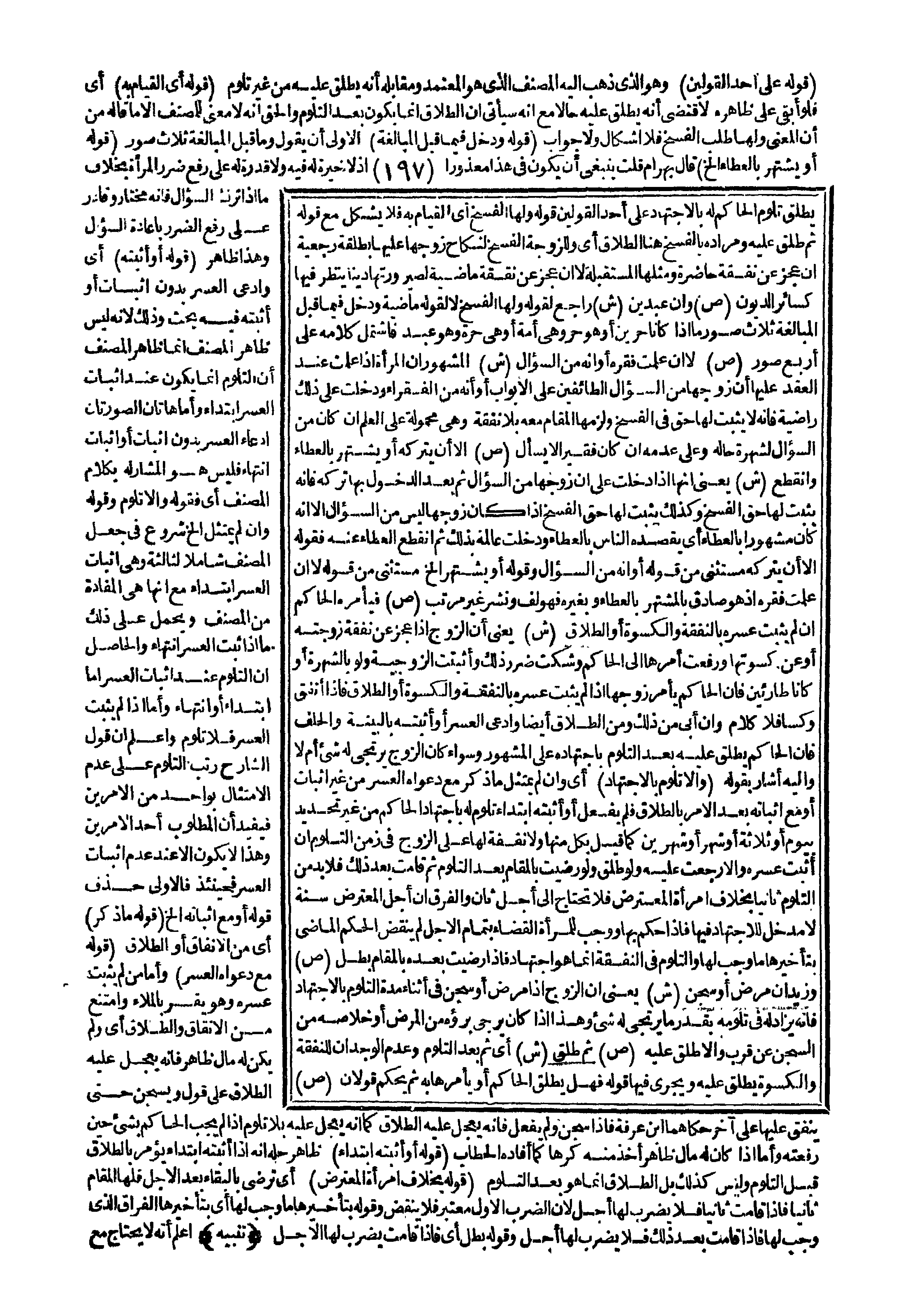 يُطَلِّقْ تَلَوَّمَ الْحَاكِمُ لَهُ بِالِاجْتِهَادِ عَلَى أَحَدِ الْقَوْلَيْنِ قَوْلُهُ وَلَهَا الْفَسْخُ أَيْ الْقِيَامُ بِهِ فَلَا يُشْكِلُ مَعَ قَوْلِهِ ثُمَّ طَلَّقَ عَلَيْهِ وَمُرَادُهُ بِالْفَسْخِ هُنَا الطَّلَاقُ أَيْ وَلِلزَّوْجَةِ الْفَسْخُ لِنِكَاحِ زَوْجِهَا عَلَيْهَا بِطَلْقَةٍ رَجْعِيَّةٍ إنْ عَجَزَ عَنْ نَفَقَةٍ حَاضِرَةٍ وَمِثْلُهَا الْمُسْتَقْبَلَةُ لَا إنْ عَجَزَ عَنْ نَفَقَةٍ مَاضِيَةٍ لِصَيْرُورَتِهَا دَيْنًا يُنْظَرُ فِيهَا كَسَائِرِ الدُّيُونِ (ص) وَإِنْ عَبْدَيْنِ (ش) رَاجِعٌ لِقَوْلِهِ وَلَهَا الْفَسْخُ لَا لِقَوْلِهِ مَاضِيَةٍ وَدَخَلَ فِيمَا قَبْلَ الْمُبَالَغَةِ ثَلَاثُ صُوَرٍ مَا إذَا كَانَا حُرَّيْنِ أَوْ هُوَ حُرٌّ وَهِيَ أَمَةٌ، أَوْ هِيَ حُرَّةٌ وَهُوَ عَبْدٌ فَاشْتَمَلَ كَلَامُهُ عَلَى أَرْبَعِ صُوَرٍ