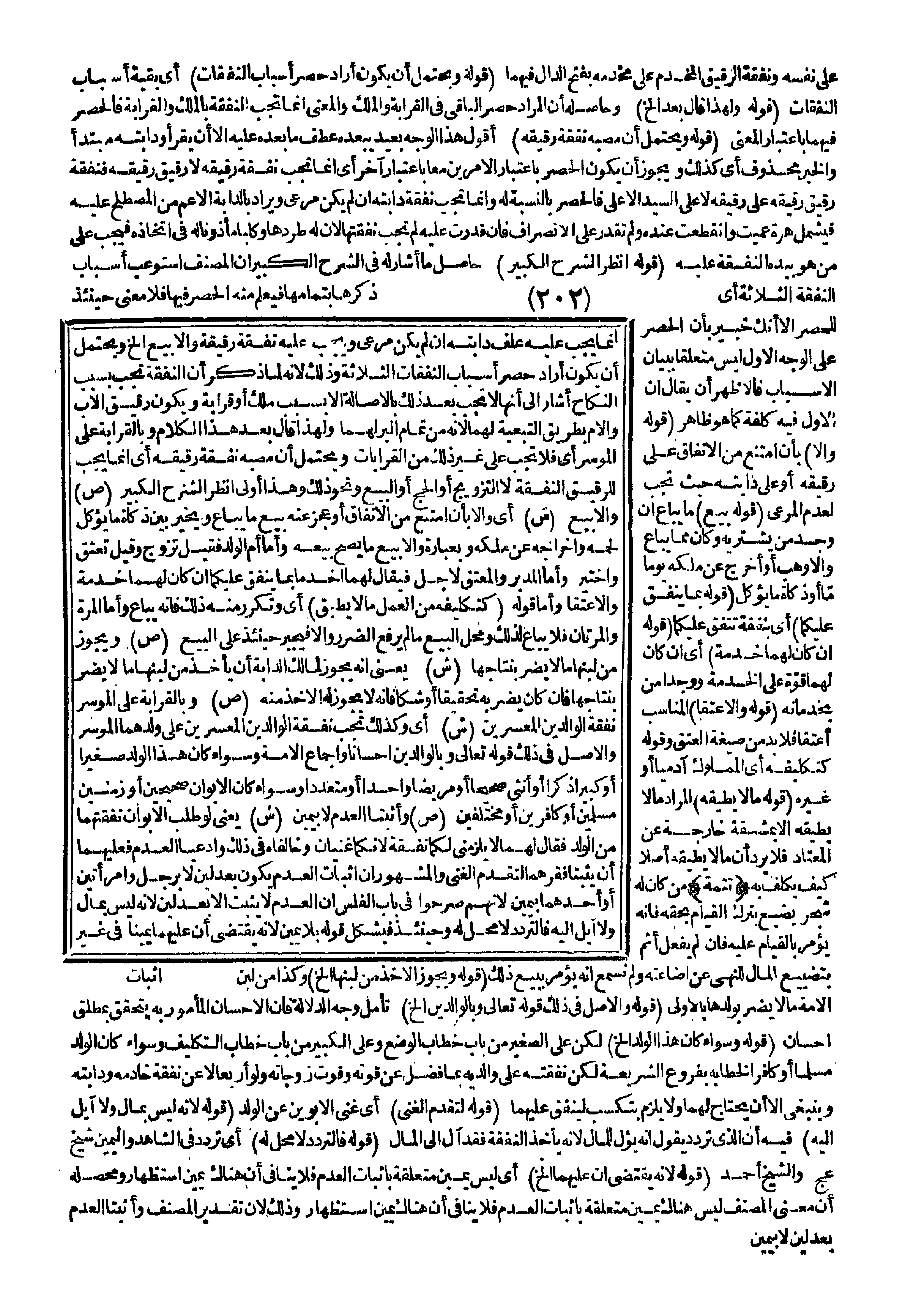 (قَوْلُهُ اُنْظُرْ الشَّرْحَ الْكَبِيرَ) حَاصِلُ مَا أَشَارَ لَهُ فِي الشَّرْحِ الْكَبِيرِ أَنَّ الْمُصَنِّفَ اسْتَوْعَبَ أَسْبَابَ النَّفَقَةِ الثَّلَاثَةِ أَيْ ذَكَرَهَا بِتَمَامِهَا فَيُعْلَمُ مِنْهُ الْحَصْرُ فِيهَا فَلَا مَعْنَى حِينَئِذٍ لِلْحَصْرِ إلَّا أَنَّك خَبِيرٌ بِأَنَّ الْحَصْرَ عَلَى الْوَجْهِ الْأَوَّلِ لَيْسَ مُتَعَلِّقًا بِبَيَانِ الْأَسْبَابِ فَالْأَظْهَرُ أَنْ يُقَالَ إنَّ الْأَوَّلَ فِيهِ كُلْفَةٌ كَمَا هُوَ ظَاهِرٌ