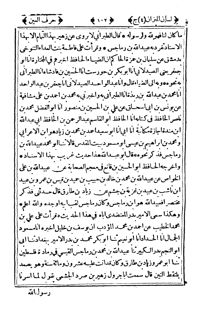 ما كان لنا فهو لله ولرسوله قال الطبراني لا يروي عن زهير بهذا التمام إلا بهذا الإسناد تفرد به عبيد الله بن رماجس وقرأت على فاطمة بنت العداء التنوخي بدمشق عن سليمان بن حمزة الحاكم أن الضياء الحافظ أخبرهم في المختارة أنا أبو جعفر يعني الصيدلاني أنا أبو بكر بن حورست أنا الحسين بن فادشاه أنا الطبراني به نحوه وبه إلى الضياء قال وأنا عبد الواحد الصيدلاني أنا جعفر بن عبد الواحد أنا محمد بن عبد الله ابن ربذة أنا الطبراني به أخبرني به محمد بن أحمد بن علي مشافهة عن يونس بن أبي إسحاق عن علي بن الحسين بن منصور أنا أبو الفضل محمد بن ناصر الحافظ في كتابه أنا الحافظ أبو القاسم عبد الرحمن بن الحافظ أبي عبد الله ابن مندة إجازة مكاتبة أنا أبي أنا أبو سعيد أحمد بن محمد بن زياد هو ابن الأعرابي ومحمد بن إبراهيم بن عيسى أبو مسعود ببيت المقدس قالا ثنا أبو محمد عبيد الله ابن رماجس فذكر نحوه قال أبو عبد الله هذا حديث غريب بهذا الإسناد وأخرجه الحافظ أبو الحسين بن قانع في معجم الصحابة عن عبيد الله ابن علي الخواص عن عبيد الله ابن محمد بن خالد بن حبيب بن حميد بن قيس ابن عمرو بن عبيد بن ناشب بن عبيد بن غزية بن جشم عن زياد بن طارق قال حدثني فذكر مختصرا فعبيد الله هو ابن رماجس وكان رماجس لقب أبيه أو جده والله أعلم وهكذا سمى الأمير بدر المعتضدي أباه في هذا الحديث قرأت على علي بن محمد الخطيب عن أحمد بن محمد المؤدب أن يوسف بن خليل أخبره أنا مسعود الجمال أنا الحداد أنا أبو نعيم ثنا أبو بكر محمد بن بدر الأمير ببغداد ثنا أبي أبو النجم بدر الكبير ثنا عبيد الله ابن محمد بن رماجس القيس في رمادة فلسطين ثنا أبو عمرو زياد بن طارق وكان قد أتت عليه عشرون ومائة سنة وهو يصعد يلتقط التين قال سمعت أبا جرول زهير بن صرد الجشمي يقول لما أسرنا