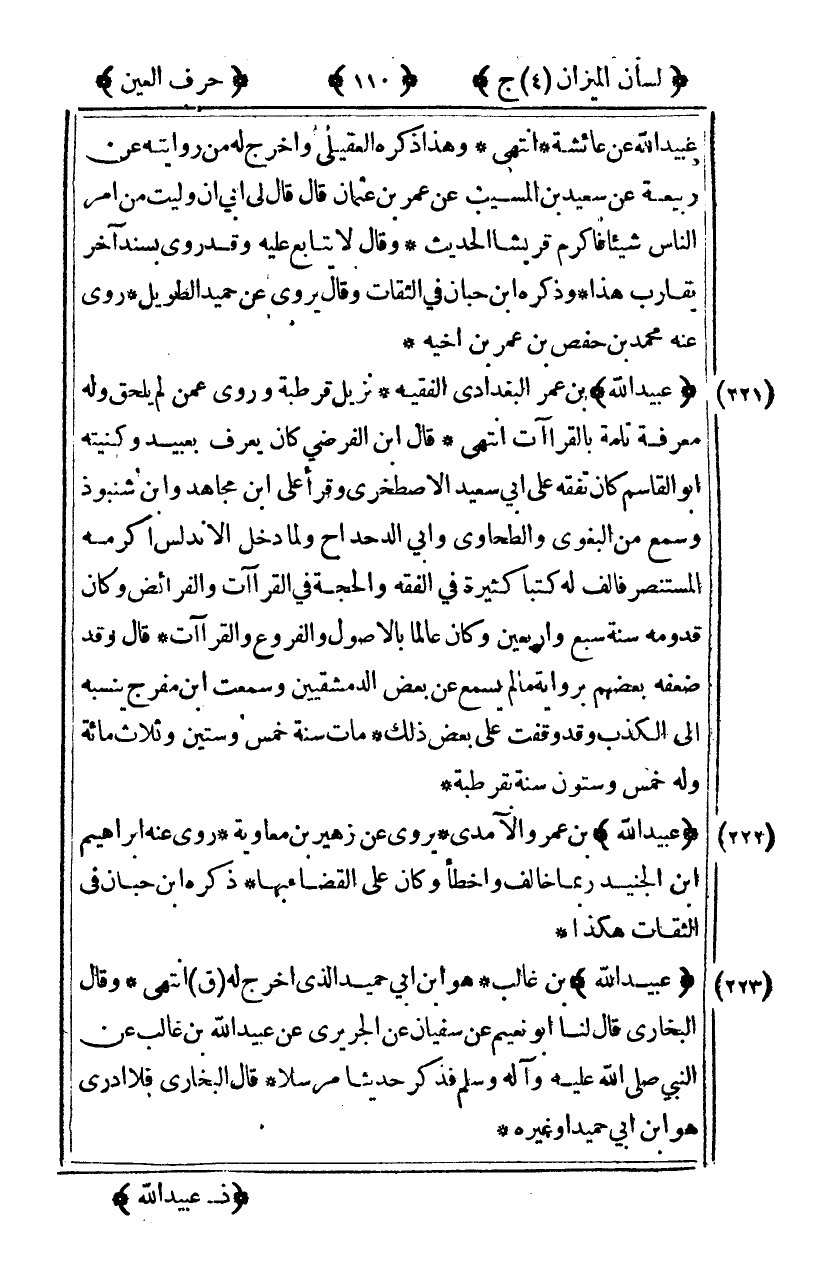 [222] "عبيد الله" بن عمرو الأمدي يروي عن زهير بن معاوية روى عنه إبراهيم ابن الجنيد ربما خالف وأخطأ وكان على القضاء بها ذكره ابن حبان في الثقات هكذا.
