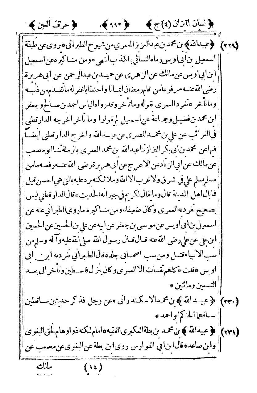 [231] "عبيد الله" ابن محمد بن بطة العكبري الفقيه إمام لكنه ذو أوهام لحق البغوي وابن صاعد قال ابن أبي الفوارس روى ابن بطة عن البغوي عن مصعب عن