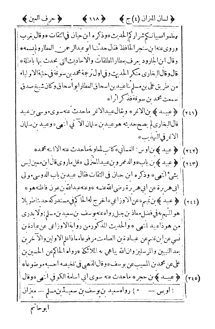 [245] "عبيد" بن حجر ما حدث عنه سوى أبي أسامة الكوفي انتهى وقال