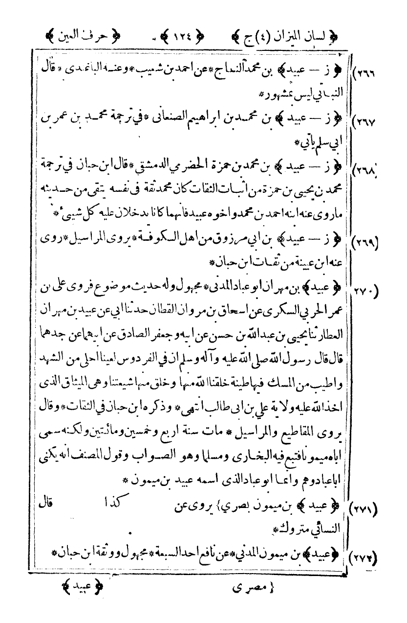 [268] "زعبيد" بن محمد بن حمزة الحضرمي الدمشقي قال ابن حبان في ترجمة محمد بن يحيى بن حمزة من اثبات الثقات كان محمد ثقة في نفسه يتقى من حديثه ما روى عنه أخوه أحمد بن محمد وأخوه عبيد فإنهما كانا يدخلان عليه كل شيء.