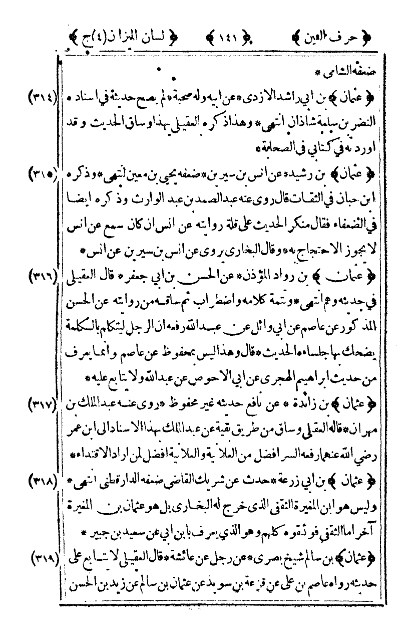 [315] "عثمان" بن رشيد عن أنس بن سيرين ضعفه يحيى بن معني انتهى وذكره ابن حبان في الثقات قال روى عنه عبد الصمد بن عبد الوارث وذكره أيضا في الضعفاء فقال منكر الحديث على قلة روايته عن أنس أن كان سمع عن أنس لا يجوز الإحتجاج به وقال البخاري يروي عن أنس بن سيرين عن أنس.