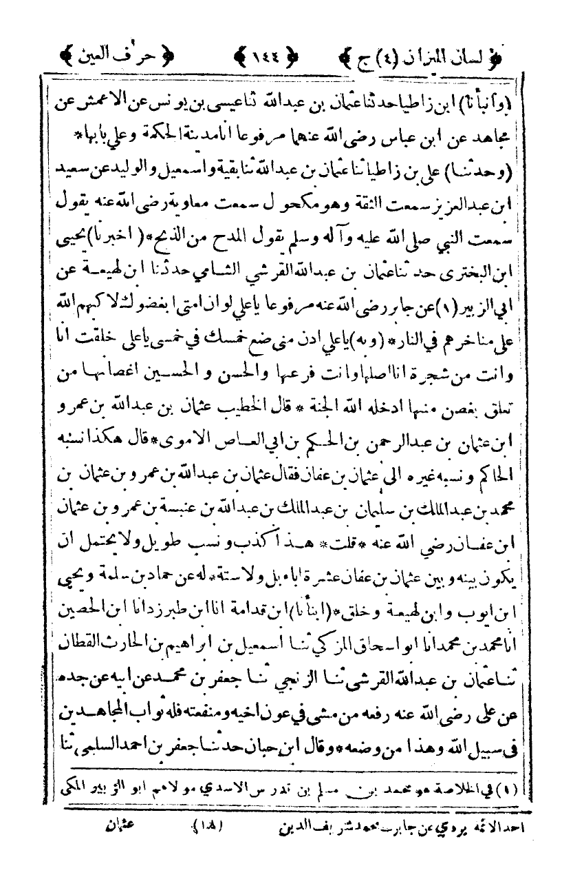 وحدثنا علي بن زاطيا ثنا عثمان بن عبد الله ثنا بقية وإسمعيل والوليد عن سعيد ابن عبد العزيز سمعت الثقة وهو مكحول سمعت معاوية رضي الله عنه يقول سمعت النبي صلى الله عليه وآله وسلم يقول: "المدح من الذبح" [أخبرنا] يحيى بن البختري حدثنا عثمان بن عبد الله القرشي الشامي حدثنا ابن لهيعة عن أبي الزبير1 عن جابر رضي الله عنه مرفوعا يا علي لو أن أمتي ابغضوك لاكبهم الله على مناخرهم في النار [وبه] يا علي ادن من يضع خمسك في خمسي يا علي خلقت أنا وأنت من شجره أنا أصلها وأنت فرعها والحسن والحسين أغصانهم من تعلق بغصن منها أدخله الله الجنة قال الخطيب عثمان بن عبد الله بن عمرو بن عثمان بن عبد الرحمن بن الحكم بن أبي العاص الأموي قال هكذا نسبه الحاكم ونسبه غيره إلى عثمان بن عفان فقال عثمان بن عبد الله ابن عمرو بن عثمان بن محمد بن عبد الملك بن سليمان بن عبد الملك بن عبد الله ابن عنبسة ابن عمرو بن عثمان بن عفان رضي الله عنه قلت هذا كذب ونسب طويل ولا يحتمل أن يكون بينه وبين عثمان بن عفان عشرة آباء بل ولا ستة له عن حماد بن سلمة ويحيى بن أيوب وابن لهيعة وخلق [أنبأنا] بن قدامة أنا بن طبرزد أنا ابن الحصين أنا محمد بن ممد أنا أبو إسحاق المزكي ثنا إسمعيل بن إبراهيم بن الحارث القطان ثنا عثمان بن عبد الله القرشي ثنا الزنجي ثنا جعفر بن محمد عن أبيه عن جده عن علي رضي الله عنه رفعه من مشى في عون أخيه ومنفعته فله ثواب المجاهدين في سبيل الله وهذا من وضعه وقال ابن حبان حدثنا جعفر بن أحمد السلمي ثنا.