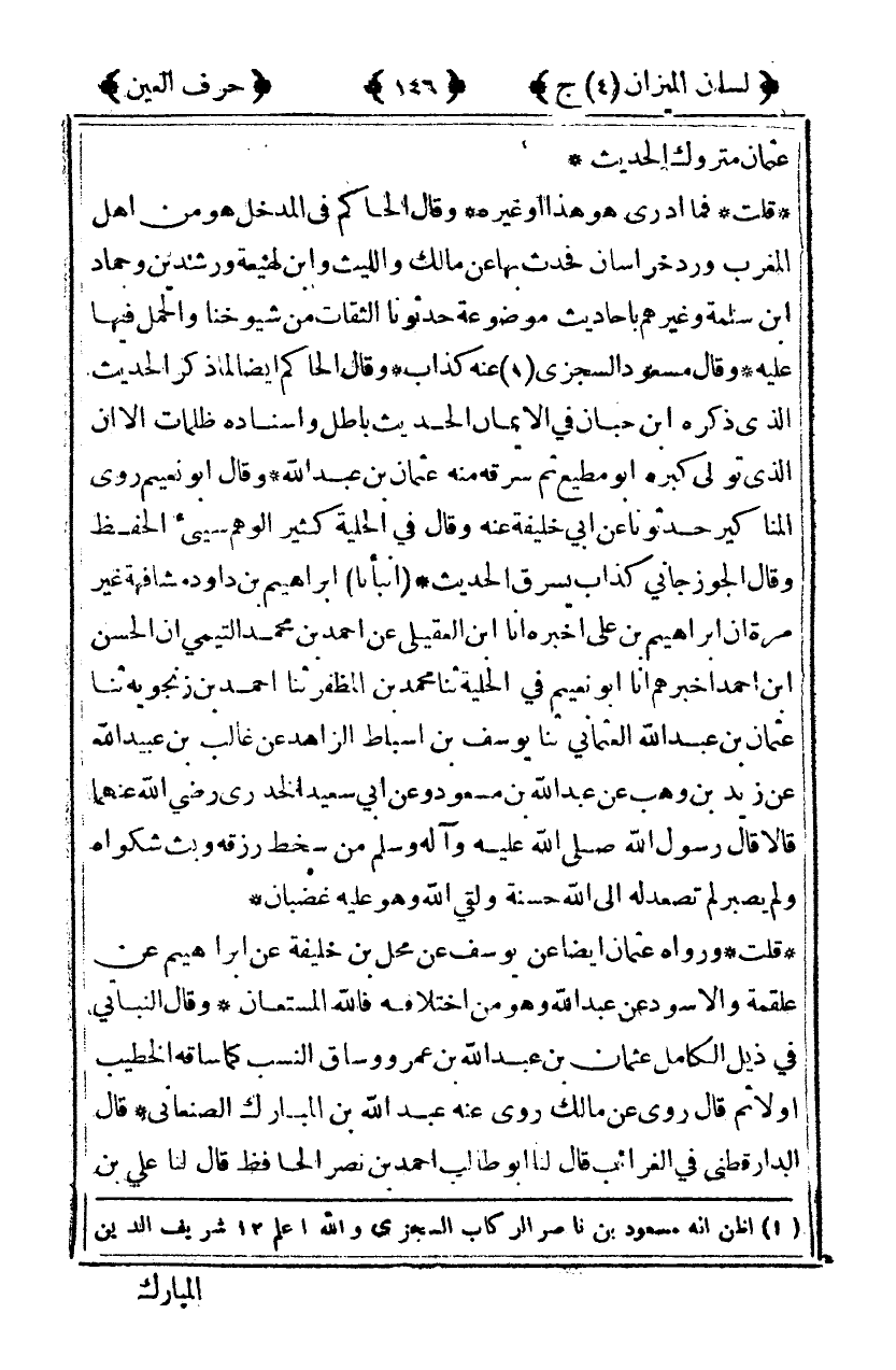 قلت ورواه عثمان أيضا عن يوسف عن محل بن خليفة عن إبراهيم عن علقمة والأسود عن عبد الله وهو من اختلافه فالله المستعان وقال النباتي في ذيل الكامل عثمان بن عبد الله بن عمرو وساق النسب كما ساقه الخطيب أولا ثم قال روى عن مالك روى عن عبد الله ابن المبارك الصنعاني قال الدارقطني في الغرائب قال لنا أبو طالب أحمد بن نصر الحافظ قال لنا علي بن